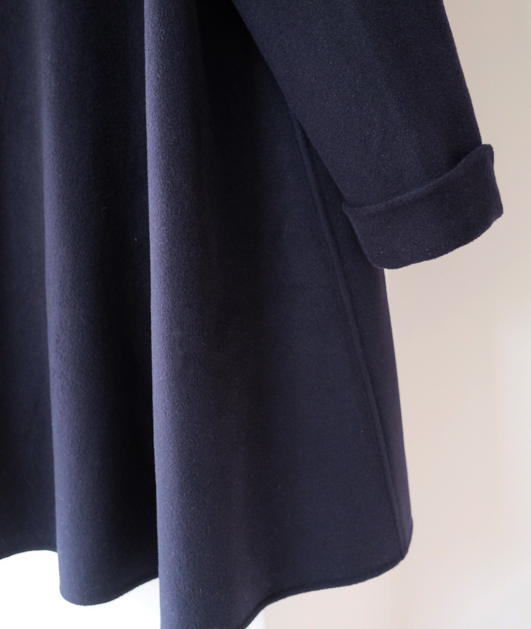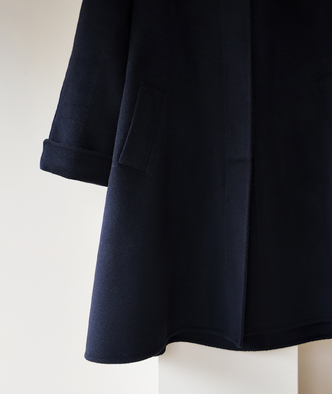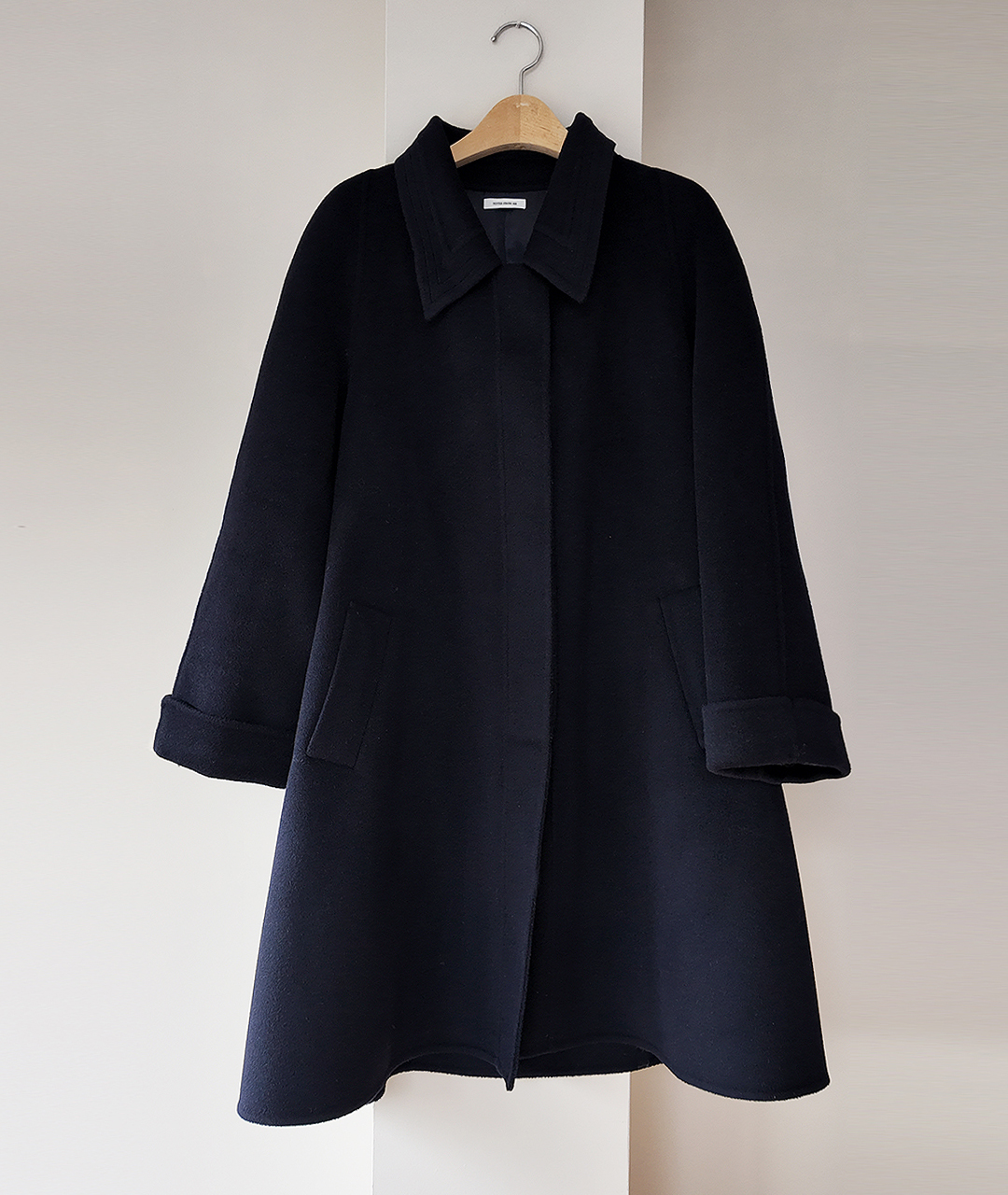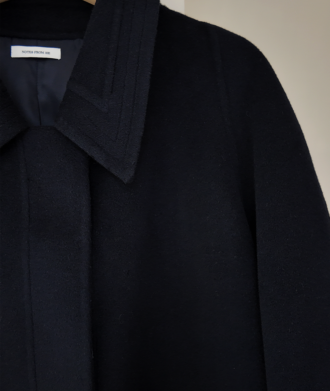 딥한 네이비 컬러의 미드 기장 핸드메이드 코트입니다. 캐시미어 혼방 소재로 부드러운 촉감과 고급스러움을 더했습니다.