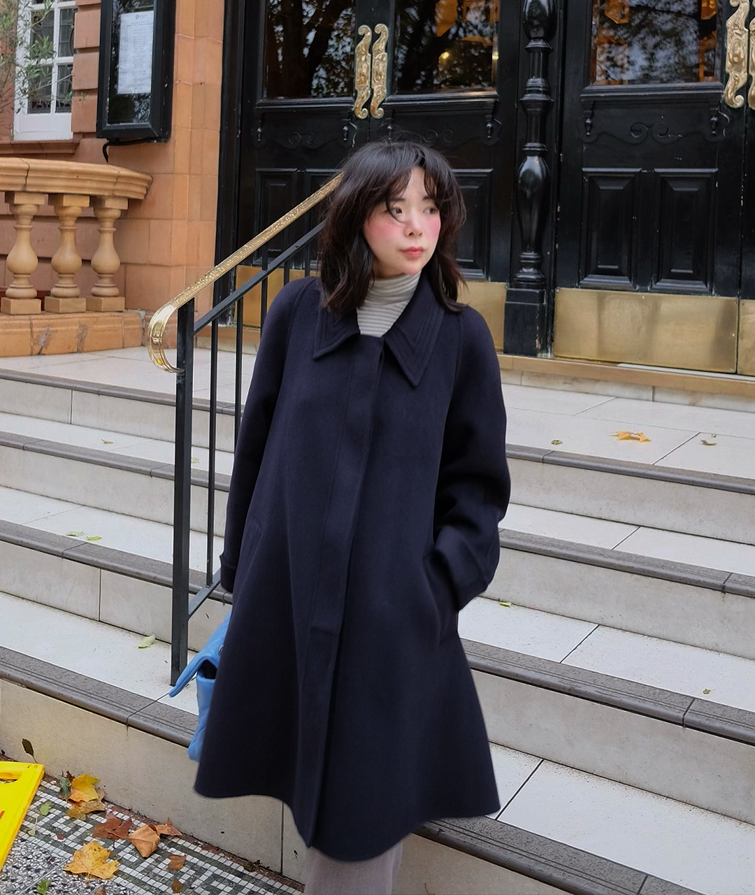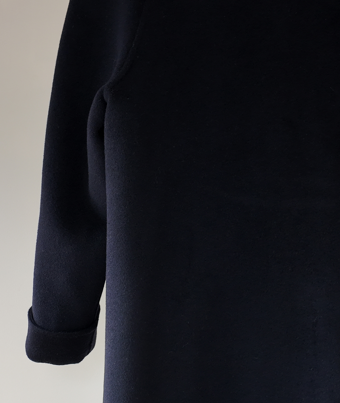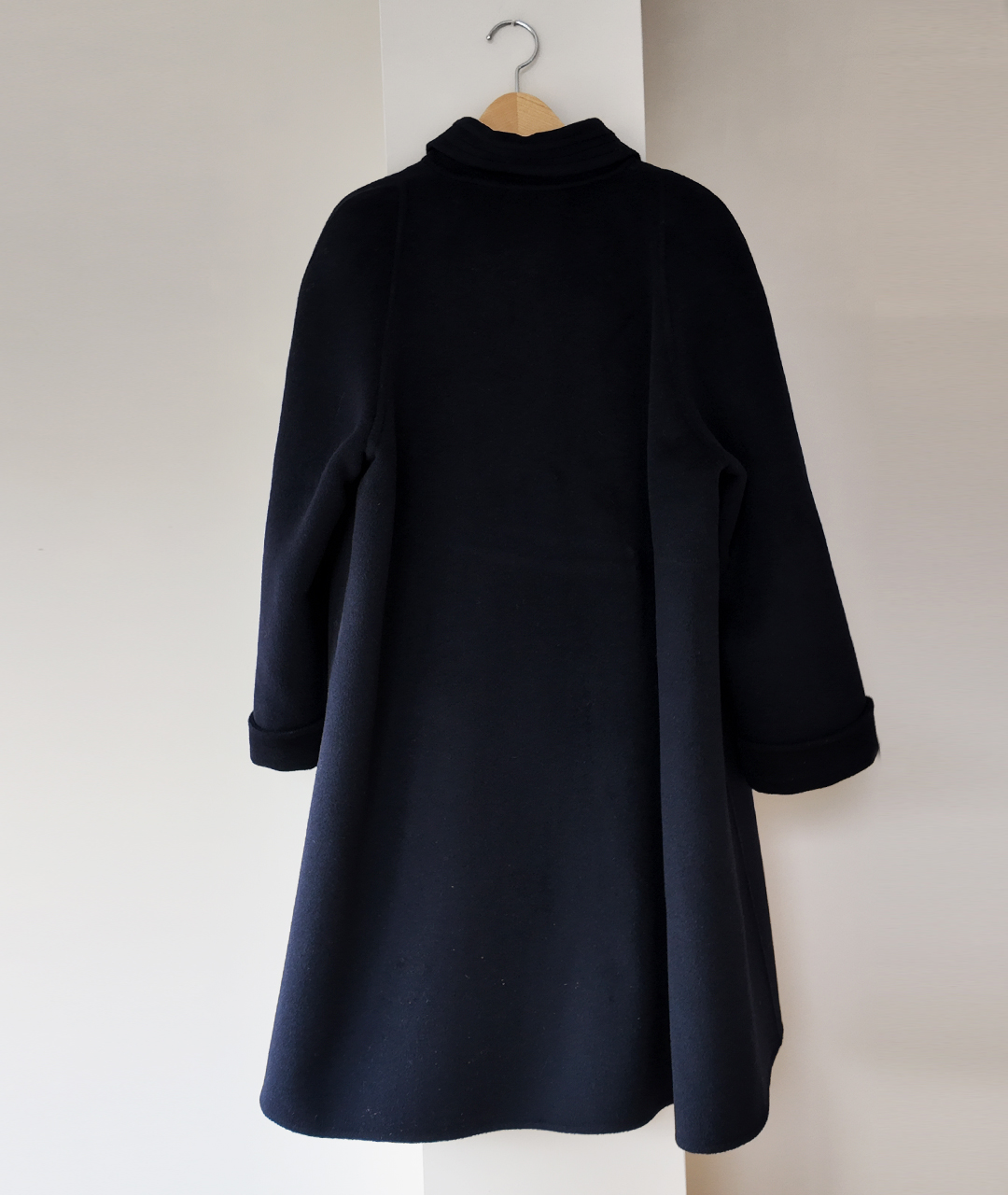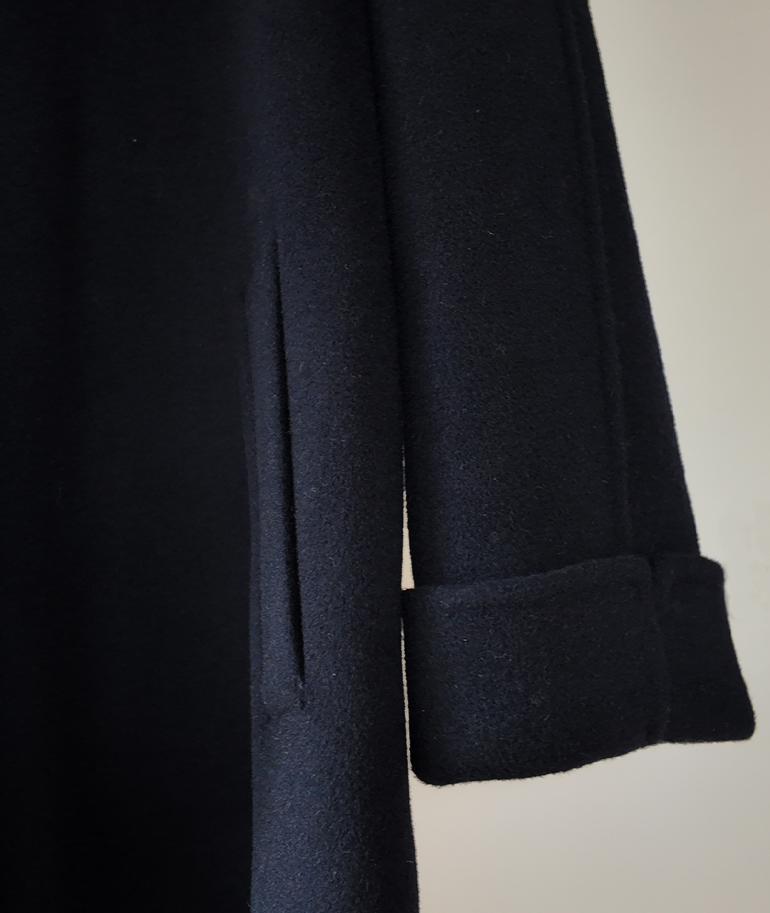 딥한 네이비 컬러의 미드 기장 핸드메이드 코트입니다. 캐시미어 혼방 소재로 부드러운 촉감과 고급스러움을 더했습니다.