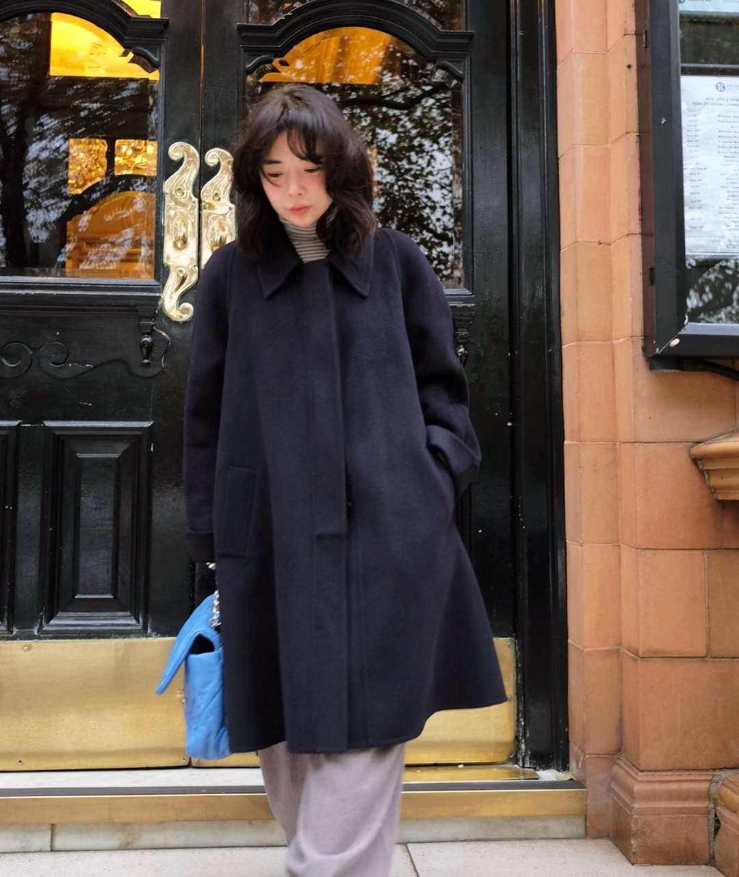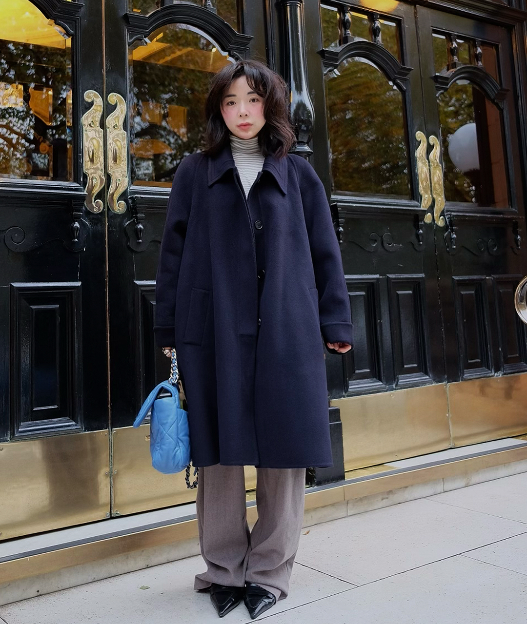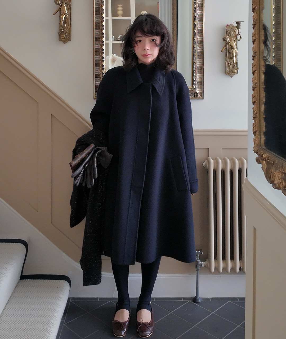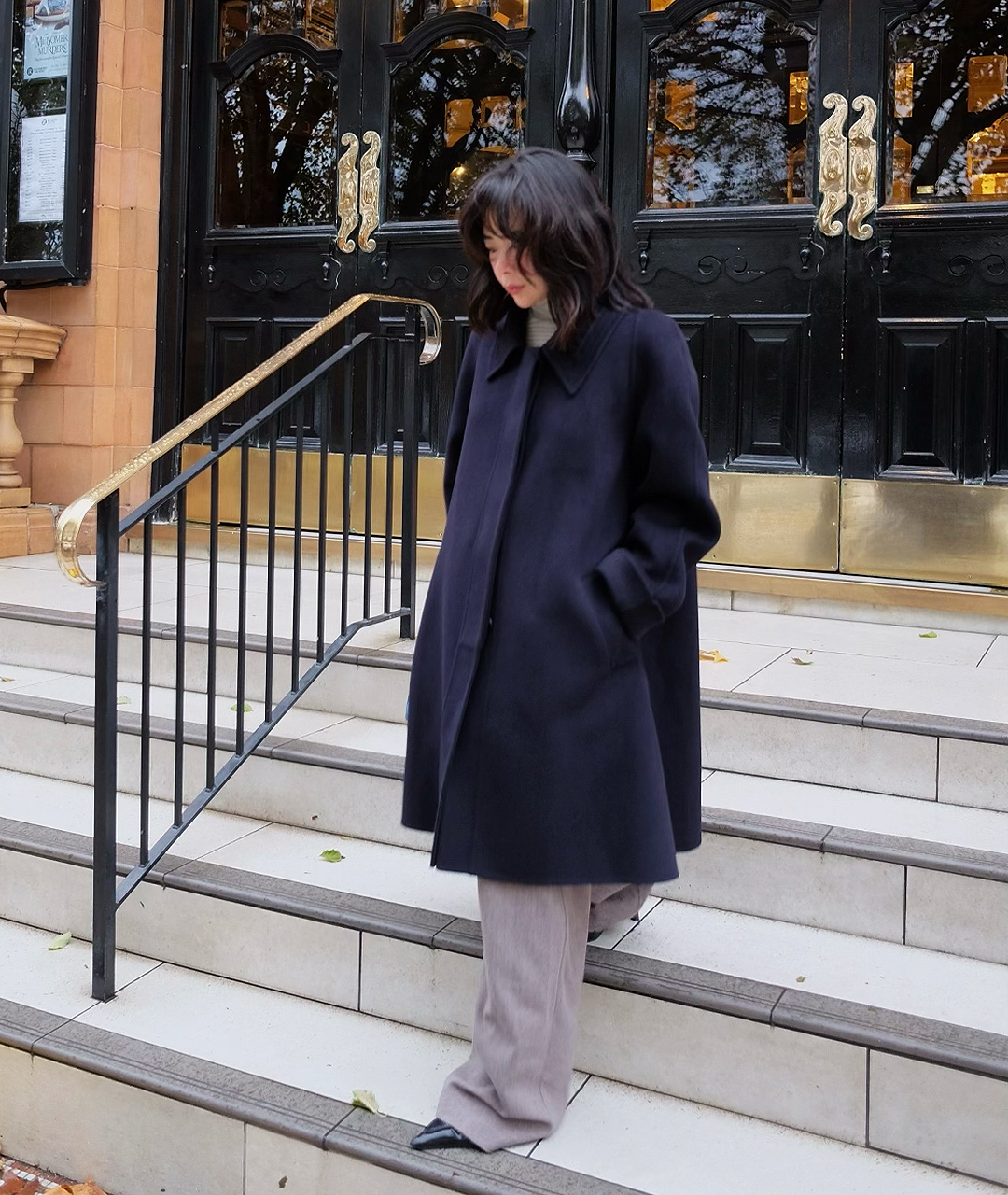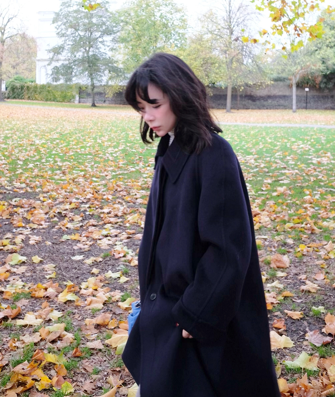 딥한 네이비 컬러의 미드 기장 핸드메이드 코트입니다. 캐시미어 혼방 소재로 부드러운 촉감과 고급스러움을 더했습니다.