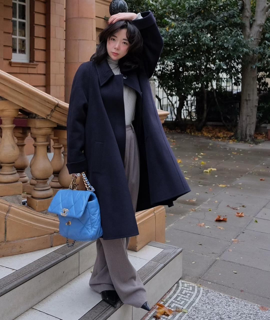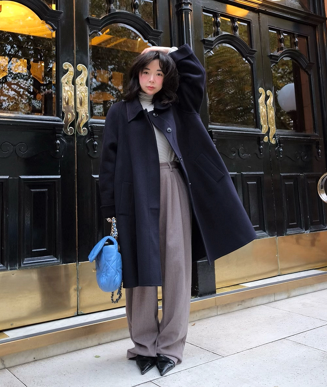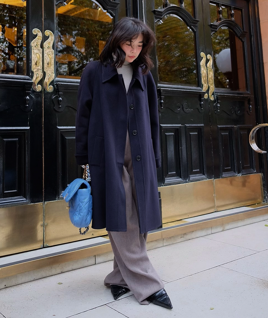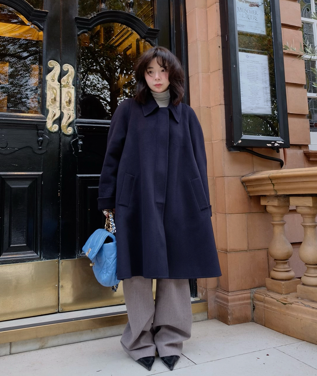 딥한 네이비 컬러의 미드 기장 핸드메이드 코트입니다. 캐시미어 혼방 소재로 부드러운 촉감과 고급스러움을 더했습니다.