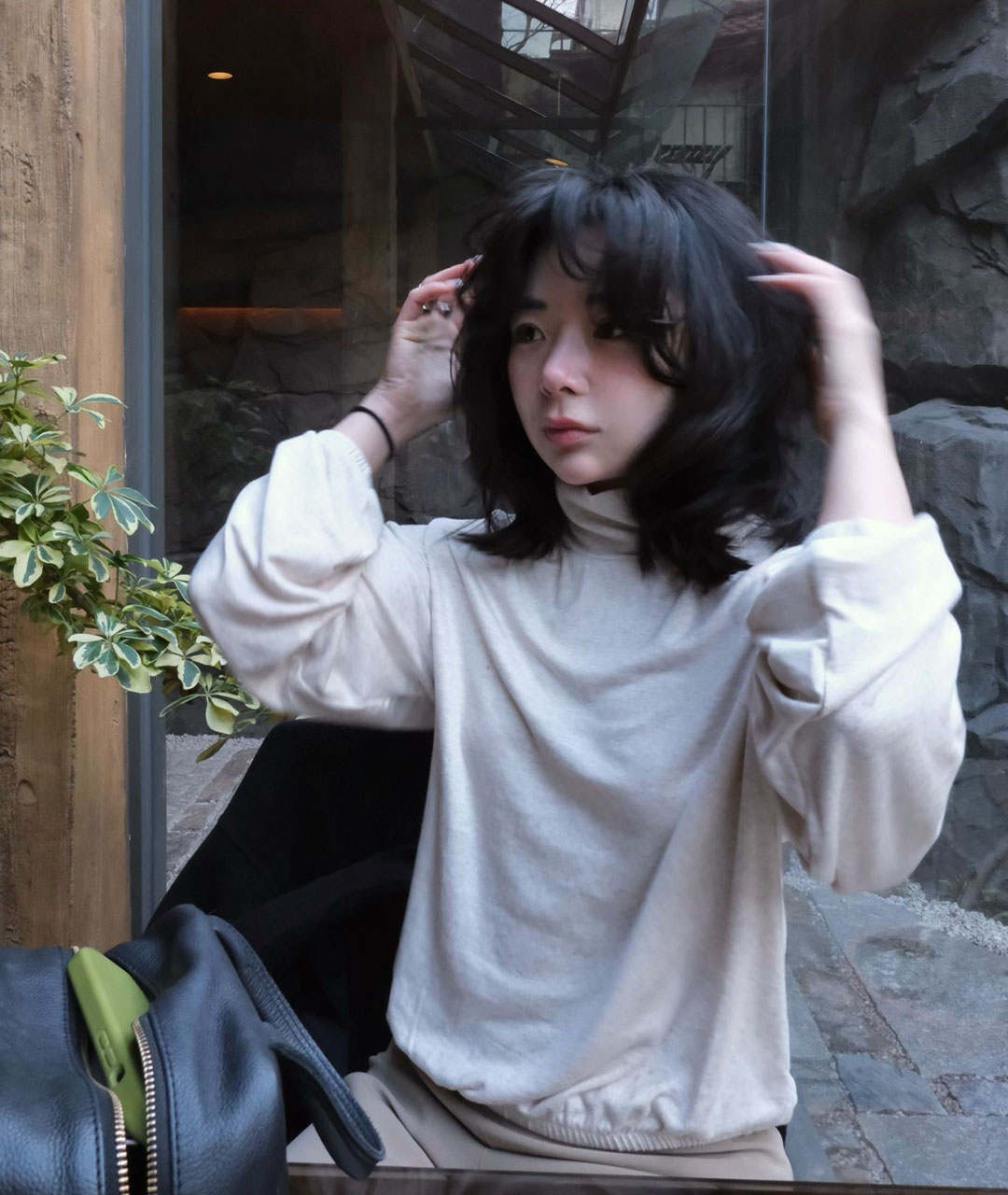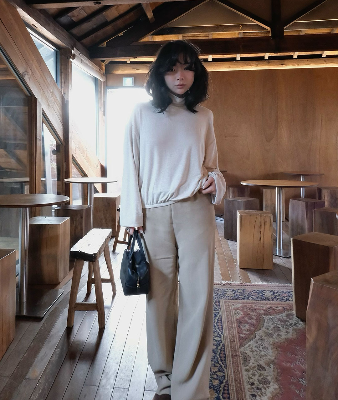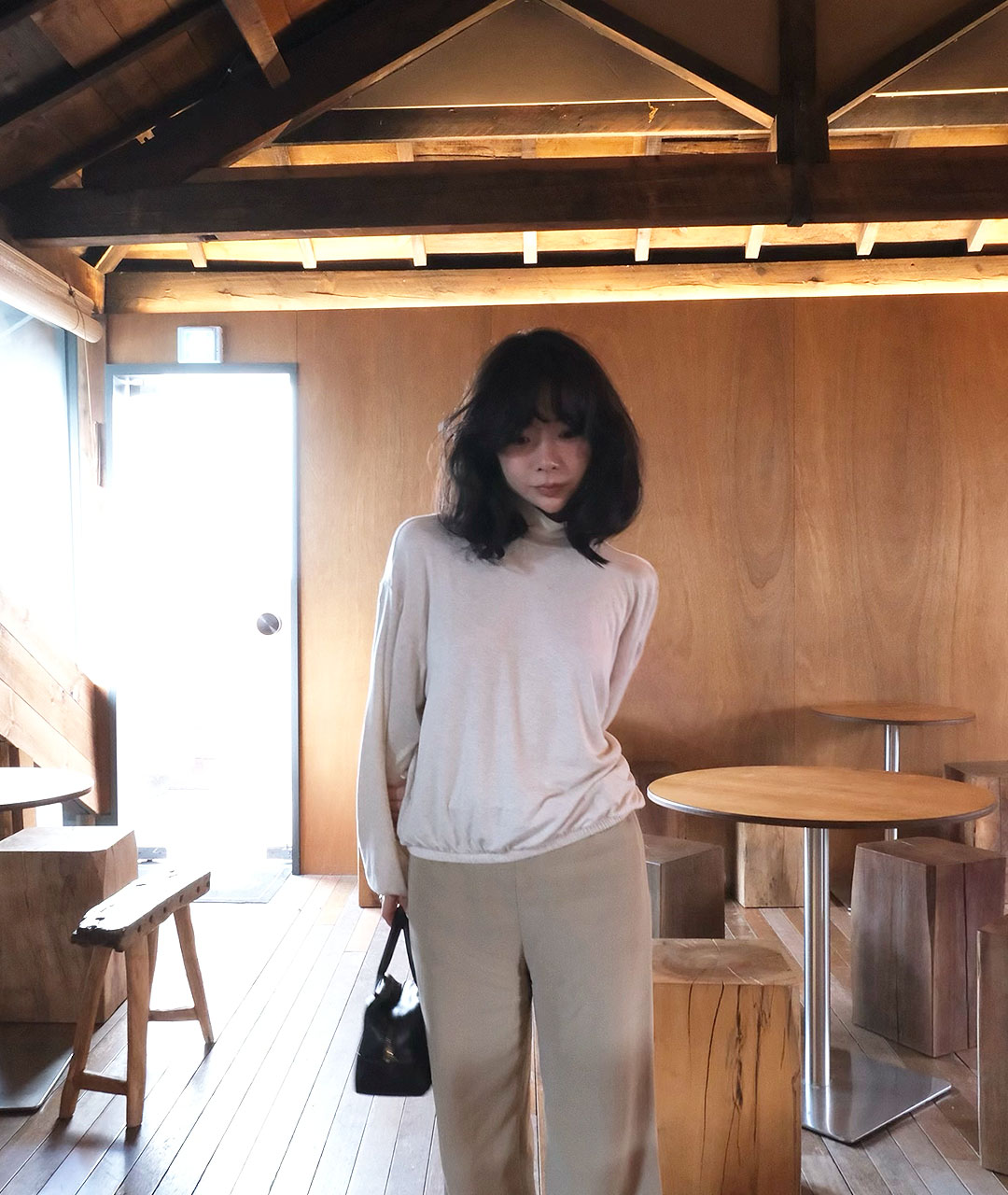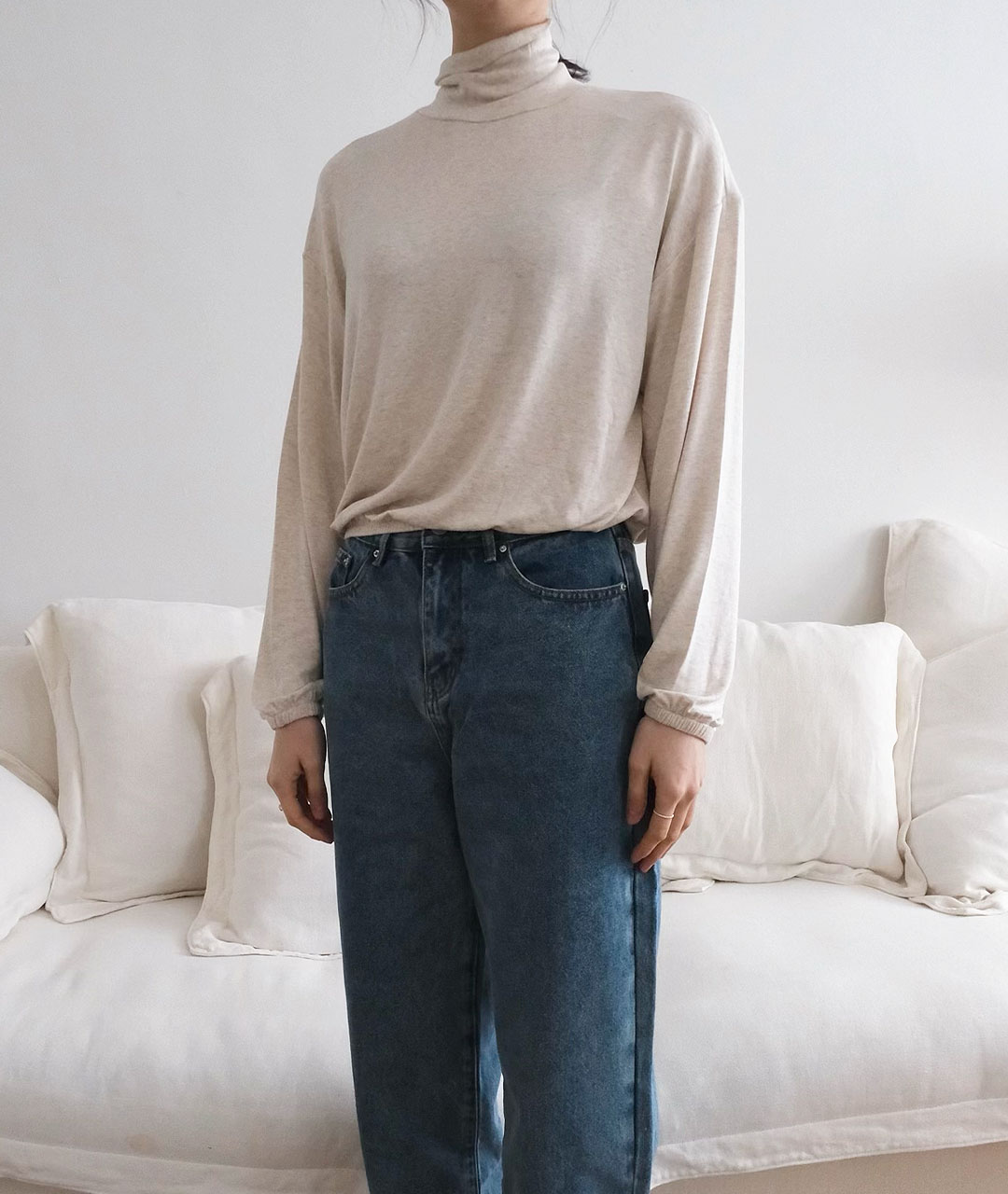 폴라티에서 어깨선까지 자연스럽게 떨어지는 라인이 여성스러운 분위기로 착용하실 수 있습니다.