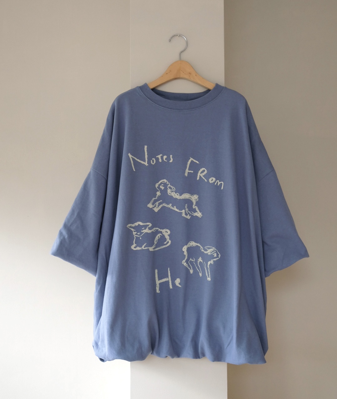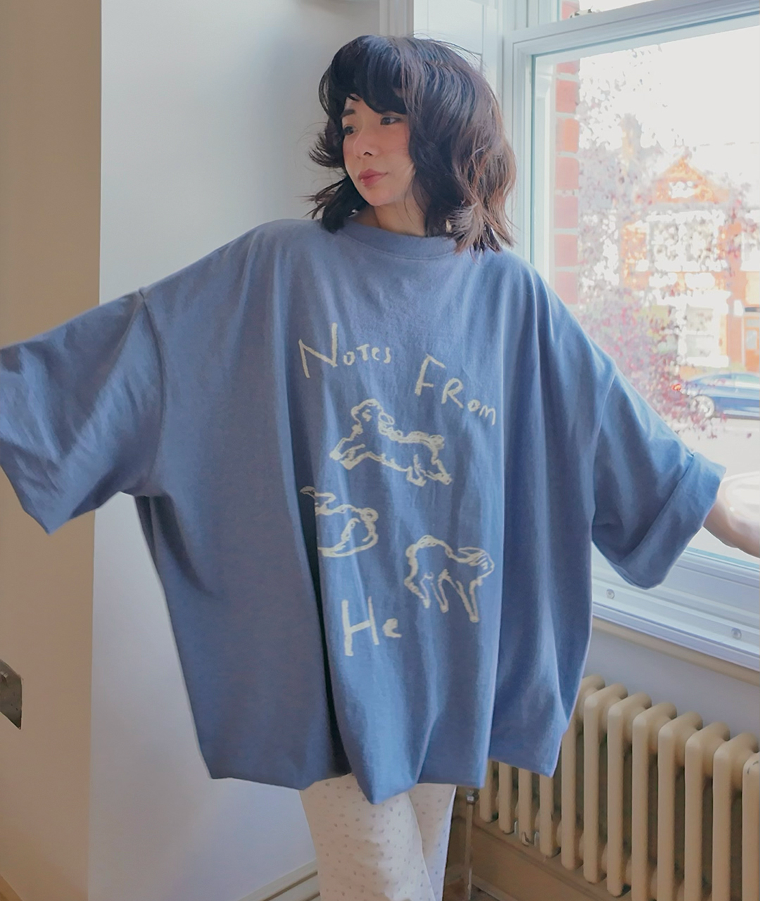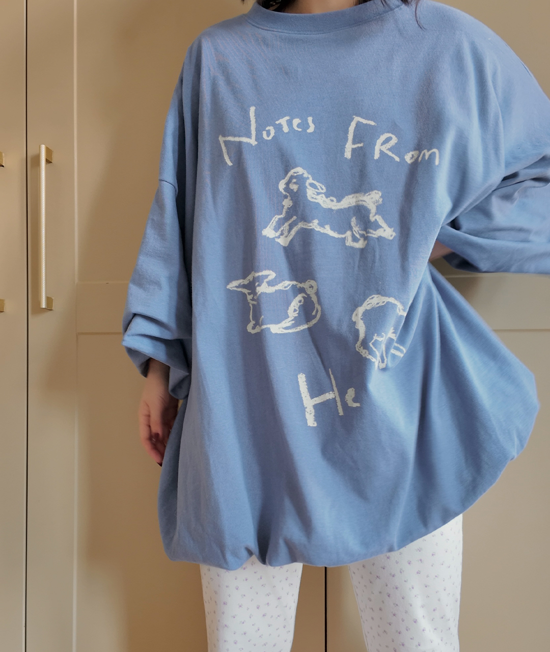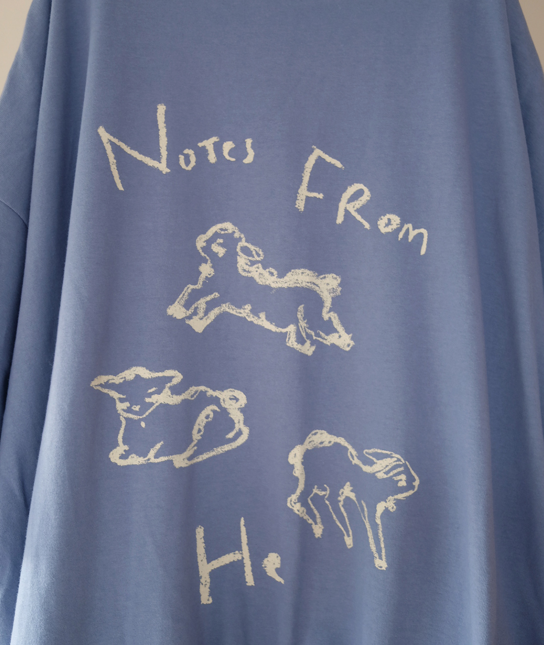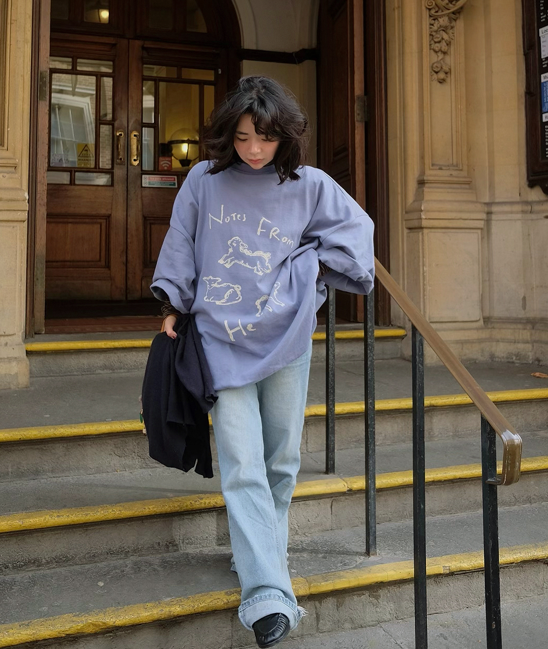 Notes from He의 시그니처 양 프린트는 빈티지한 크림 색감으로 더해져, 워싱된 느낌의 스트릿한 무드로 연출했습니다.