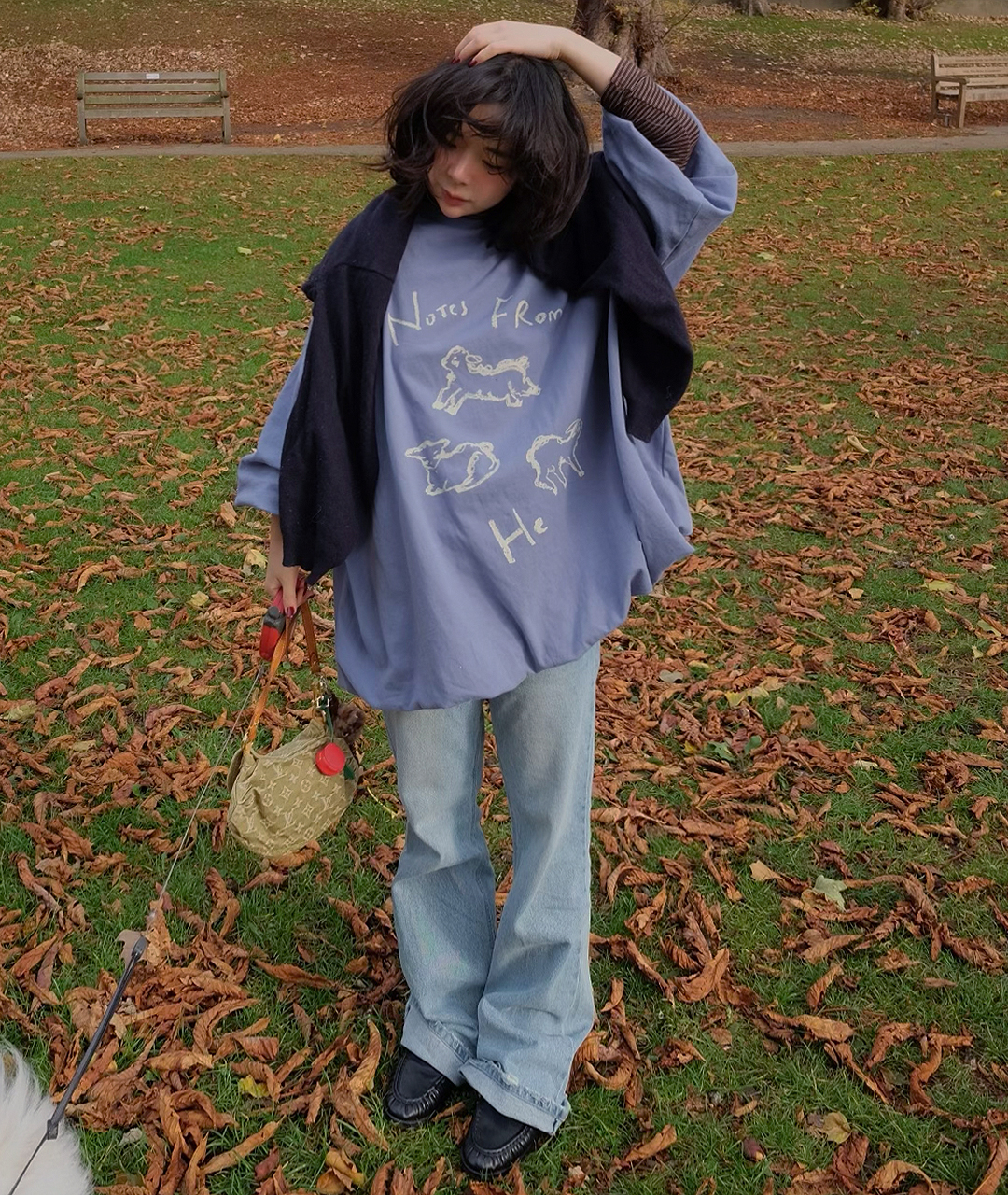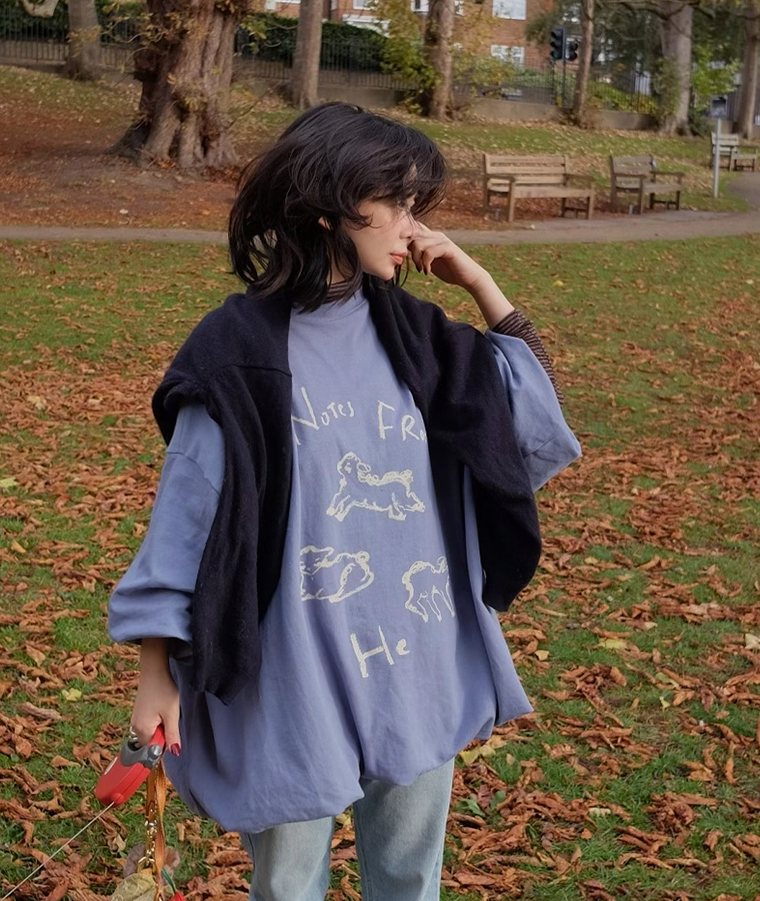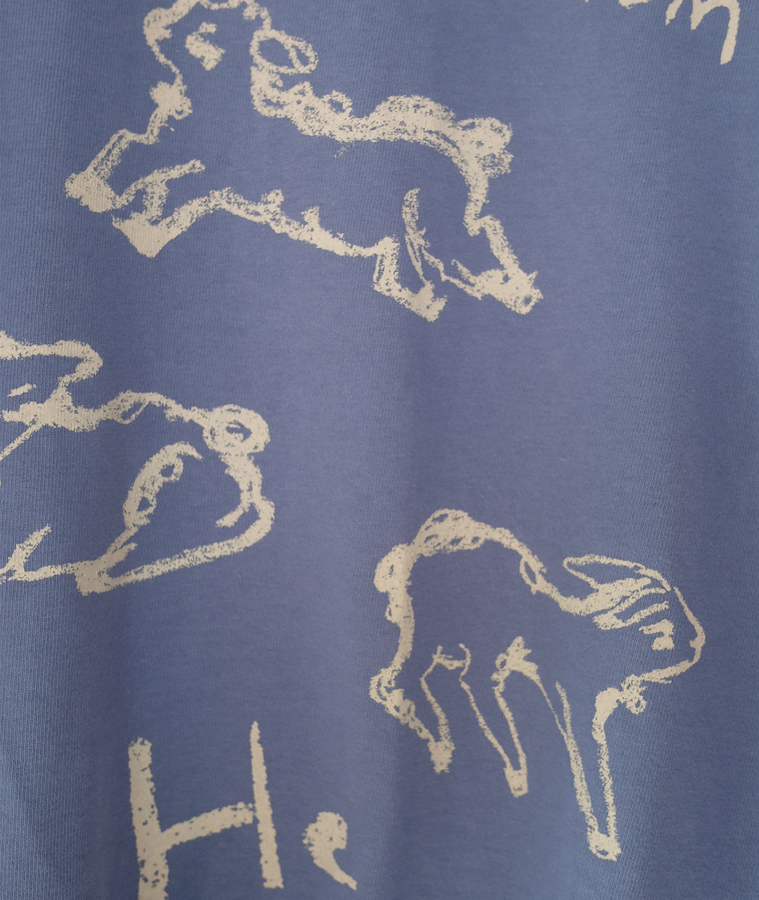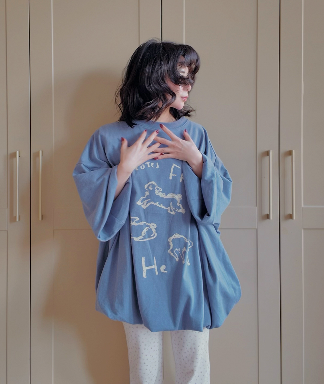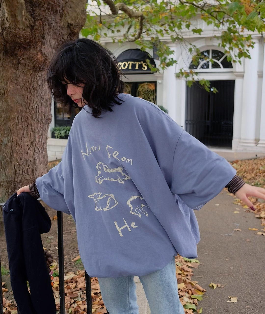Notes from He의 시그니처 양 프린트는 빈티지한 크림 색감으로 더해져, 워싱된 느낌의 스트릿한 무드로 연출했습니다.
