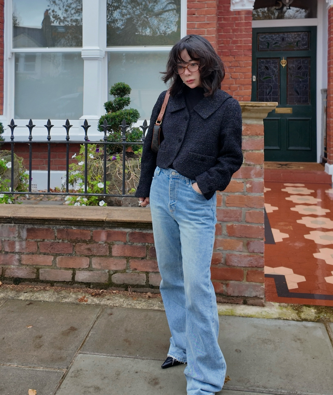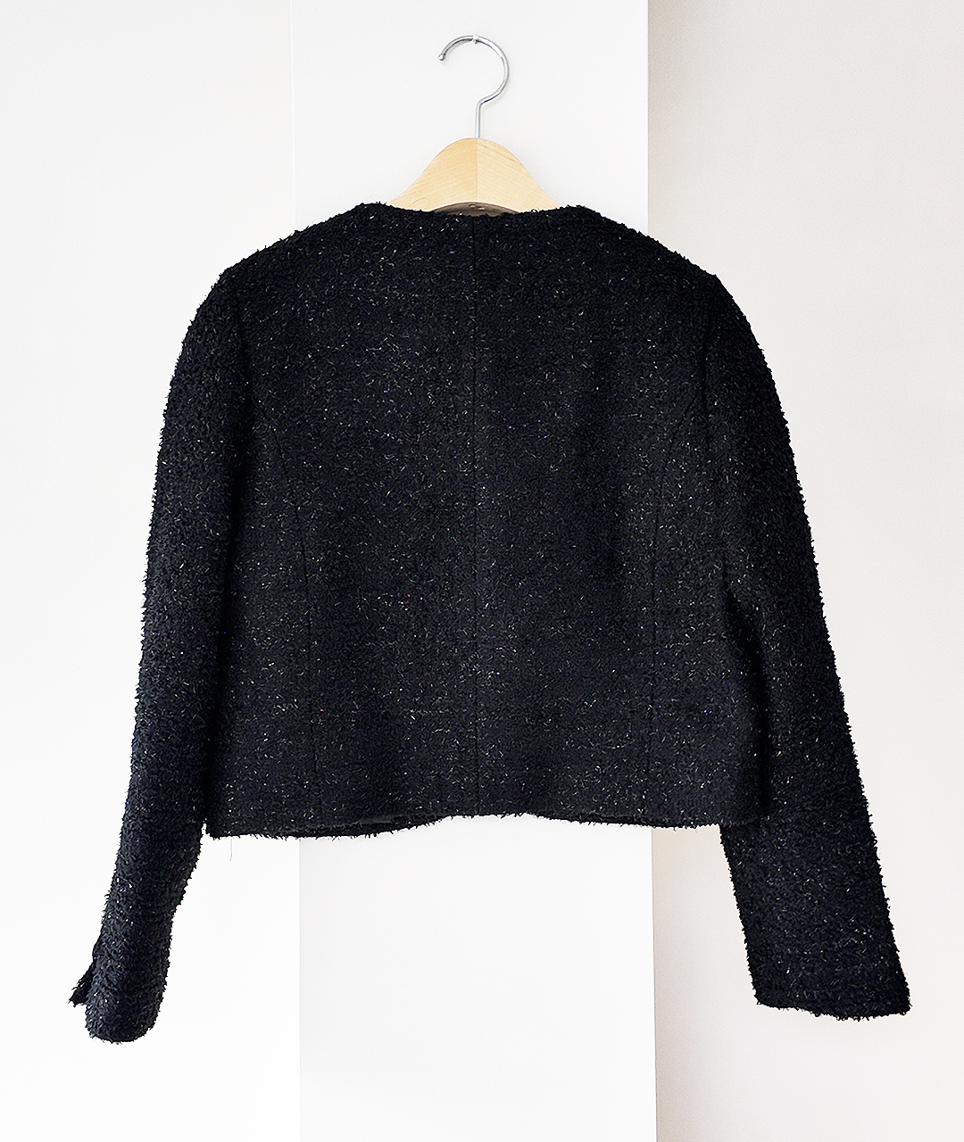 빛을 받으면 은은하게 반짝이는 실과 텍스처 실이 섞인 트위드 원사로 완성된 자켓입니다.