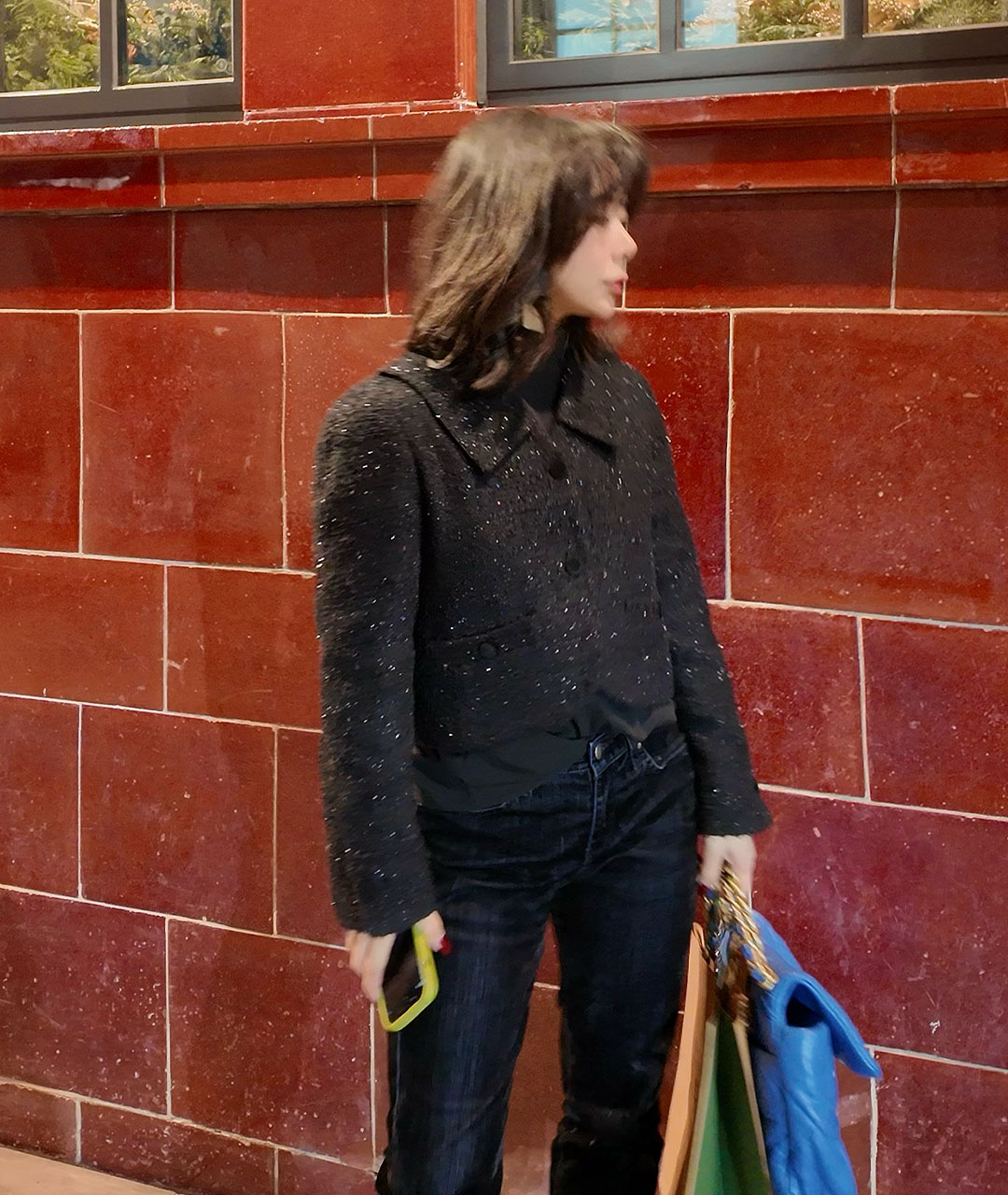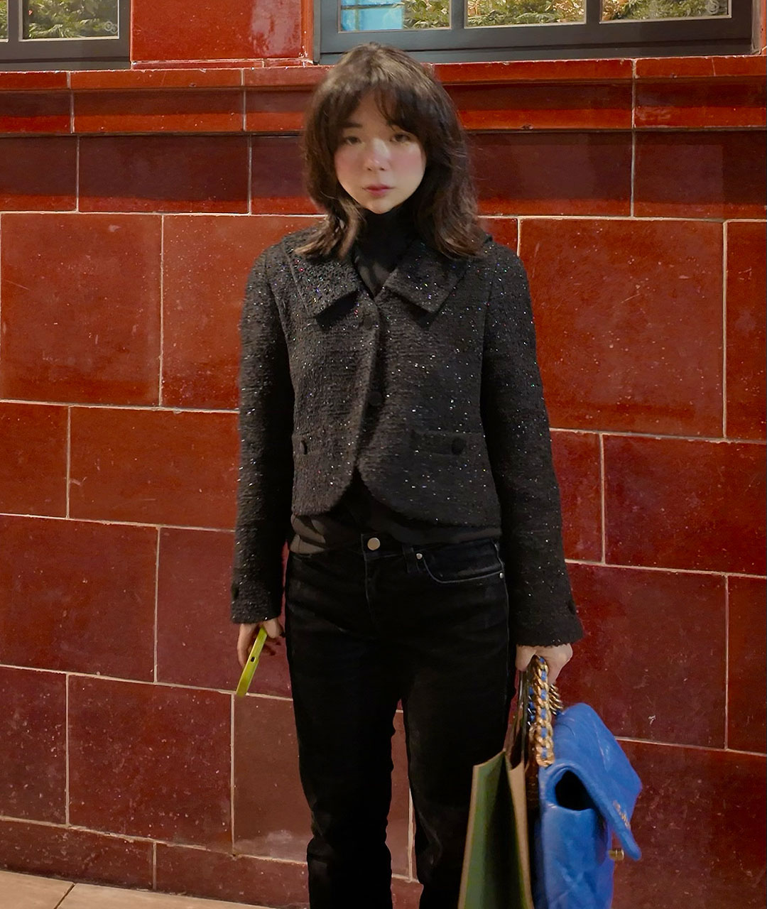 스파클 원사로 만들어진 트위드의 고급스러운 질감이 돋보이는 아이템으로, 12월 연말 시즌에 포인트 아우터로 착용하기 좋습니다.