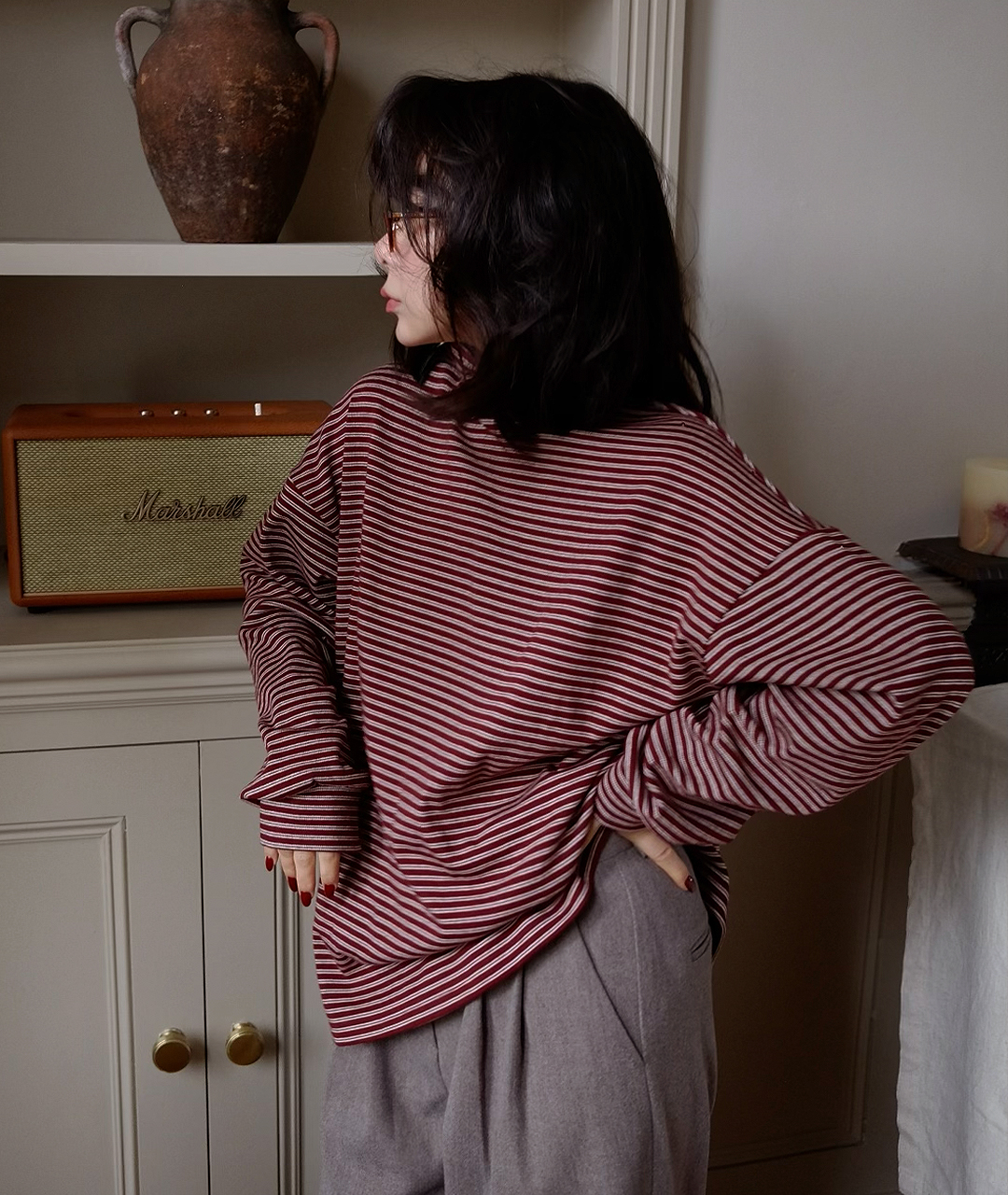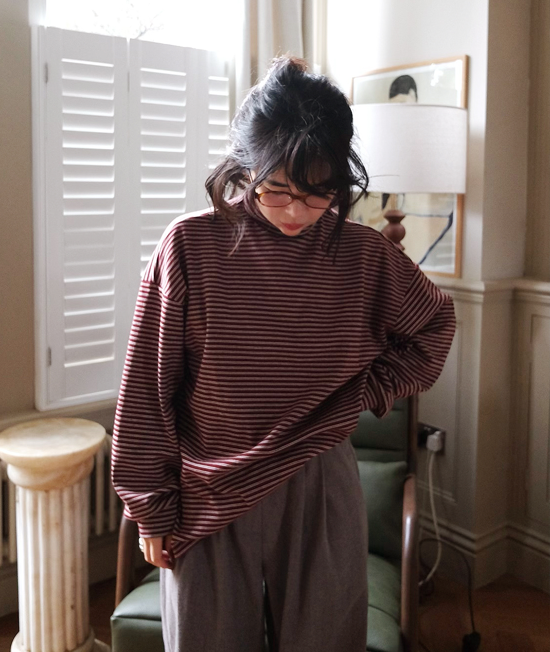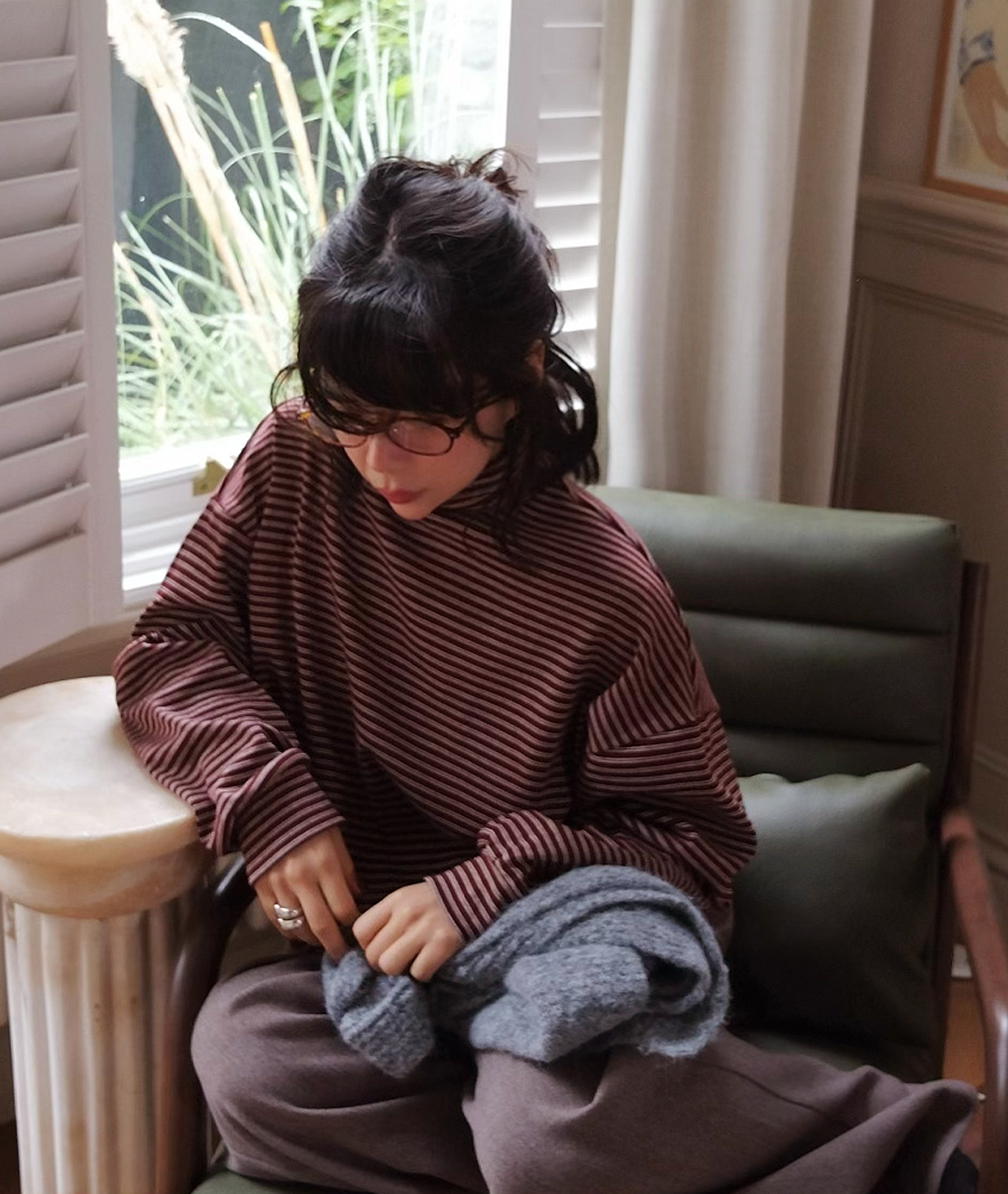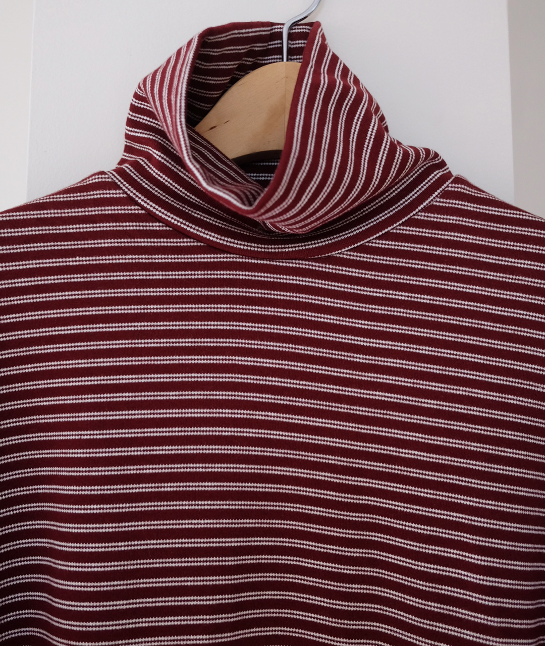 목을 감싸는 폴라 형태이지만 답답하지 않게 여유 있는 넥라인으로 디자인되었으며, 스트라이프 패턴이 포인트가 되어 이너로 착용했을 때도 멋스러운 포인트를 더해줍니다.
