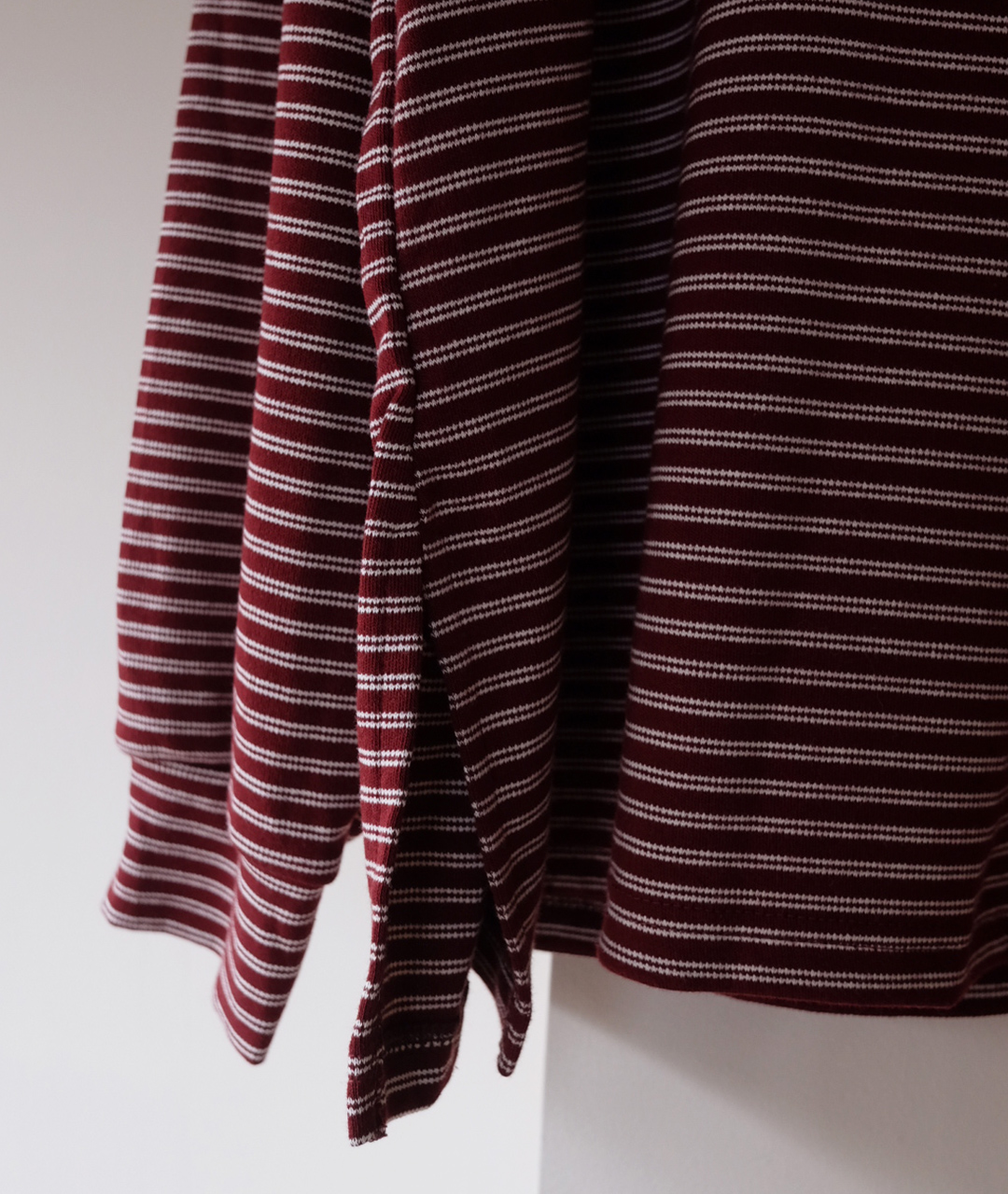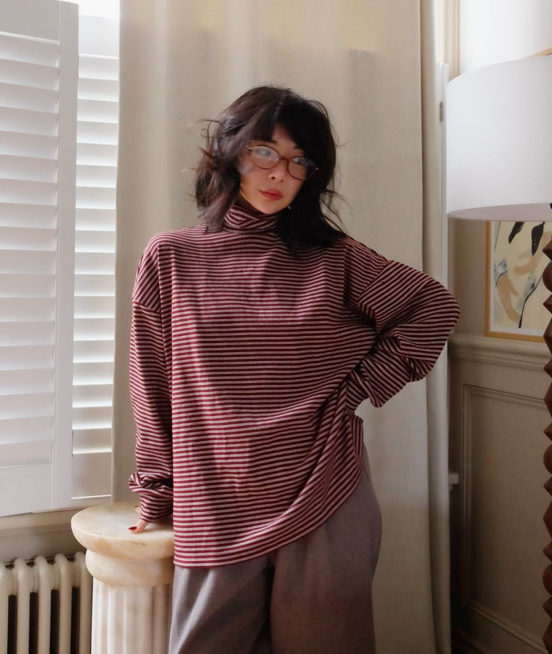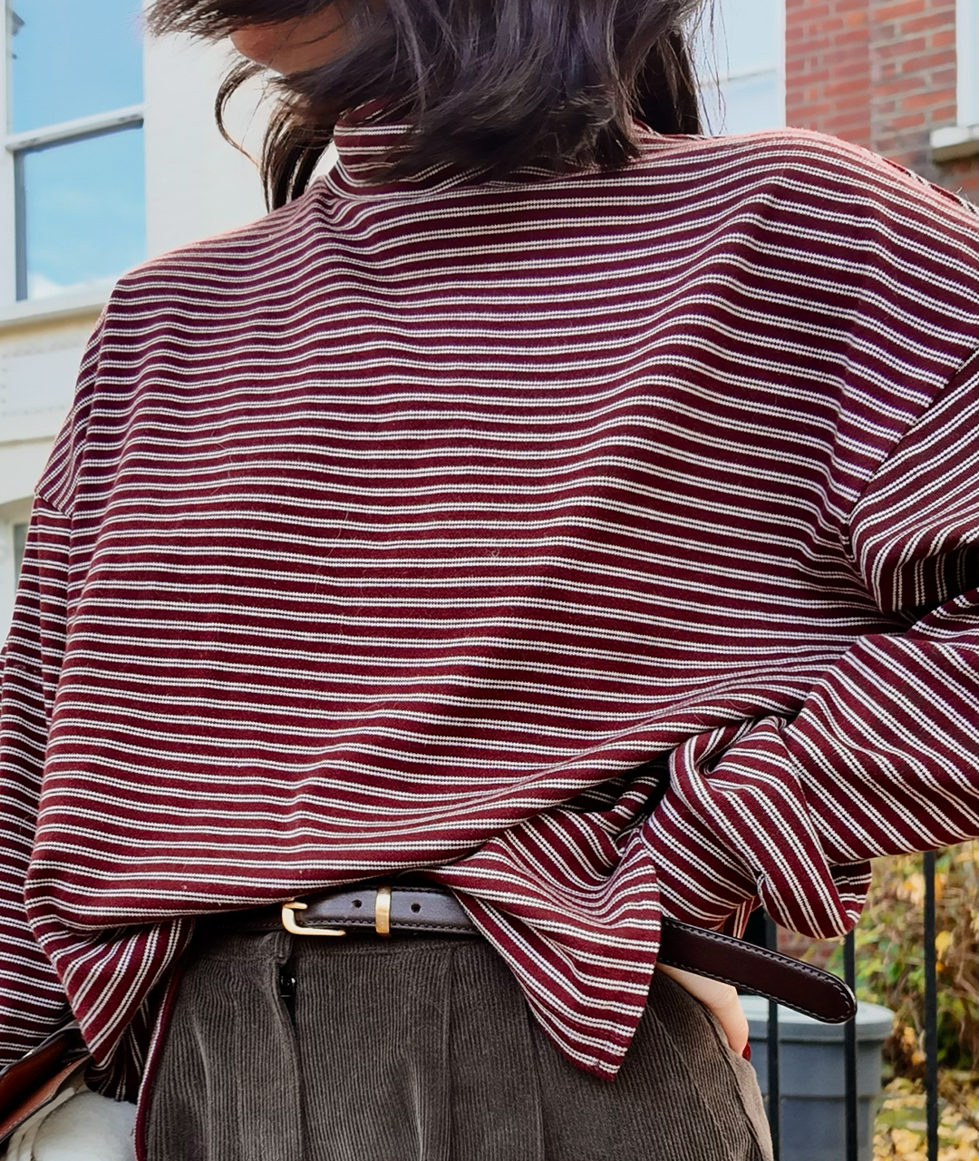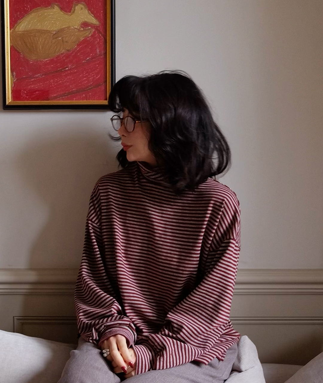 목을 감싸는 폴라 형태이지만 답답하지 않게 여유 있는 넥라인으로 디자인되었으며, 스트라이프 패턴이 포인트가 되어 이너로 착용했을 때도 멋스러운 포인트를 더해줍니다.