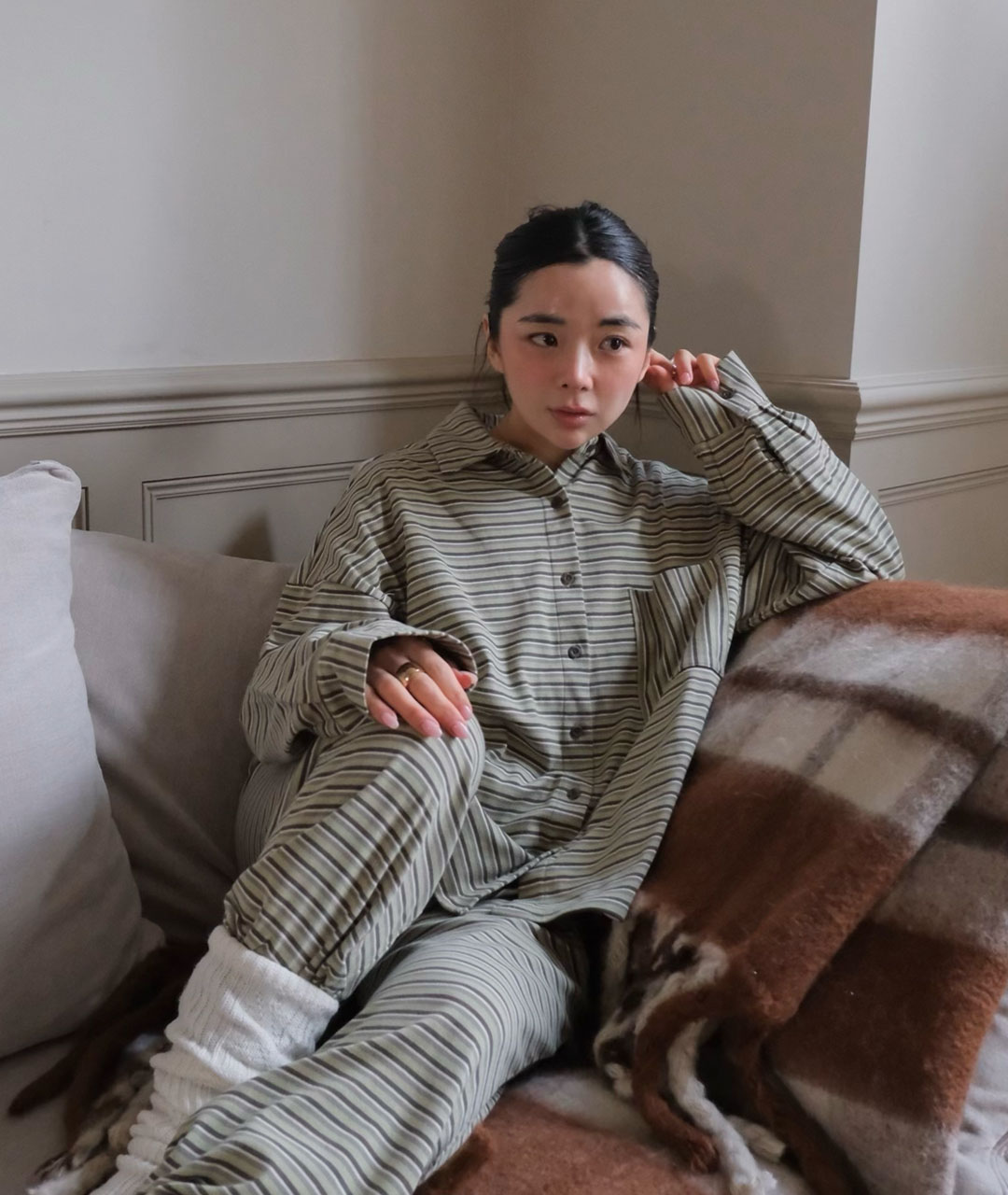 우디한 브라운 버튼이 포인트가 되어 셔츠 단독은 물론, 라운지웨어처럼 가볍게 즐기기에도 좋습니다.