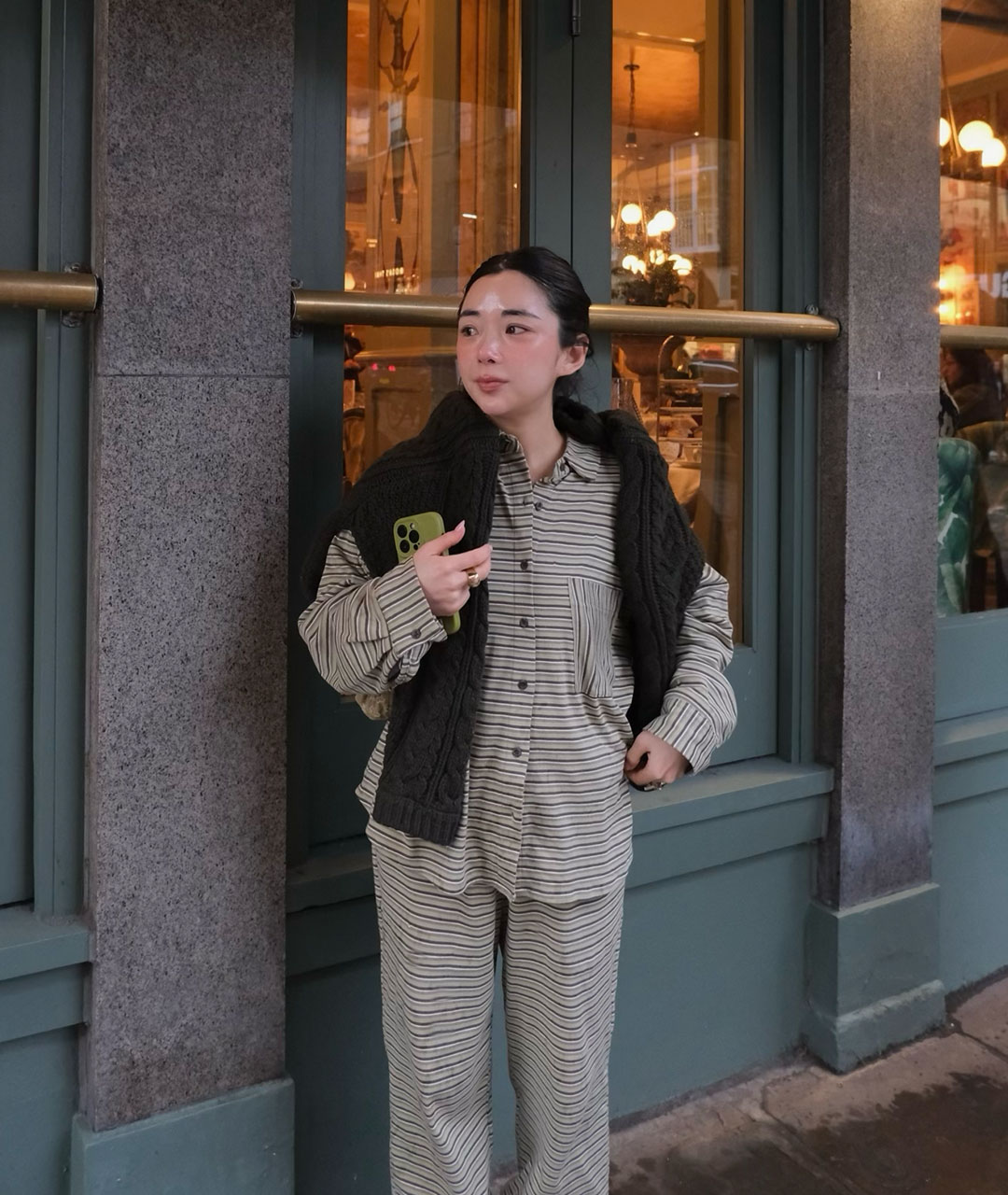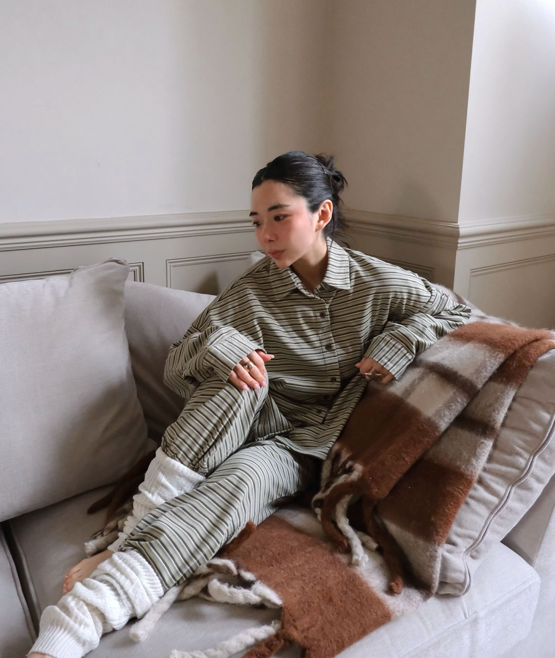 말차 그린, 라이트 그레이, 아이보리가 은은하게 섞인 잔잔한 패턴과 오버핏으로 편안하게 착용 가능합니다.