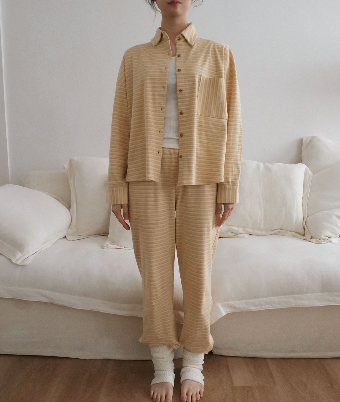 세트로 매칭할 수 있는 '버터 오가닉 조거팬츠' 와 함께 매칭하면 집에서도 편안하면서도 기분 좋은 스타일링을 완성할 수 있습니다.