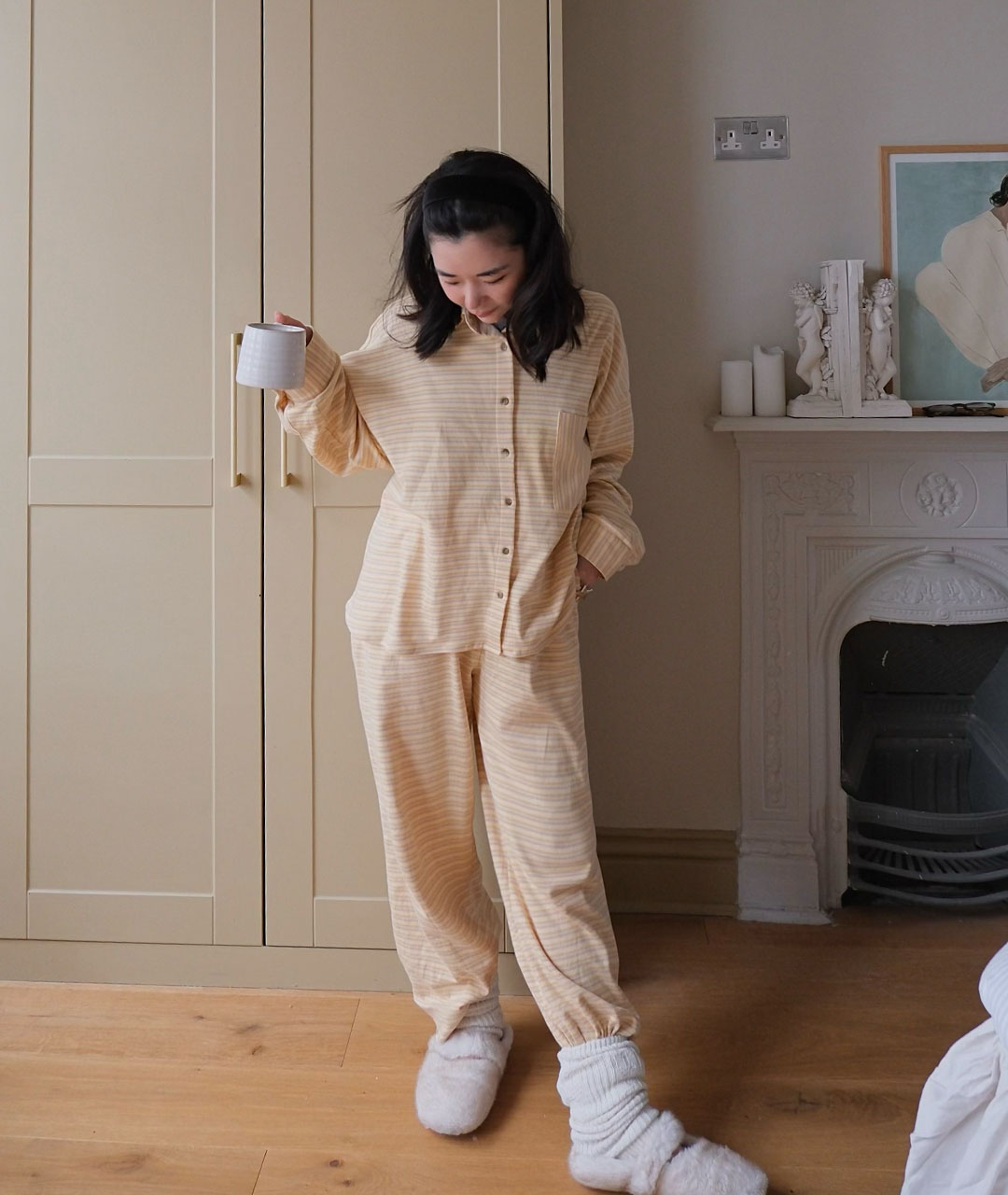 버터 옐로우, 라이트 그레이, 아이보리가 은은하게 섞인 잔잔한 패턴과 오버핏으로 편안하게 착용 가능합니다.