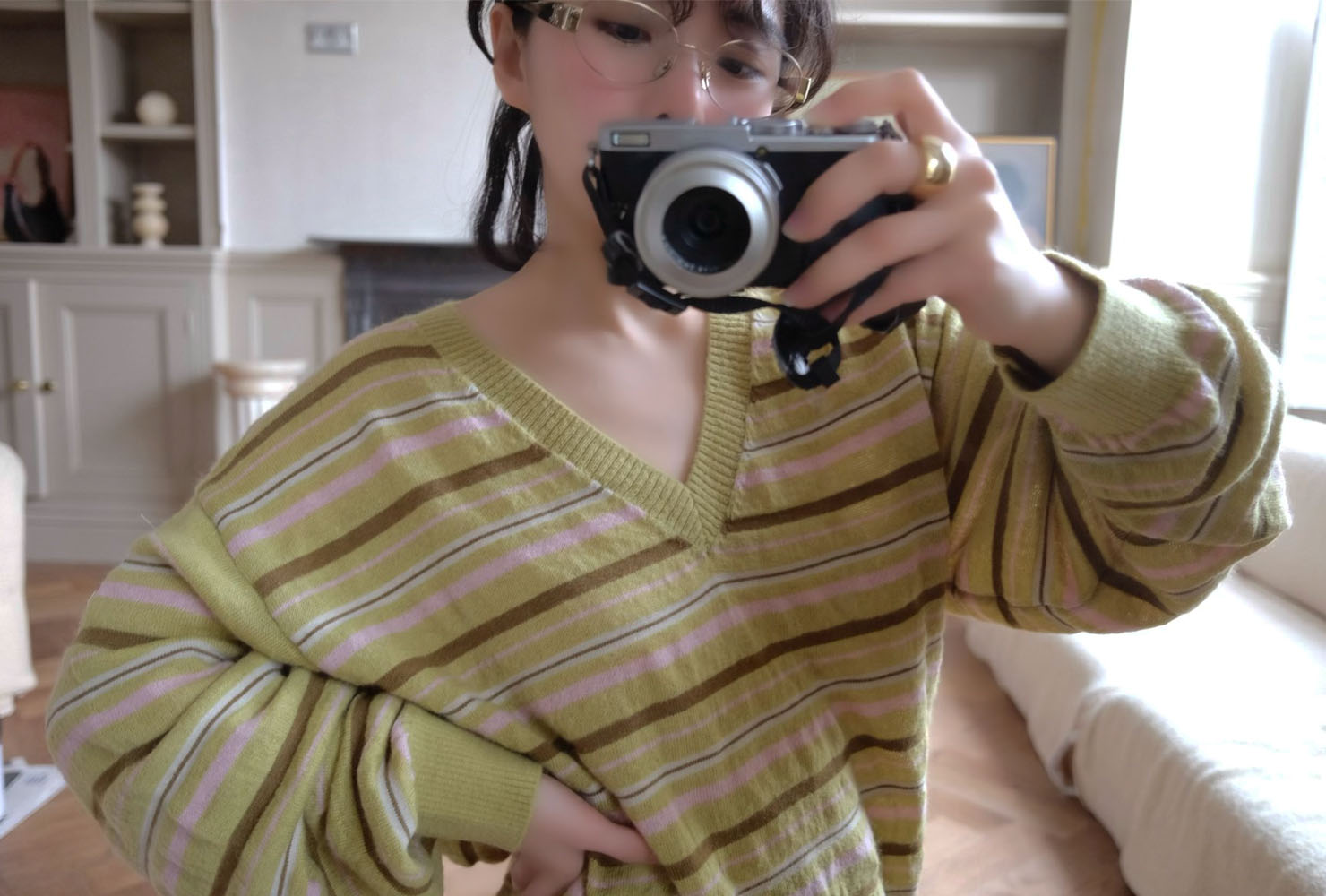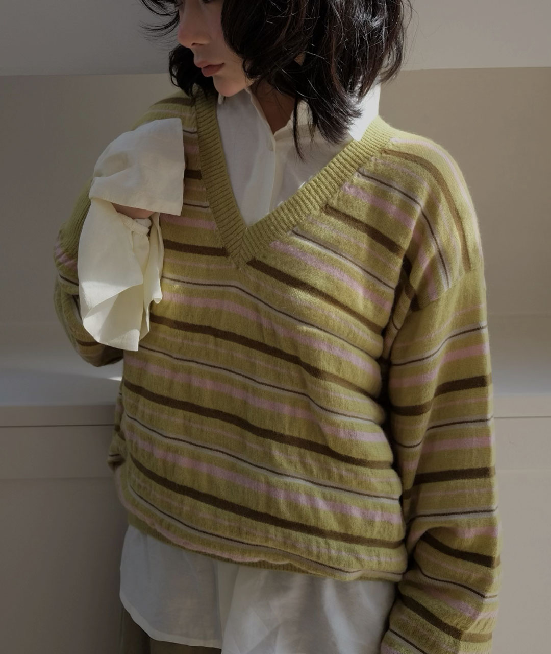 늦은 오후, 고요한 책방에서 책을 넘기는 소리에 둘러싸인 소녀를 떠올리며 탄생한 브이넥 스웨터입니다.