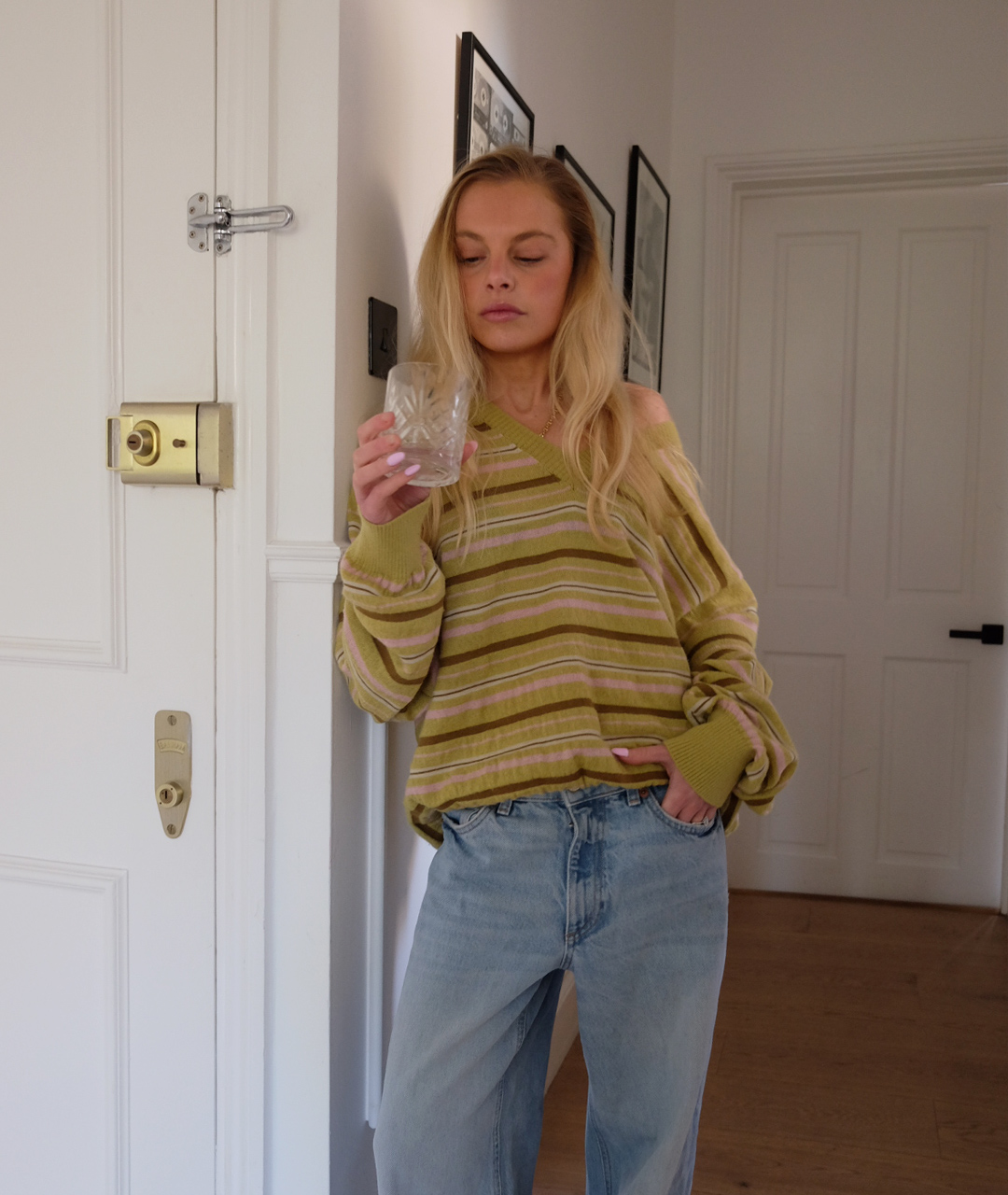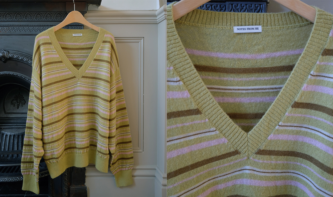 넉넉한 오버사이즈 핏과 브이넥, 스트라이프 패턴이 어우러져 단독으로도, 레이어드해도 멋스러운 스타일을 완성할 수 있는 아이템입니다.