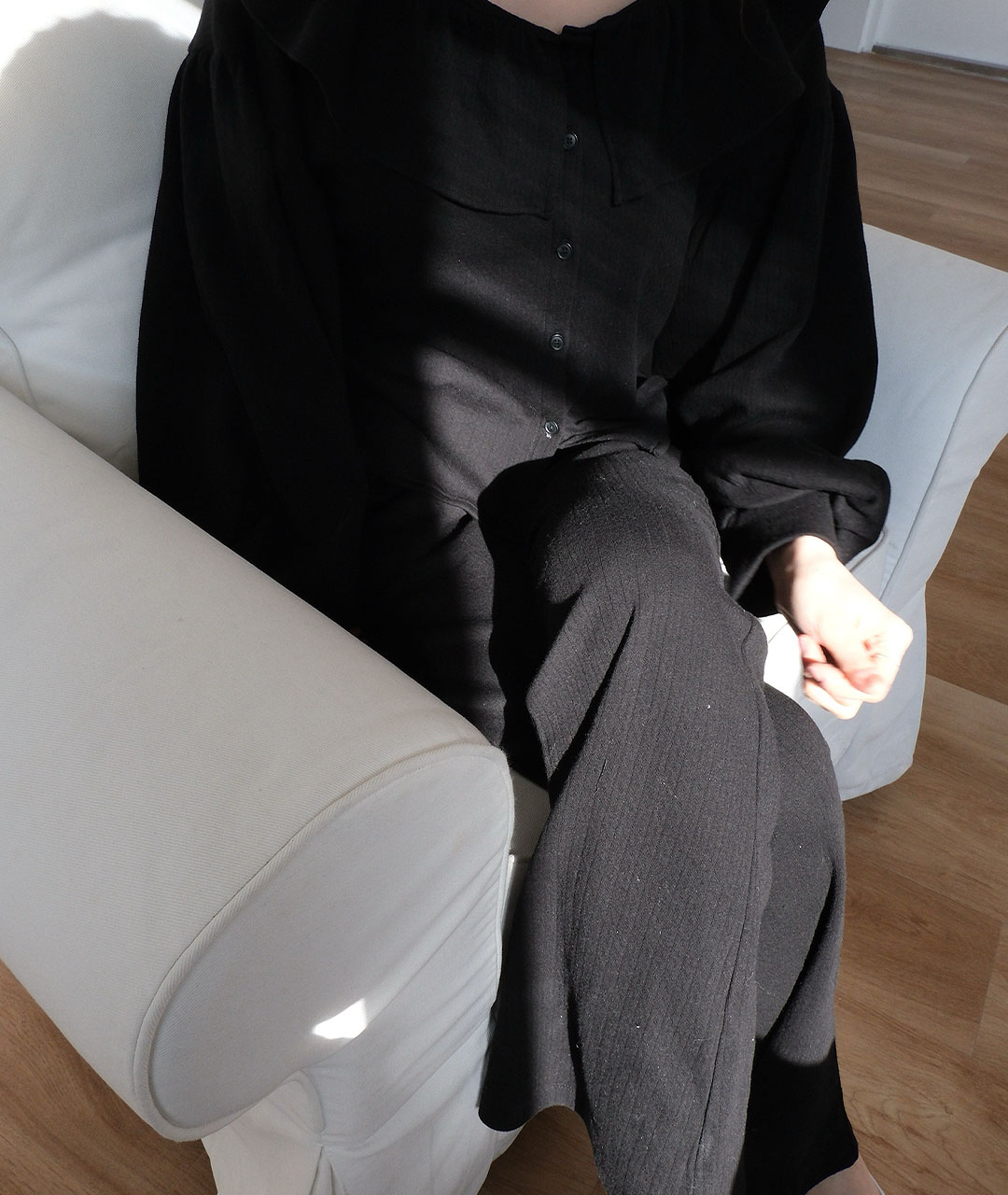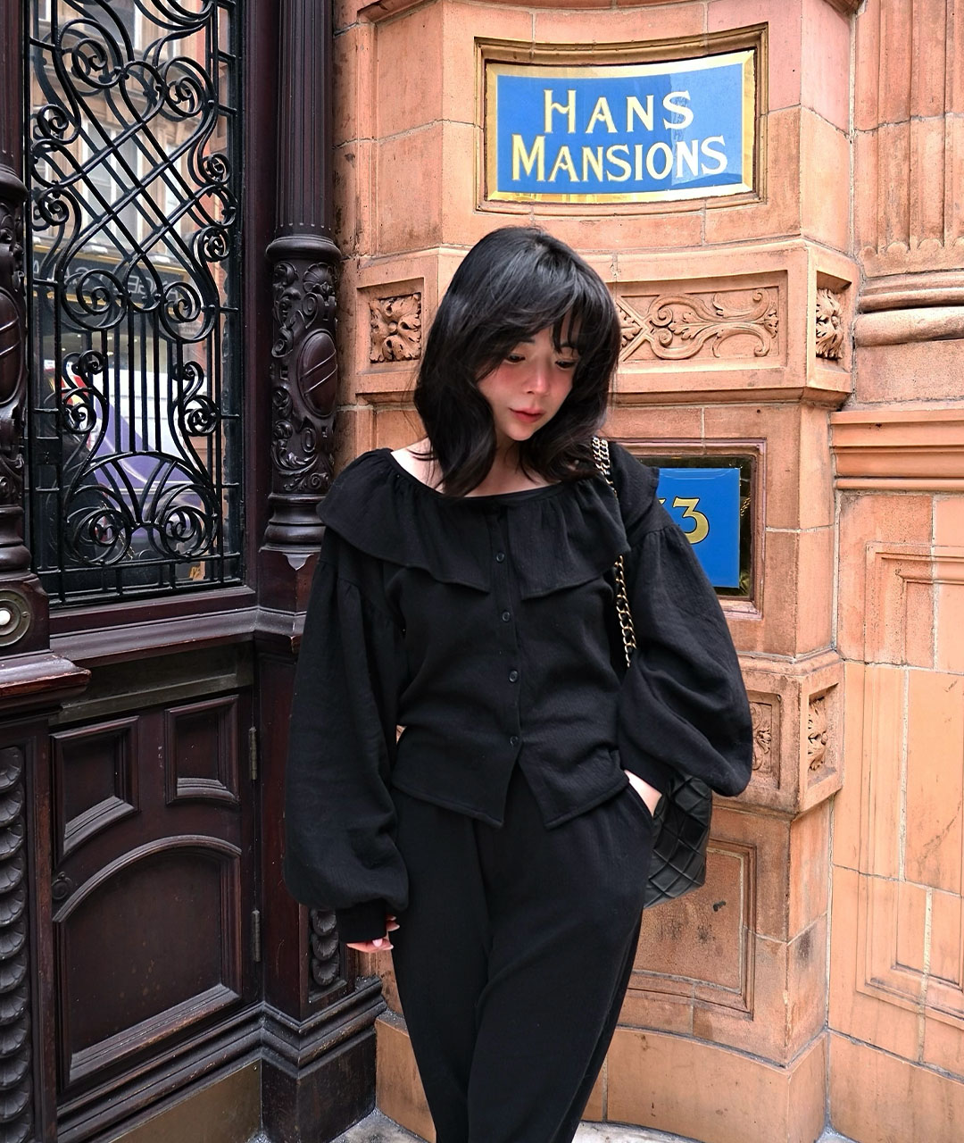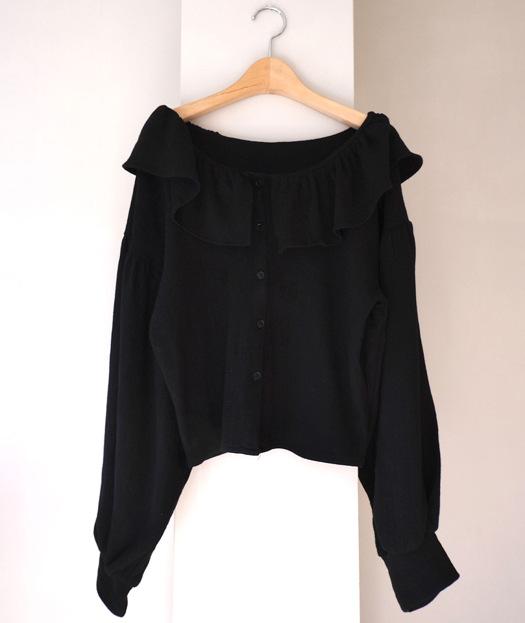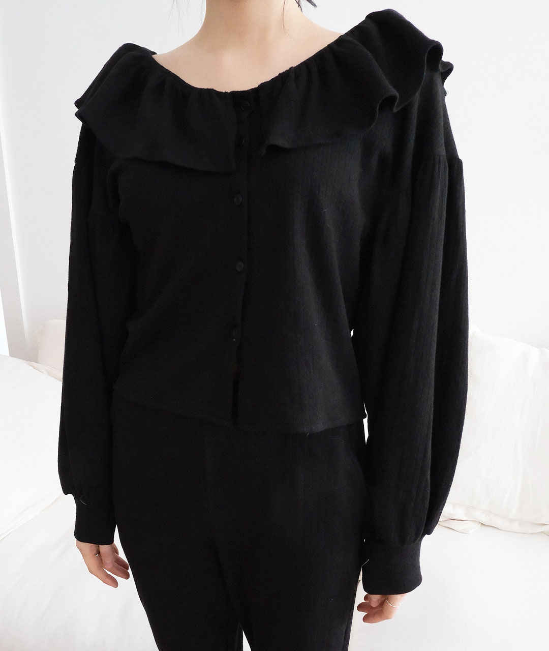 블라우스는 넥 라인의 프릴 디테일과 볼륨 있는 소매로 디자인되었으며, 원단 전체에 섬세한 펀칭 디테일이 검정 색상과 고급스러움을 더해줍니다.