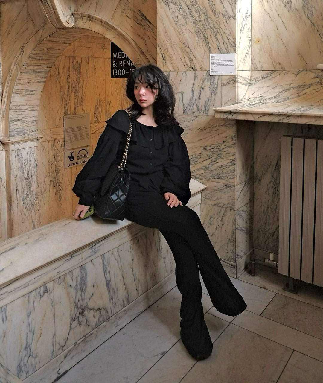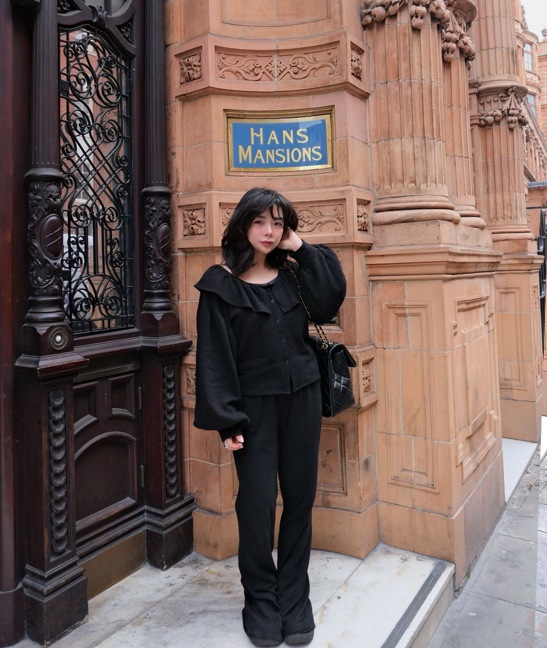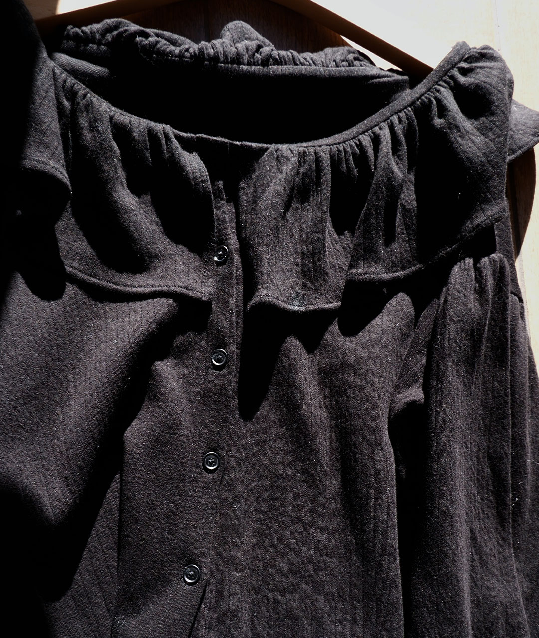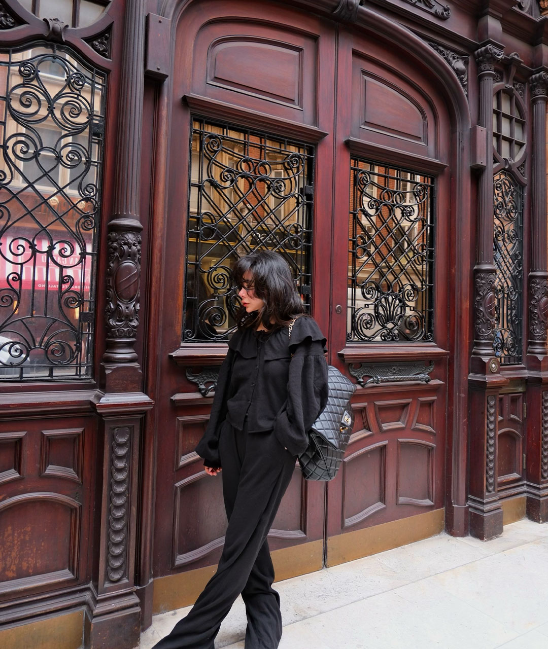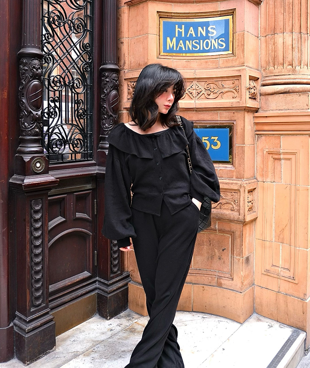 블라우스는 넥 라인의 프릴 디테일과 볼륨 있는 소매로 디자인되었으며, 원단 전체에 섬세한 펀칭 디테일이 검정 색상과 고급스러움을 더해줍니다.