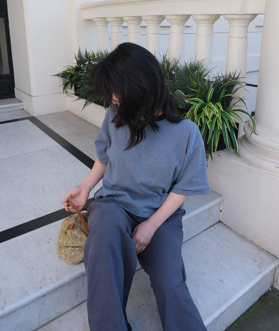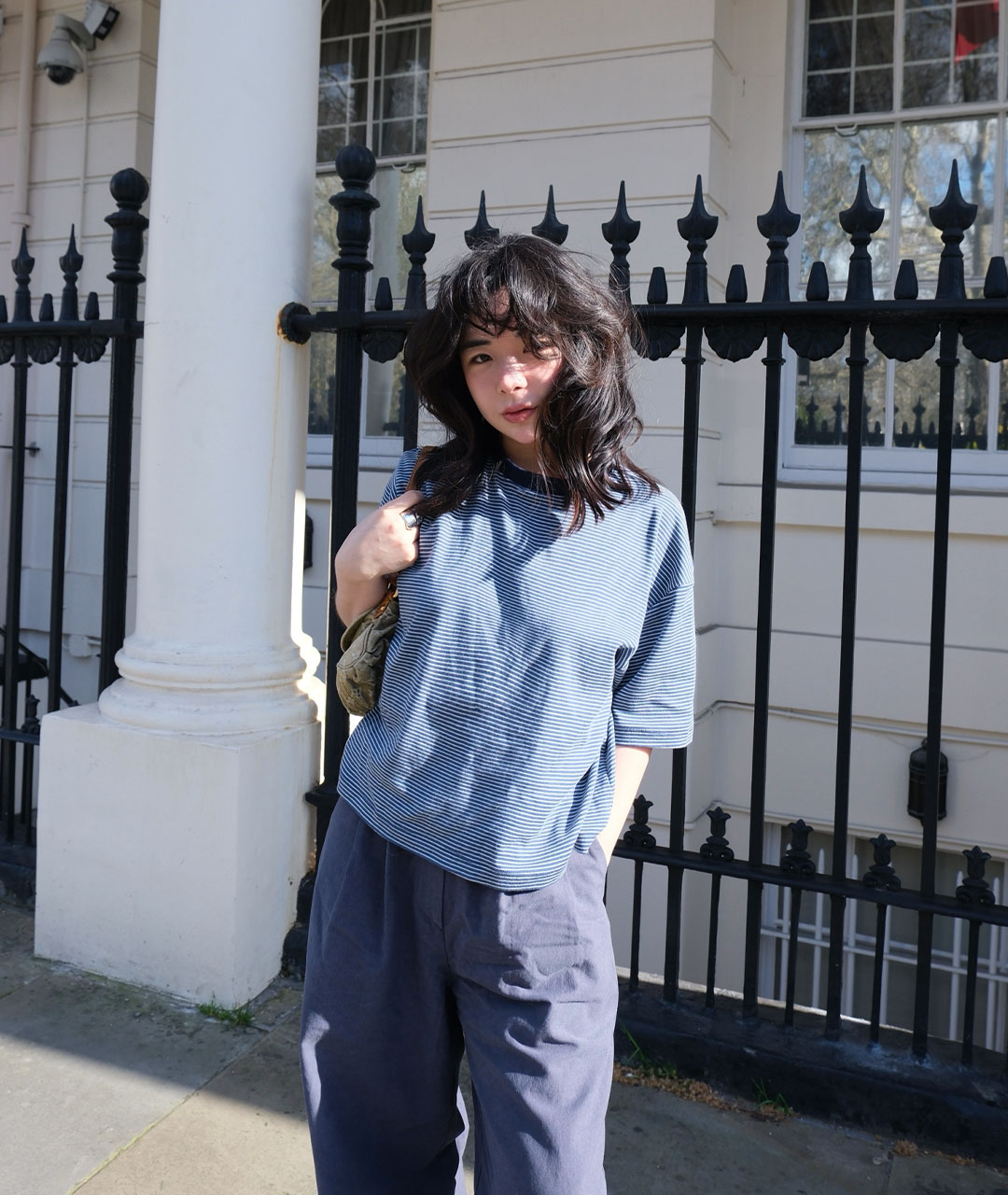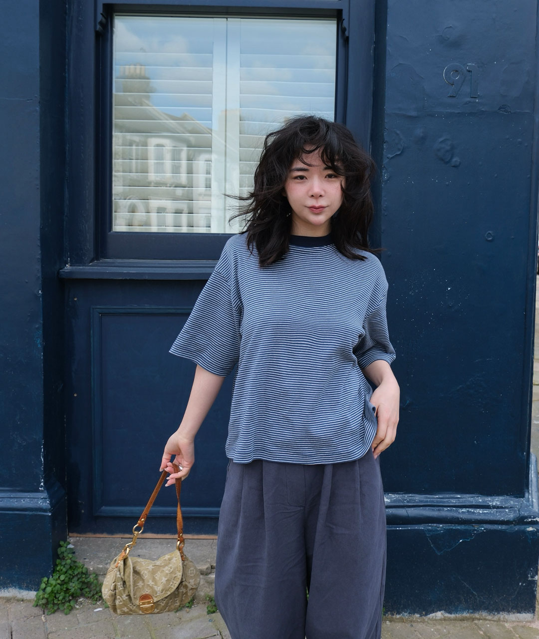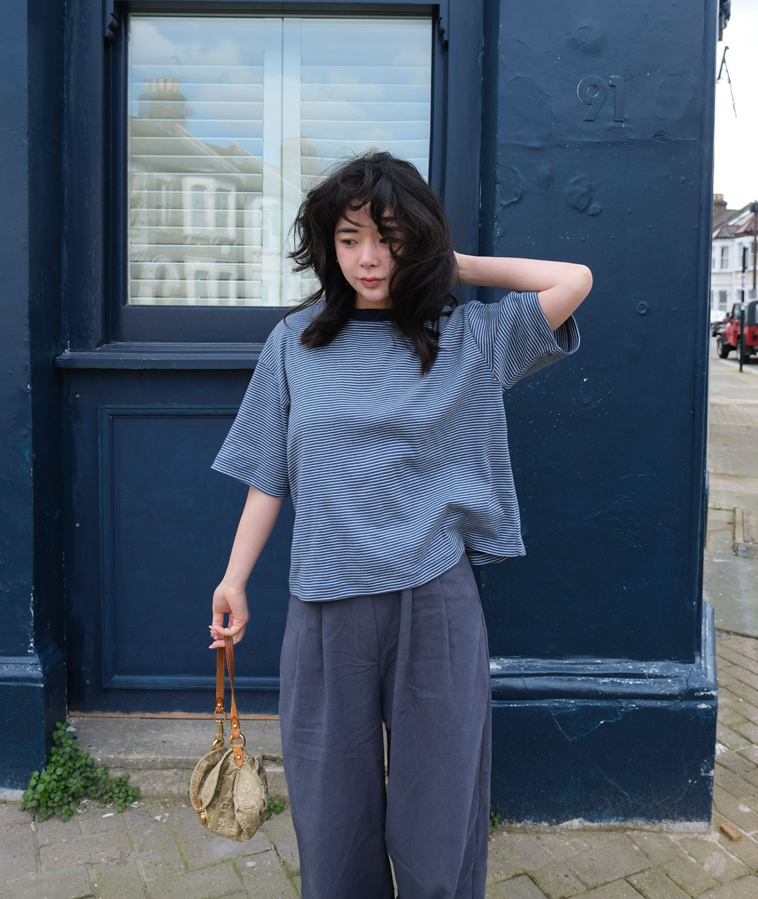 빈티지한 미드나잇 블루가 섞인 톤다운된 블루 컬러를 바탕으로, 아이보리 잔스트라이프를 적용해 He만의 컬러 톤을 완성했습니다.