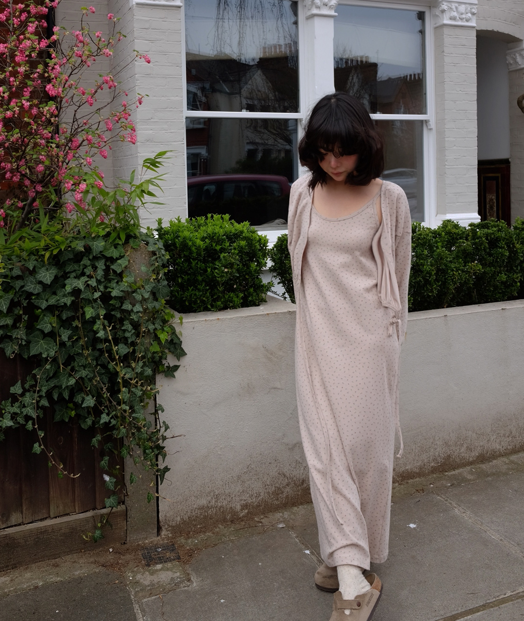 잔꽃 패턴과 은은한 베이지톤이 어우러진 편안한 나시 원피스입니다. 어디에나 받쳐 입을 수 있는 긴 기장의 원피스로 봄의 코디를 완성해보세요.