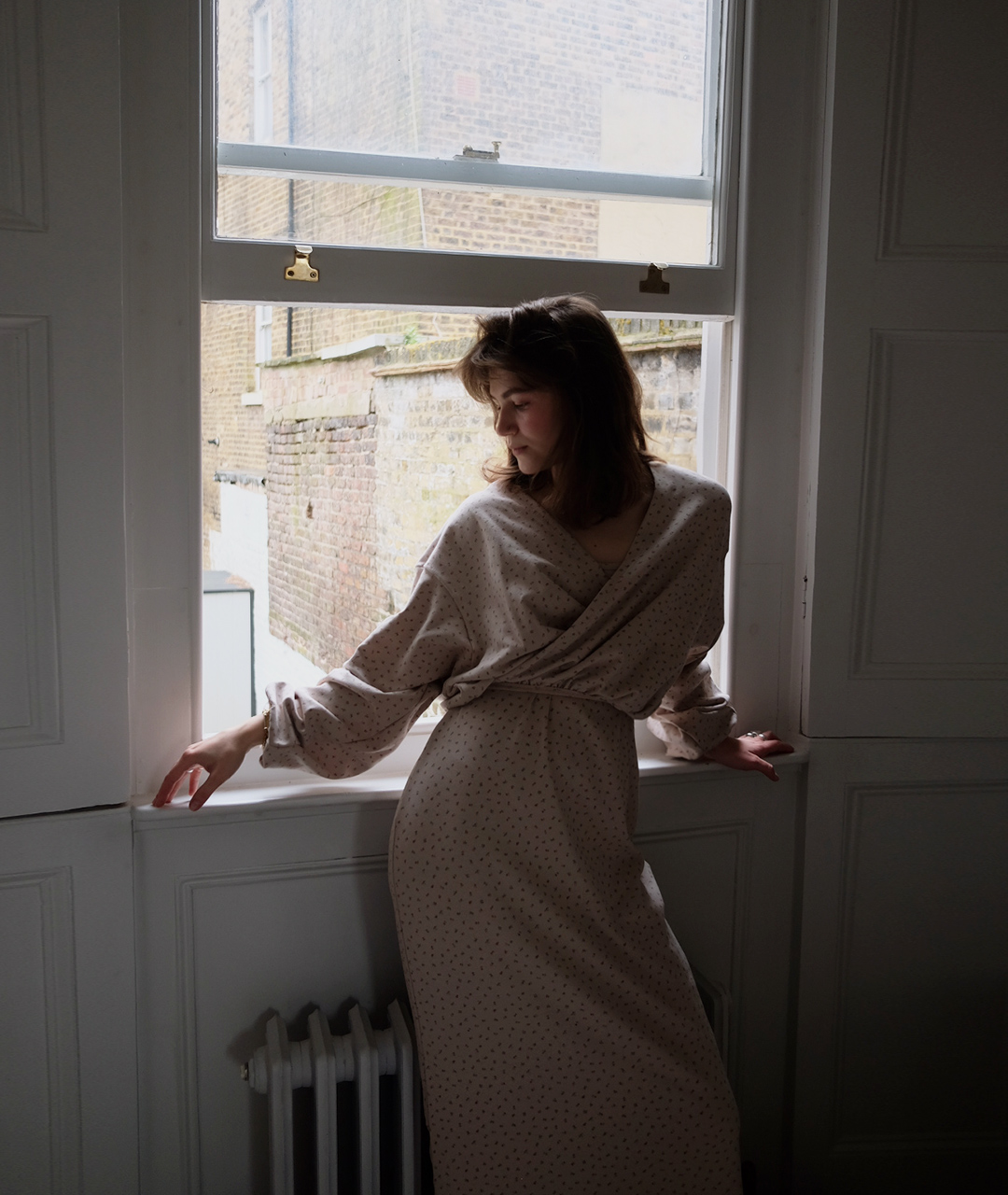 A comfy sleeveless dress with a tiny floral print and soft beige tones. Easy to layer and perfect for spring.