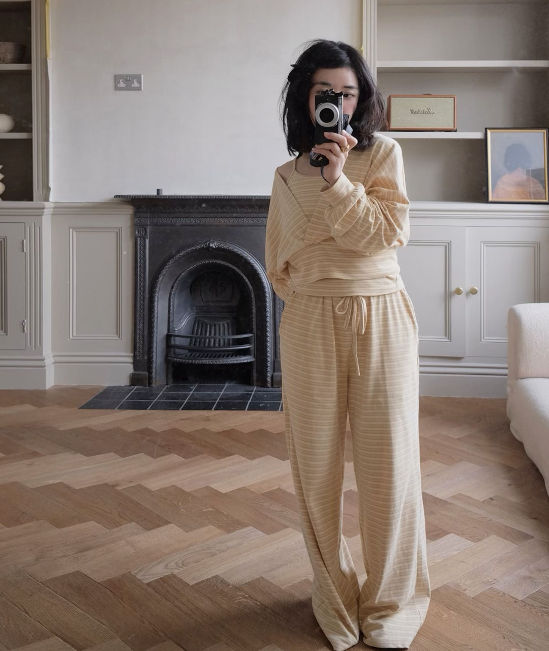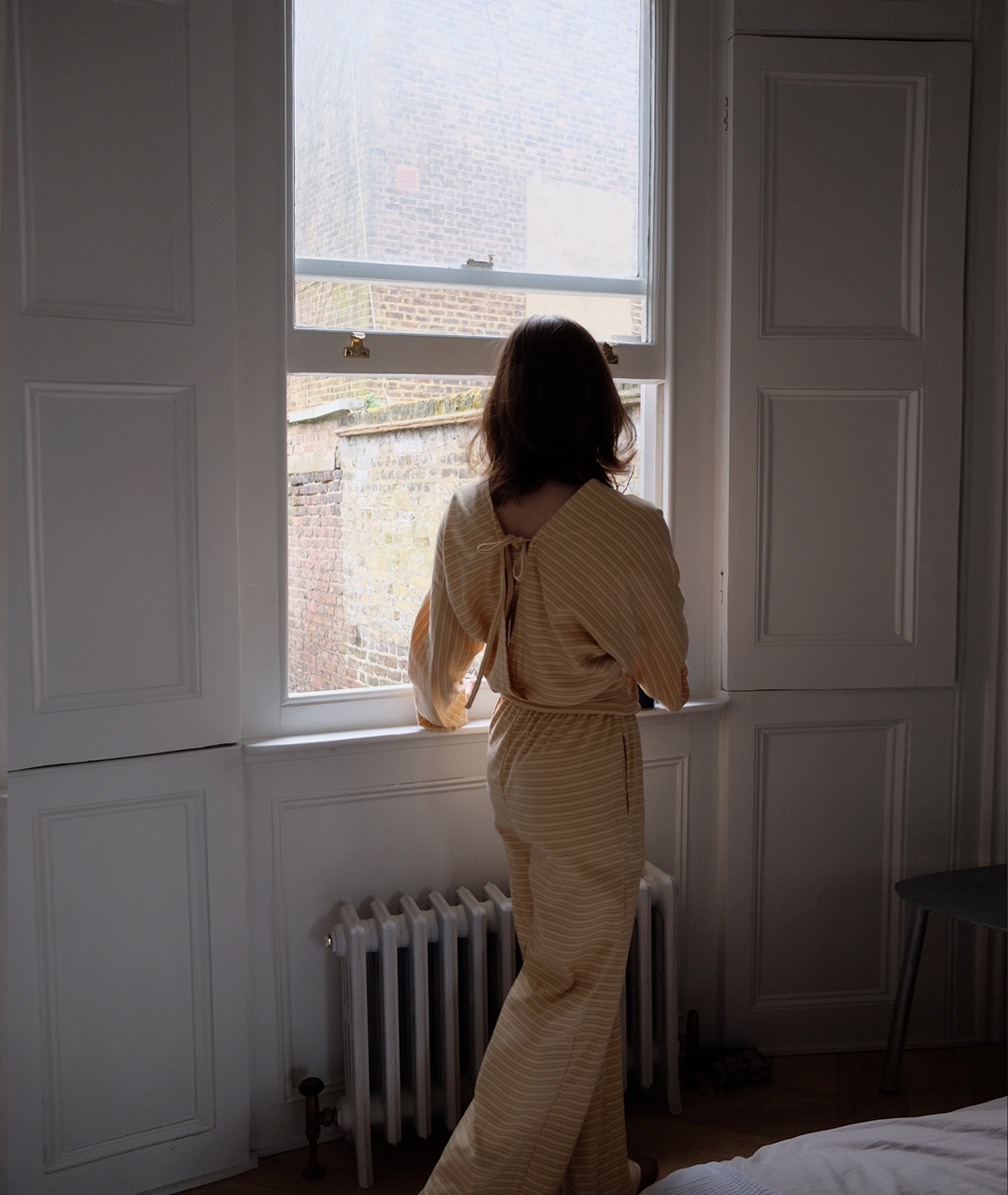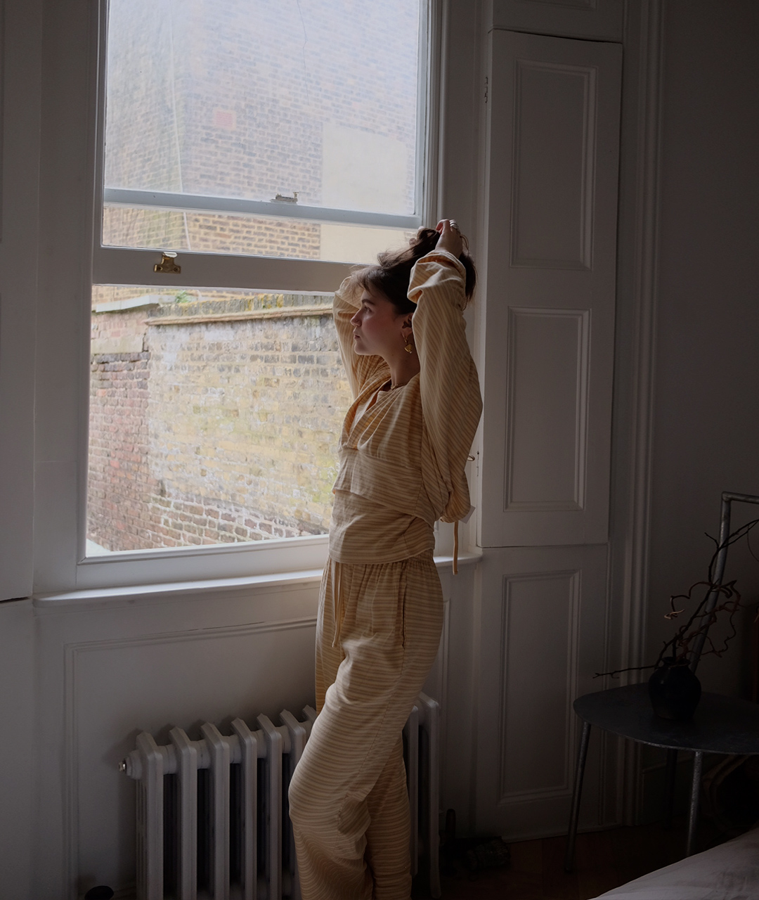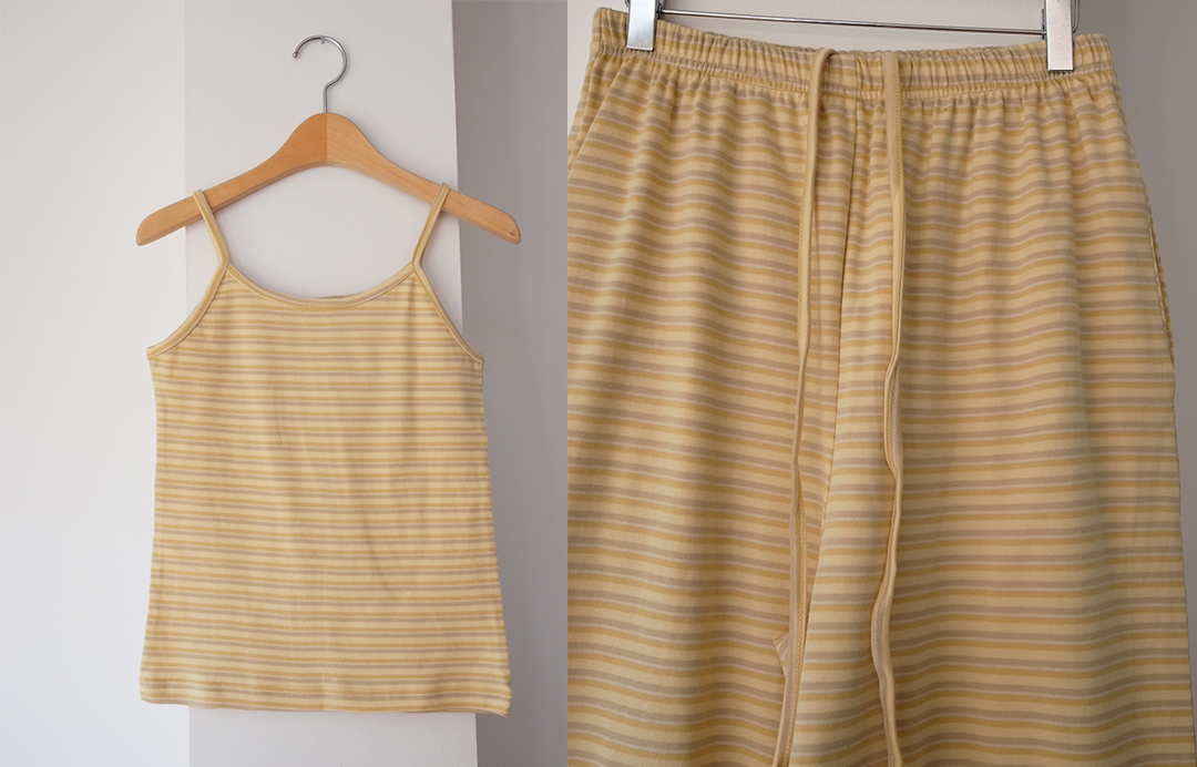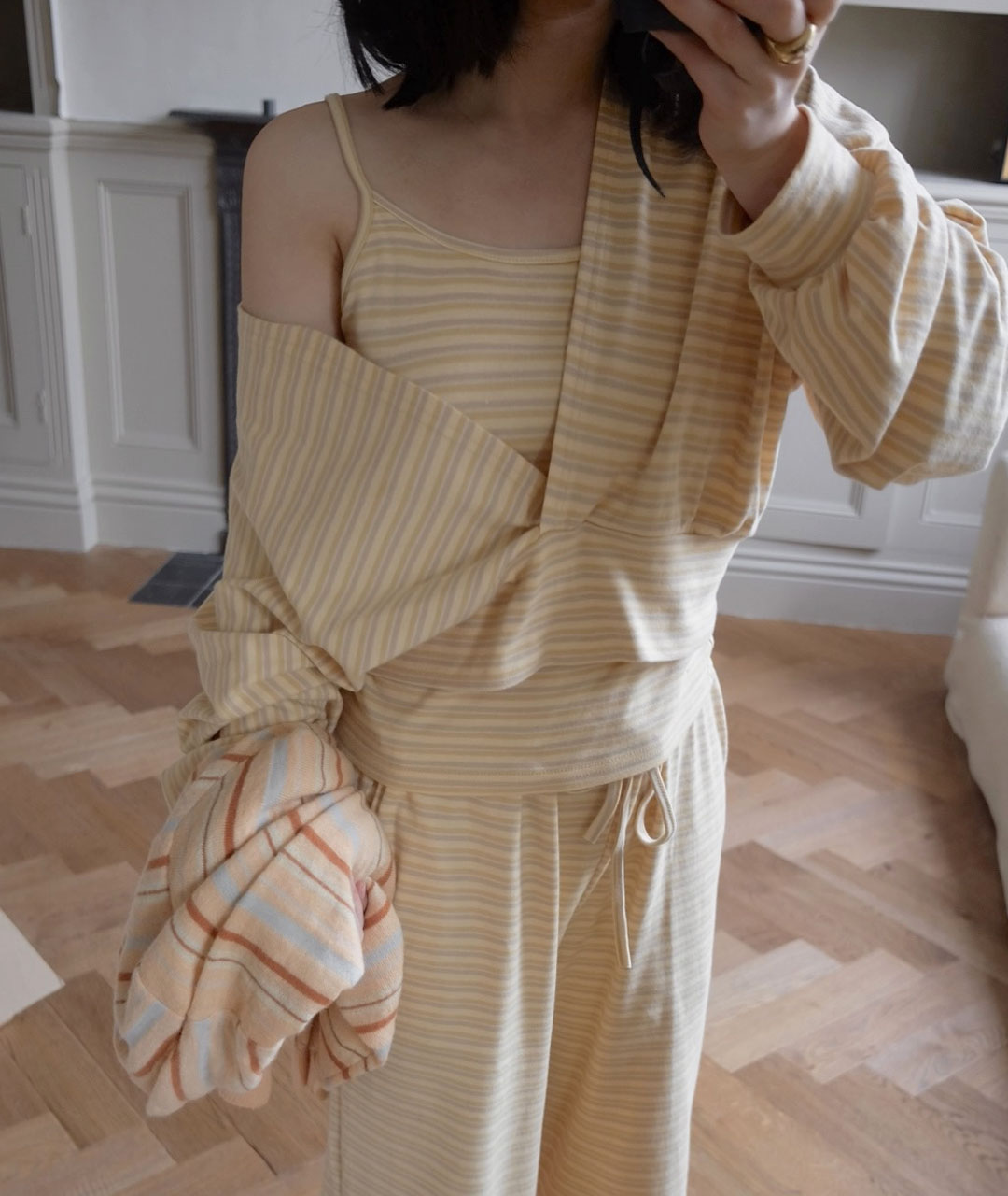 Made from 100% organic cotton, this loungewear set comes in a warm butter-yellow spring palette with stripes that can be styled from head to toe.