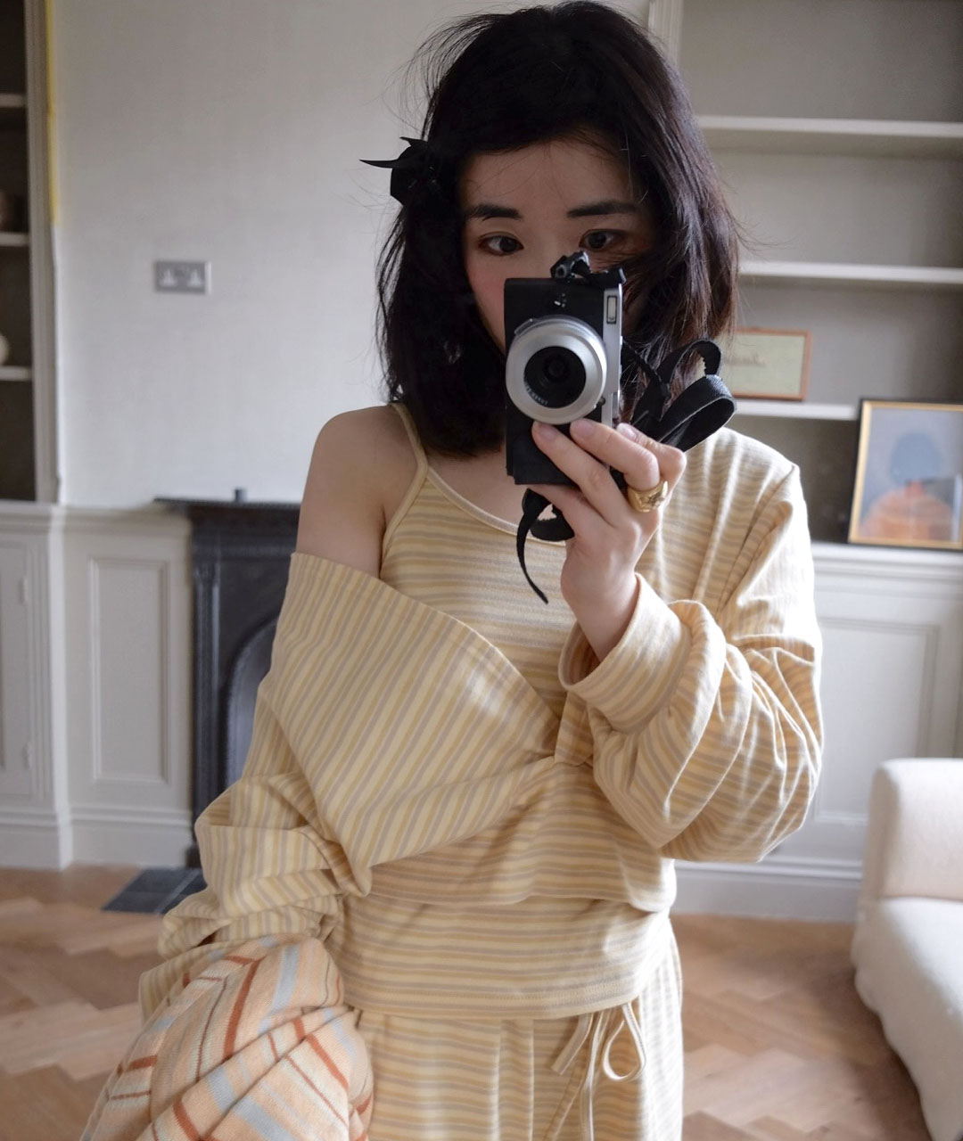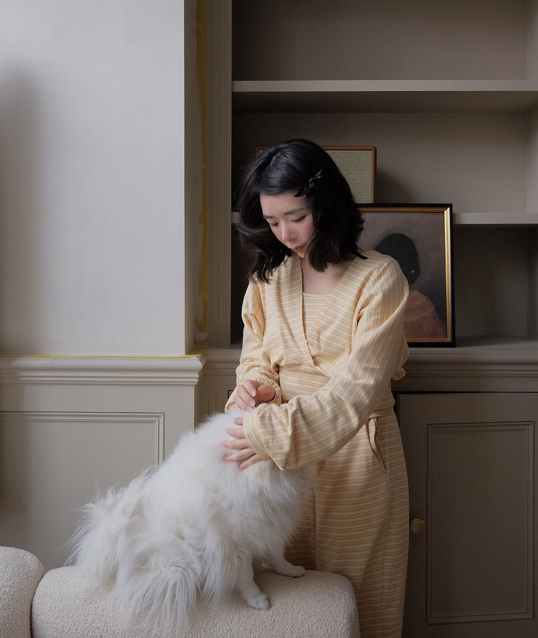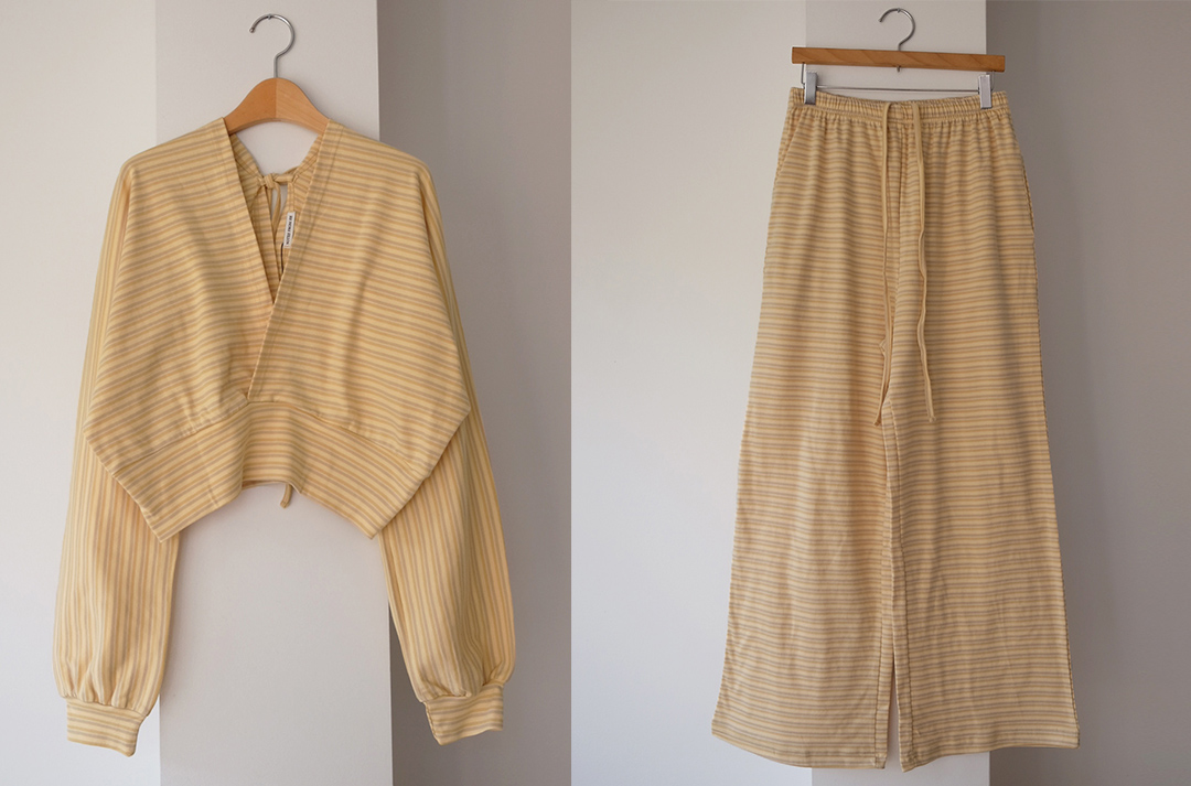 100% 유기농 면으로 제작되어 부드러운 촉감과 편안함을 선사하는 라운지웨어입니다. 따뜻한 노랑의 버터 컬러와 은은한 스트라이프 패턴이 조화를 이루어 감각적인 스타일을 연출합니다.