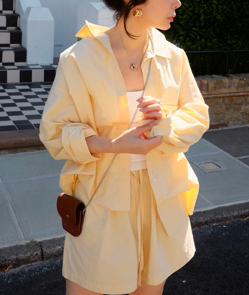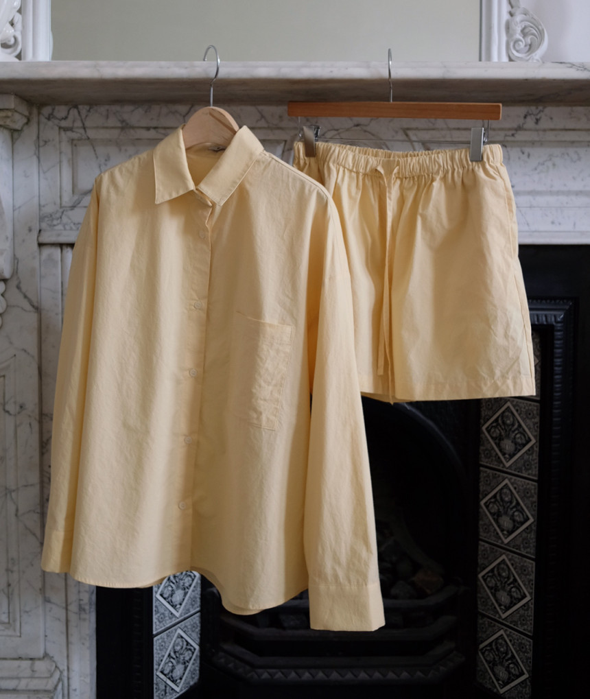 A unisex two-piece set in butter yellow. A breezy long-sleeve shirt that captures the picnic vibe of a British summer.