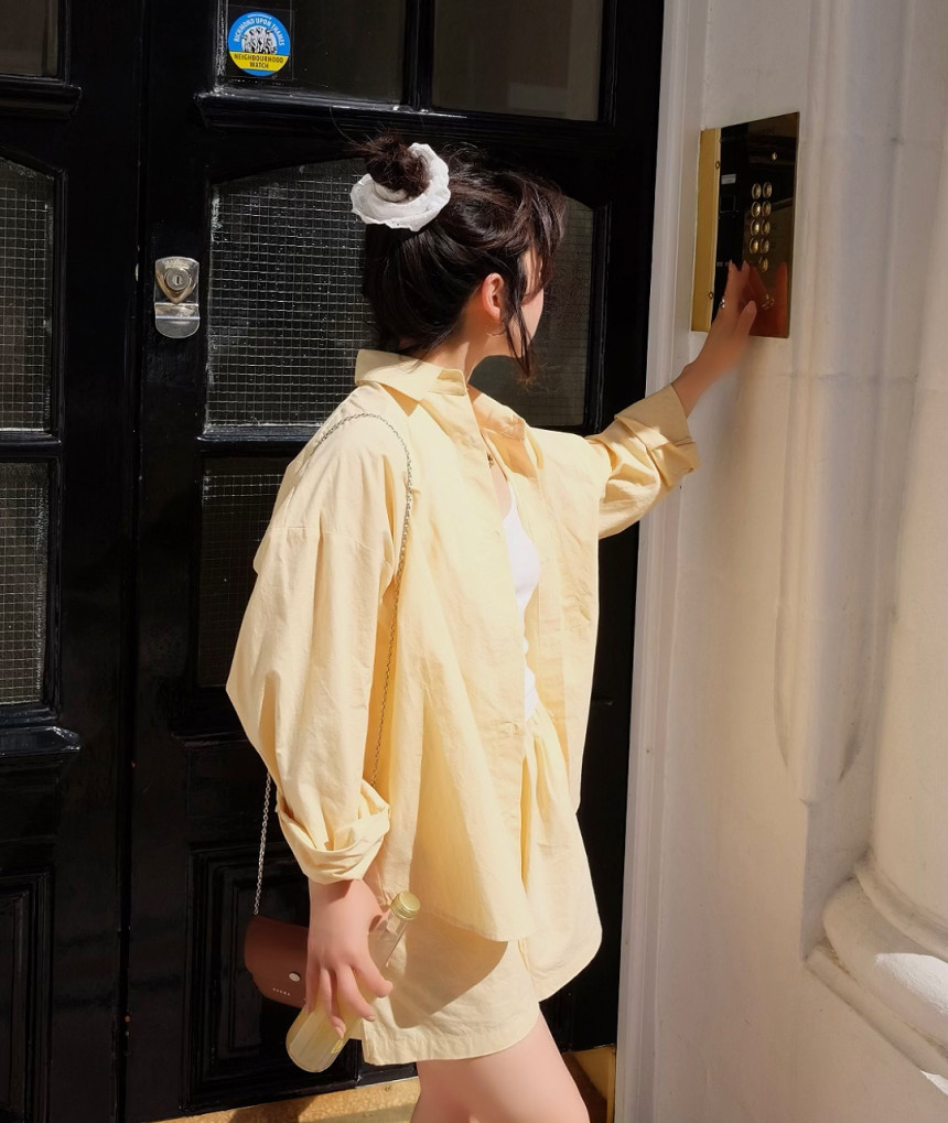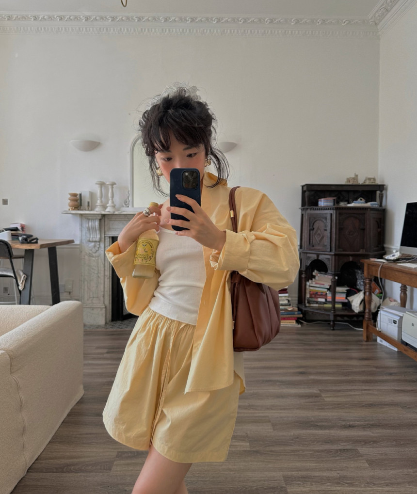 기본 오버핏의 셔츠와 릴렉싱핏의 반바지로 이루어진 데일리 피스입니다.
