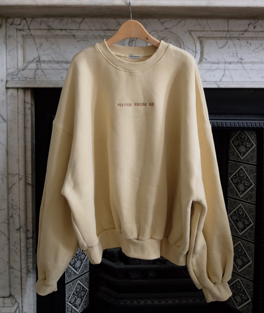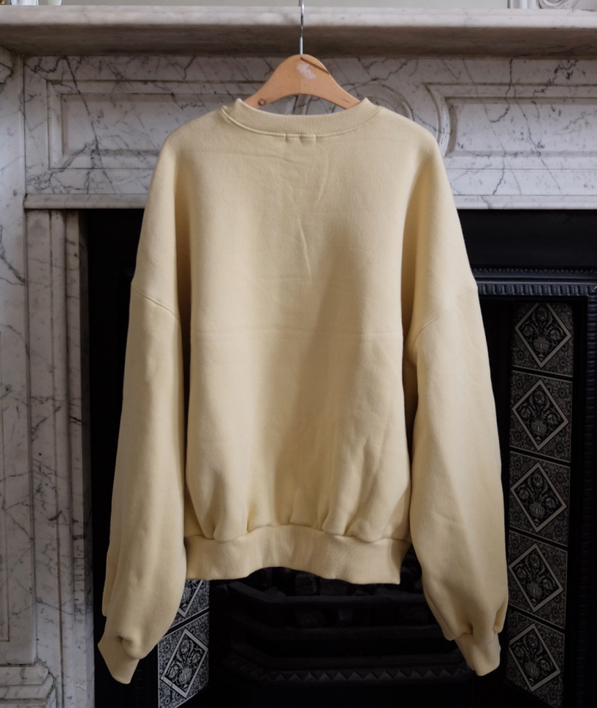 An oversized unisex sweatshirt in a soft pastel butter shade,