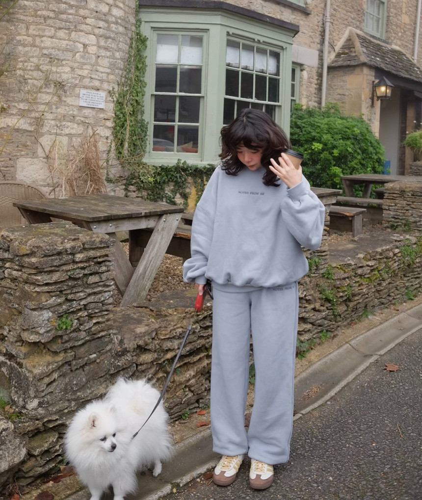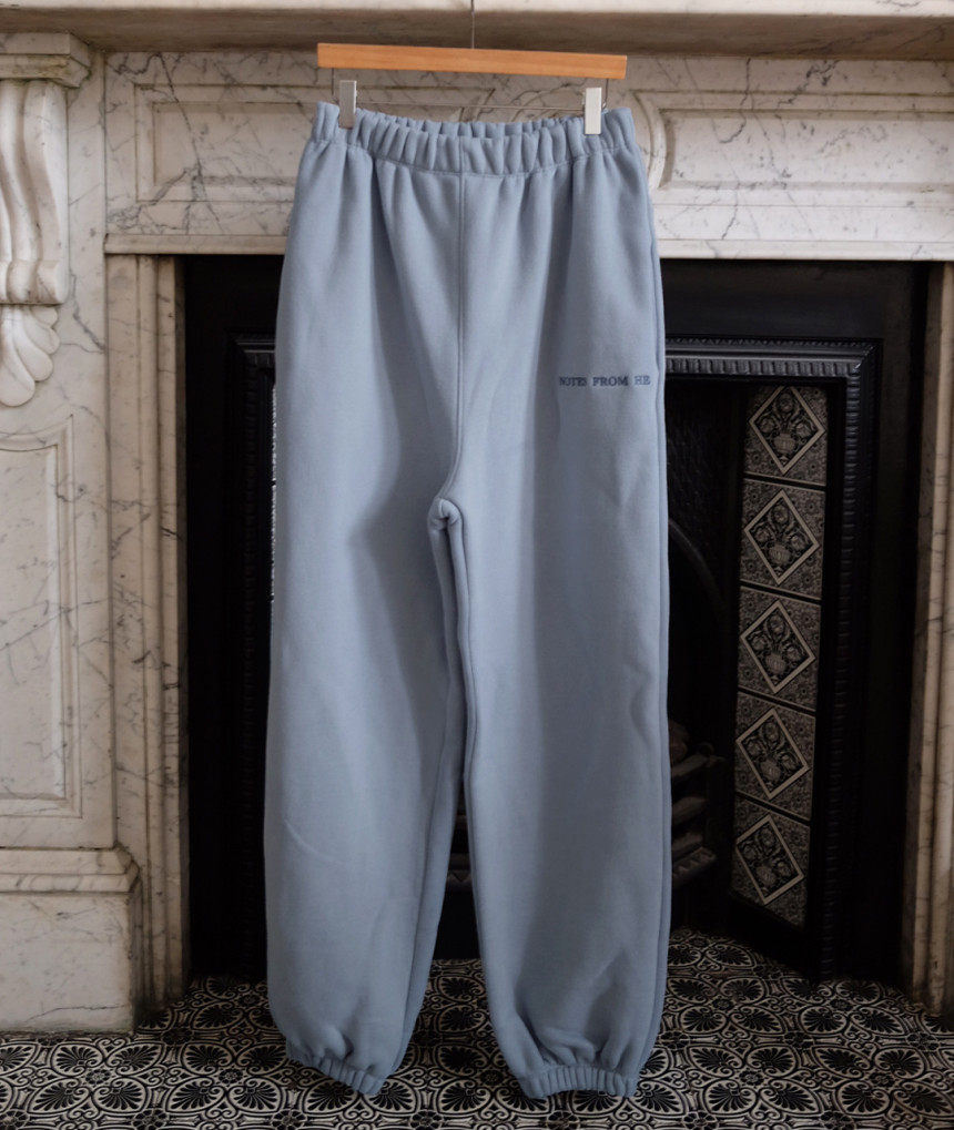 소프트한 베이비 블루 색감의 조거팬츠는 남여공용으로 착용 가능합니다.