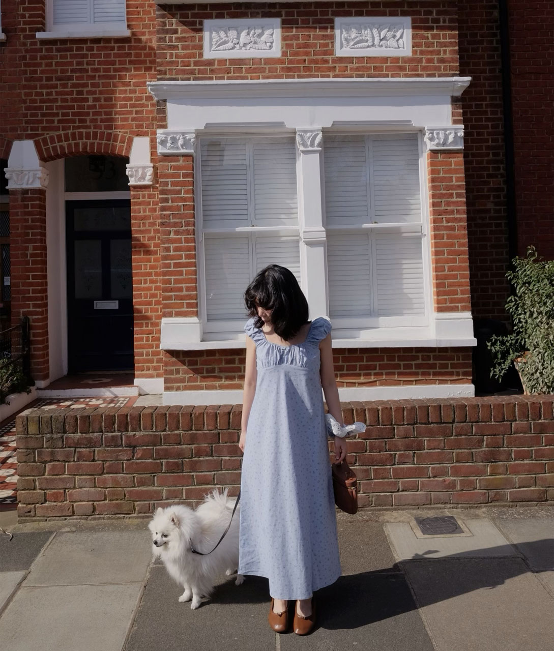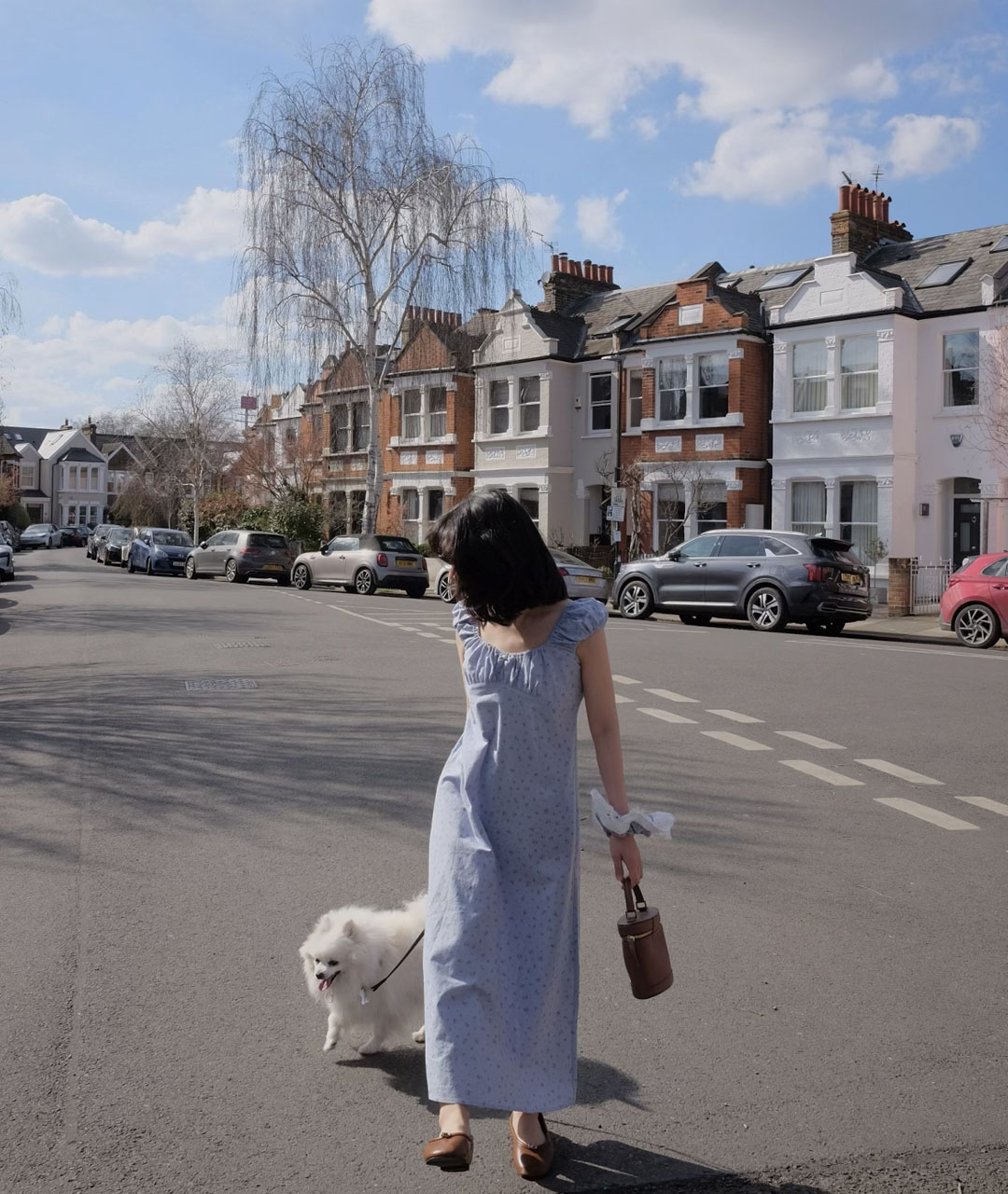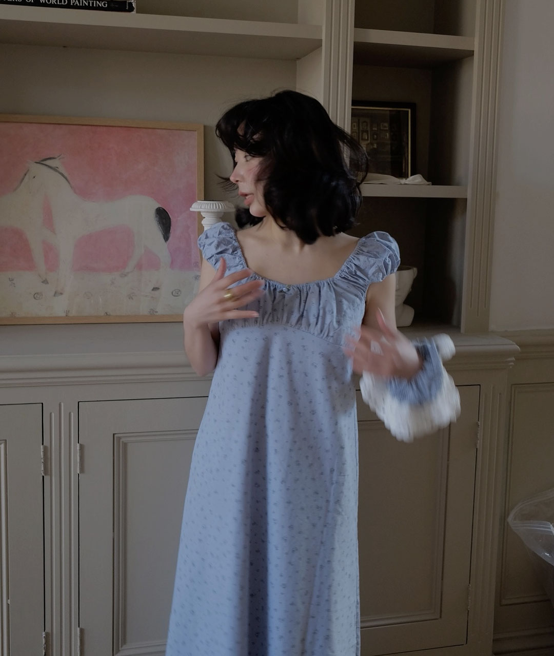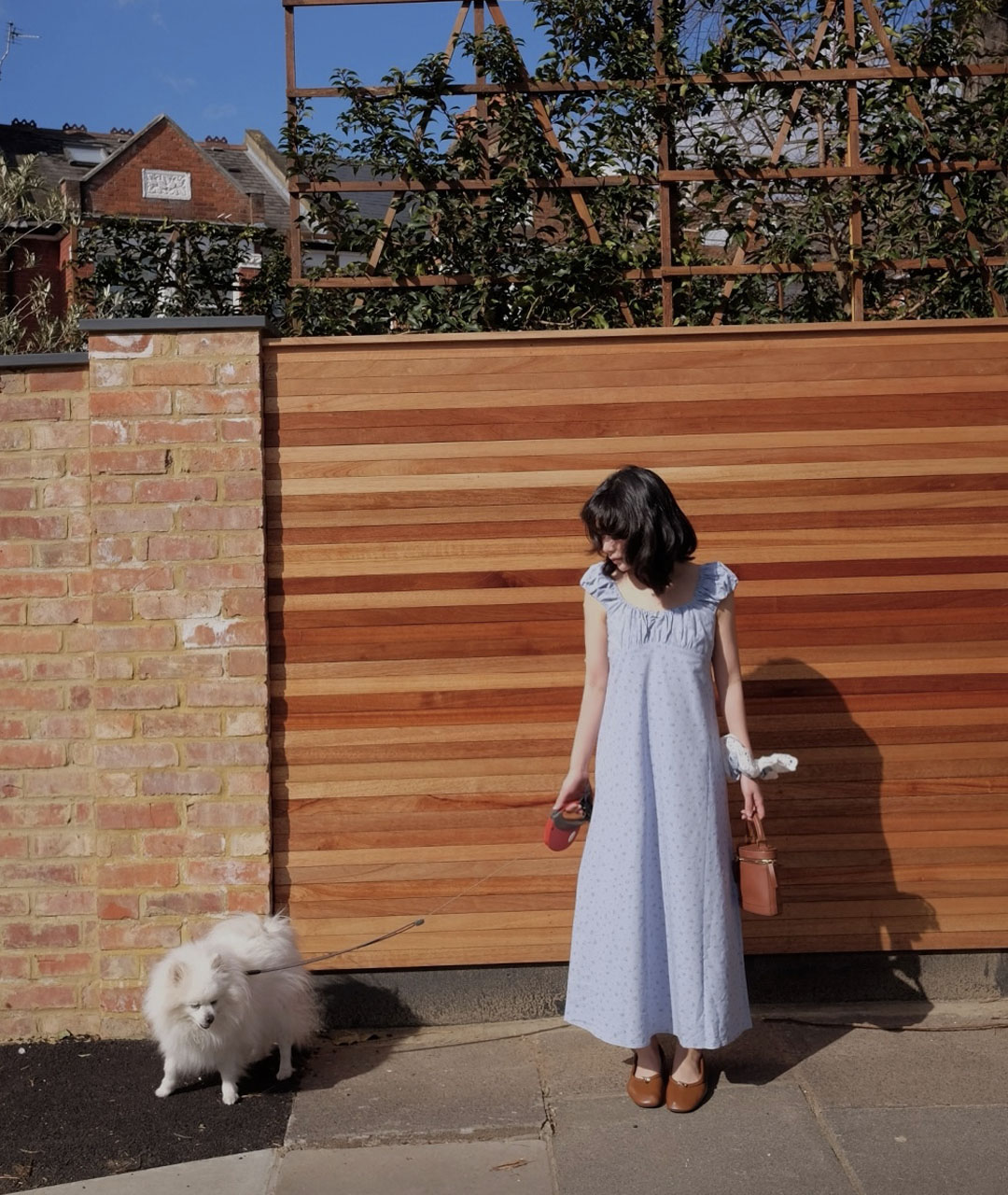 파란색의 원피스는, 마치 영국의 봄날을 떠올리게 하는 은은한 파란색에 작은 꽃들이 어우러져, 공원과 잔잔한 강변을 따라 산책하는 듯한 기분으로 입어보실 수 있어요.