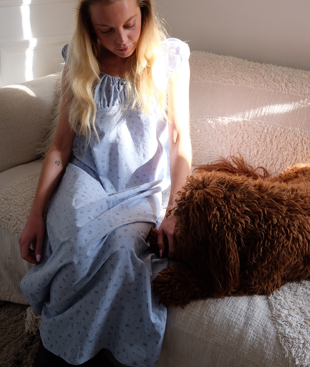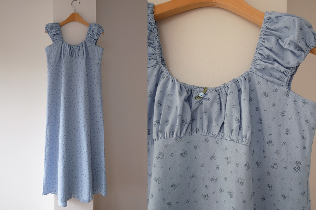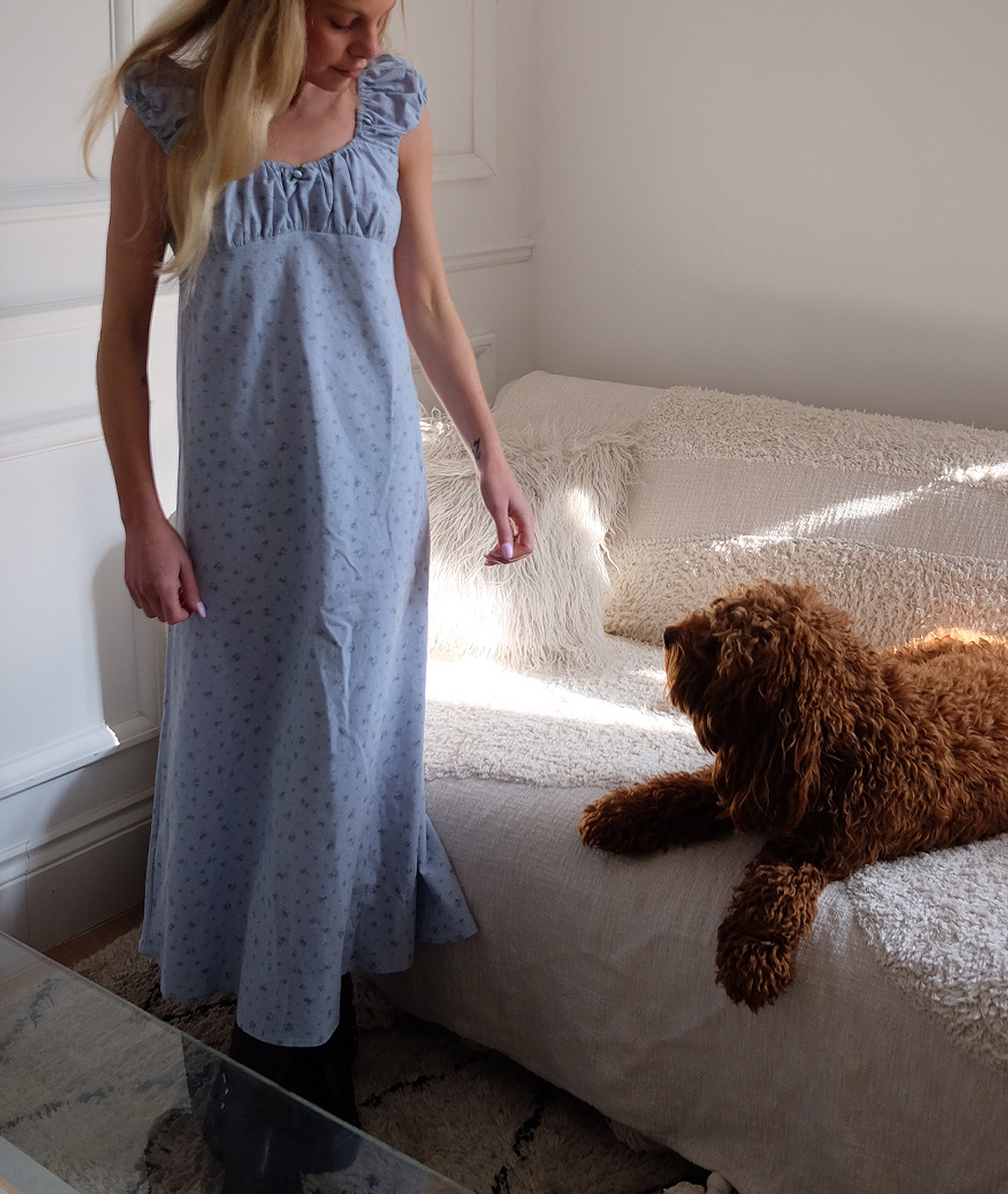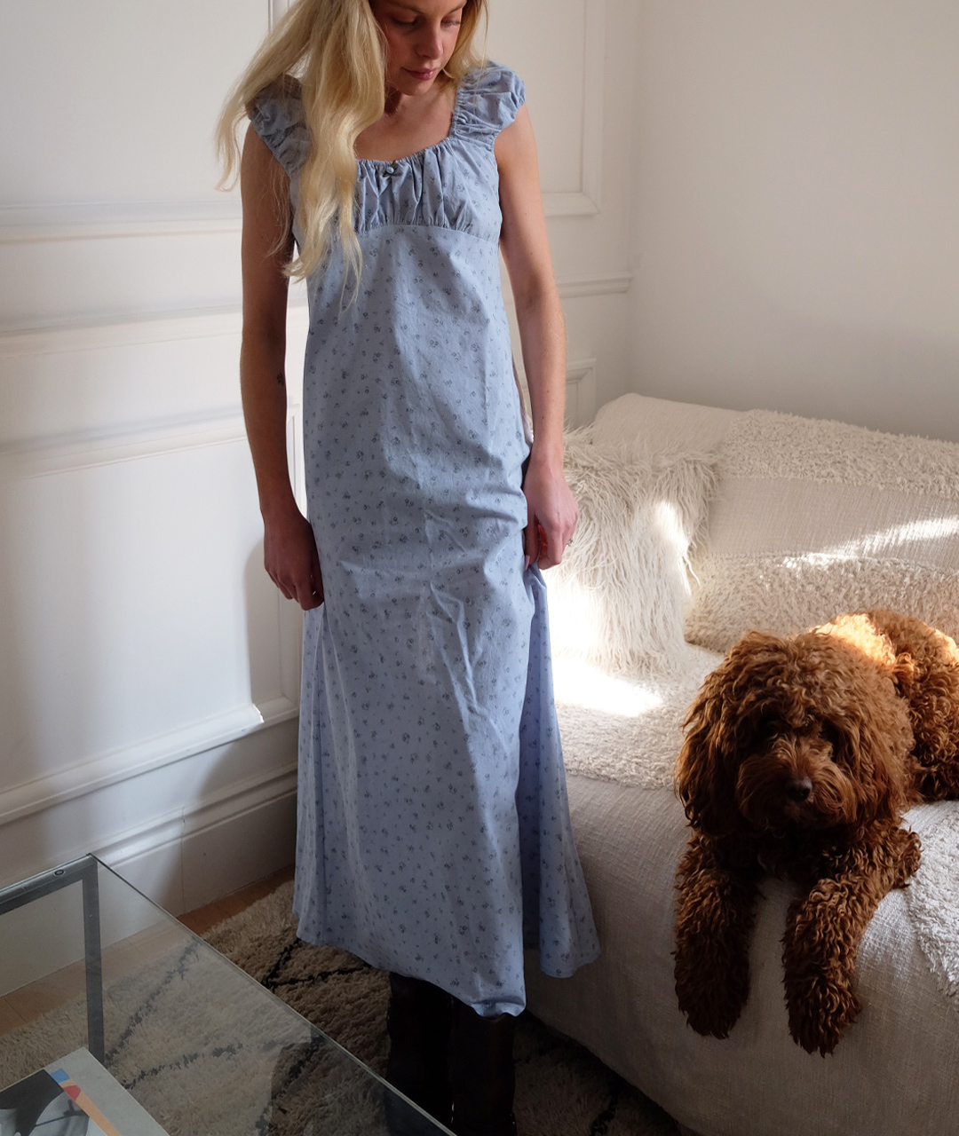 파란색의 원피스는, 마치 영국의 봄날을 떠올리게 하는 은은한 파란색에 작은 꽃들이 어우러져, 공원과 잔잔한 강변을 따라 산책하는 듯한 기분으로 입어보실 수 있어요.
