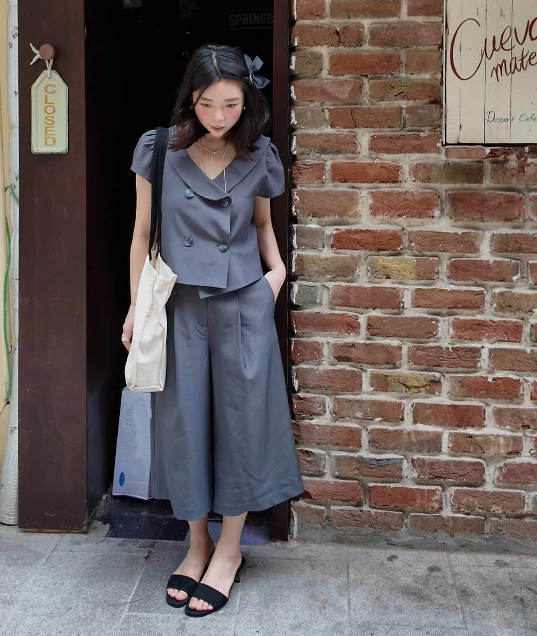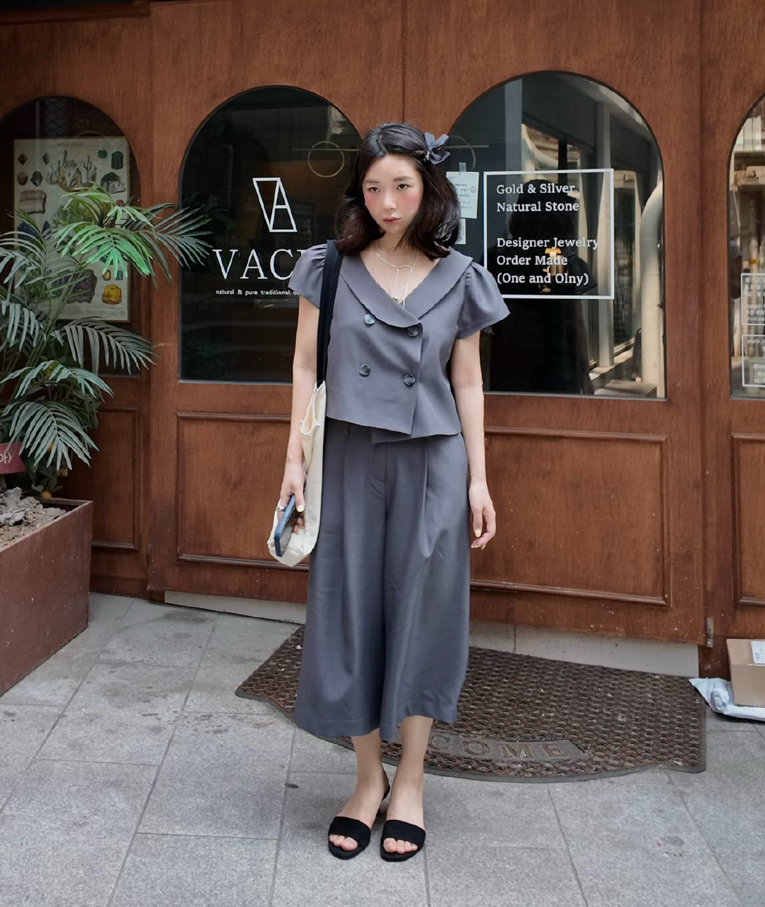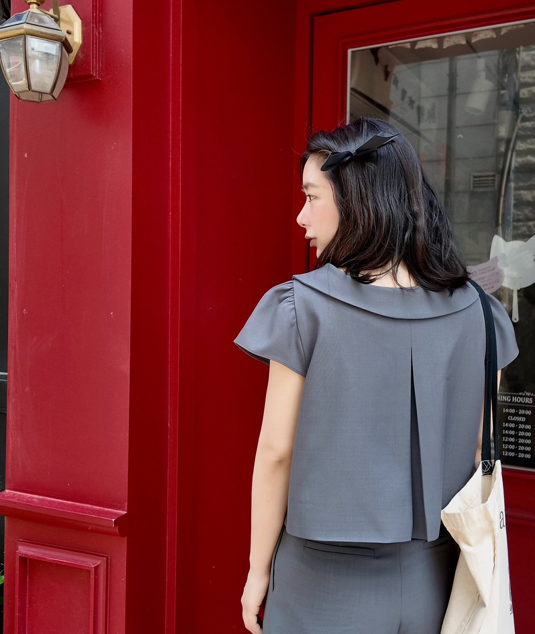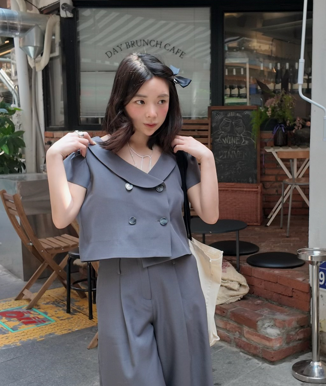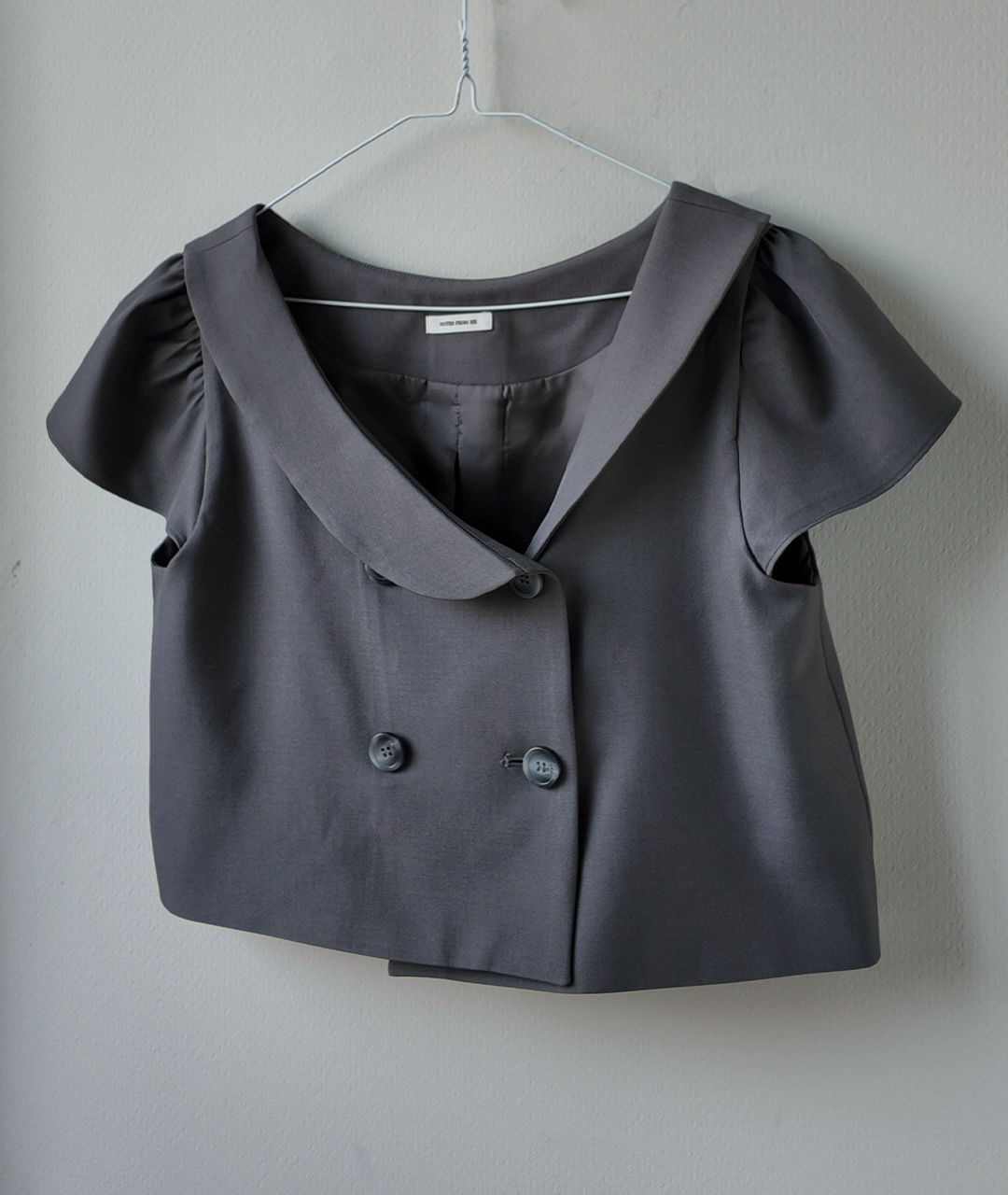 그레이 수트에서 영감을 받아 Notes from He만의 감성을 담아 디자인한, 짧은 기장의 더블 버튼 자켓 겸 블라우스입니다.