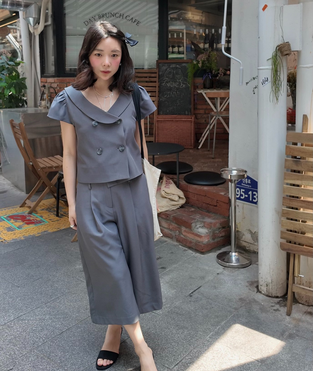 기존 쁘띠 블라우스에 여름의 감성을 더했습니다. 가볍게 파인 네크라인과 단정한 싱글 카라가 어우러져,