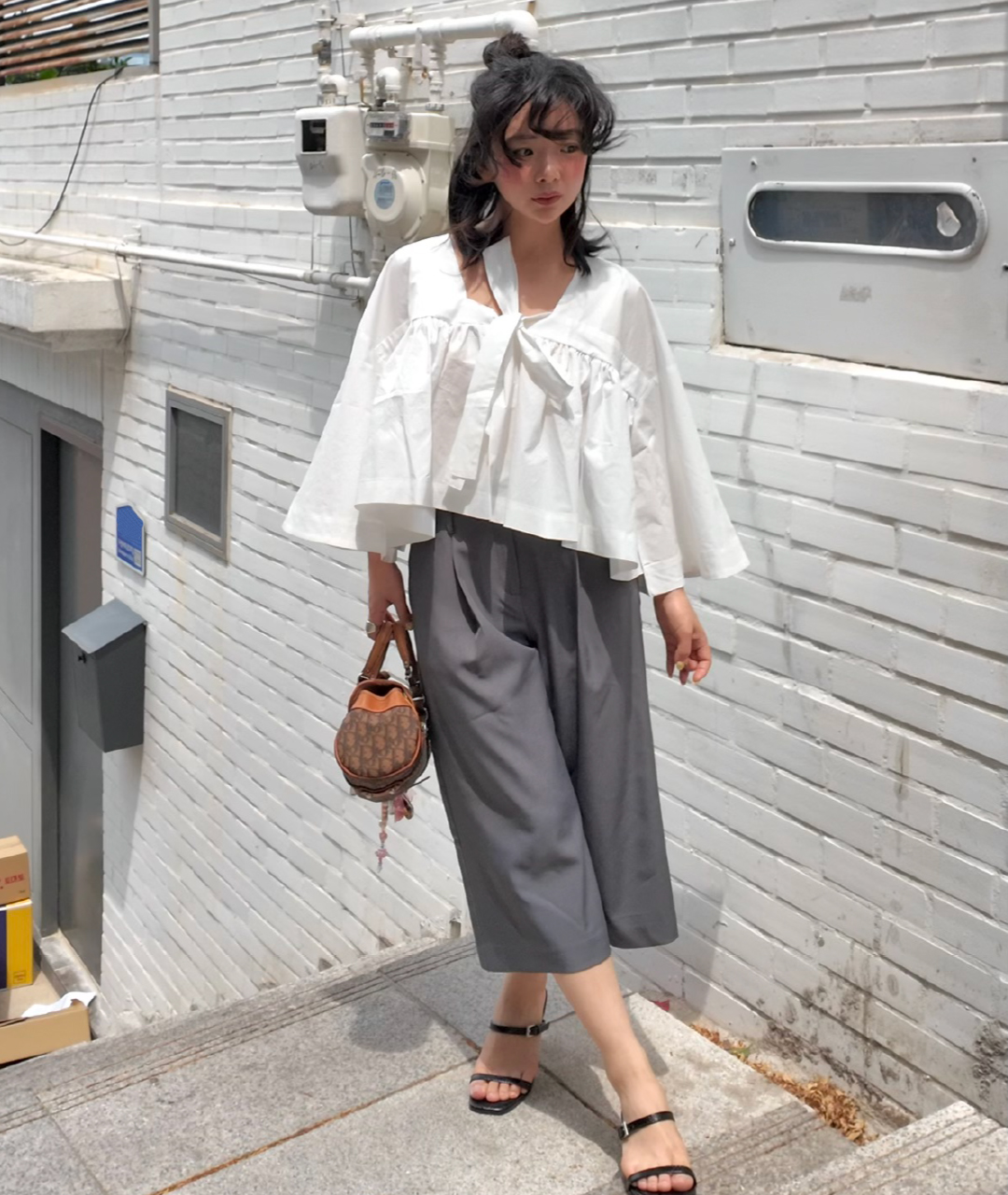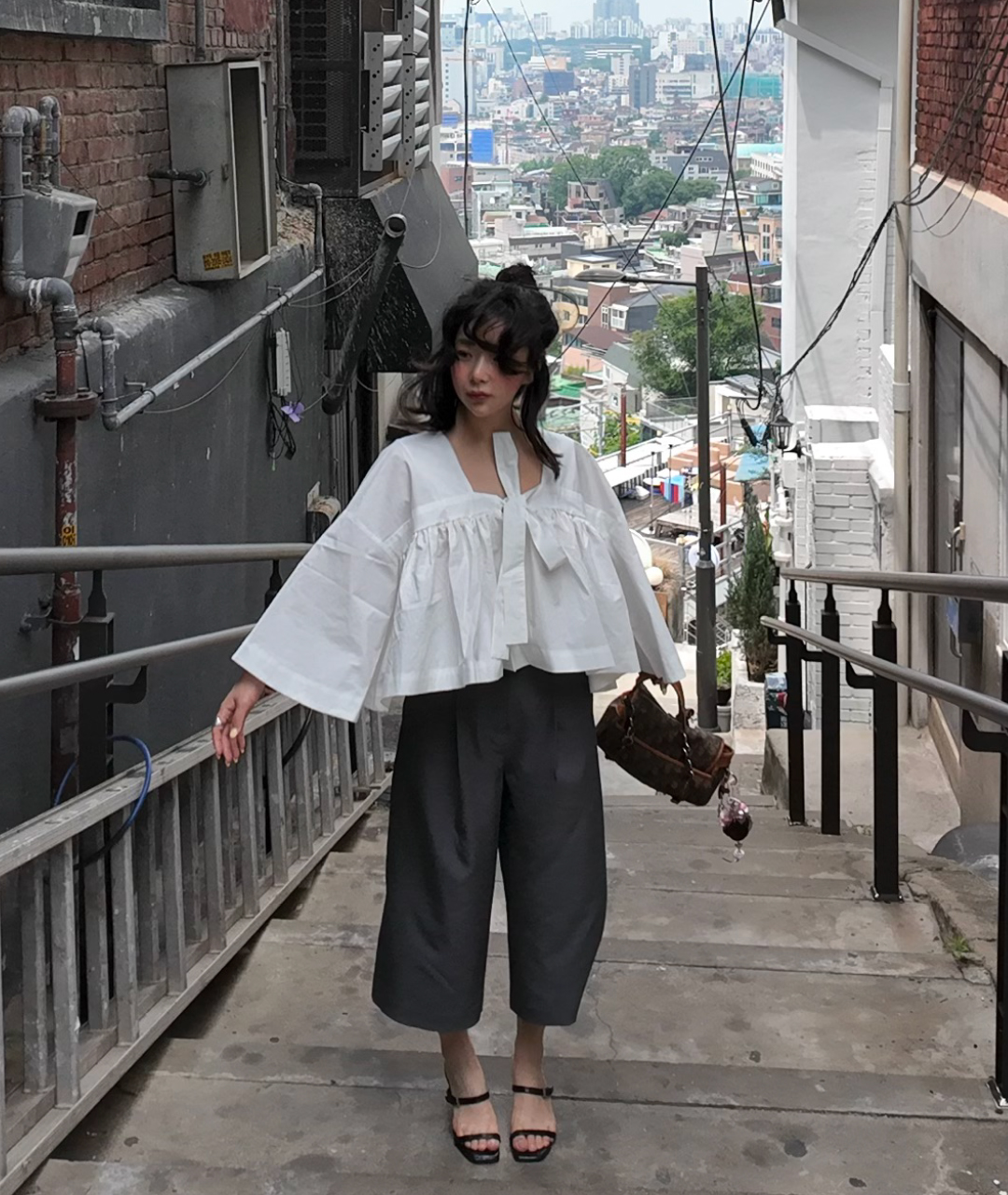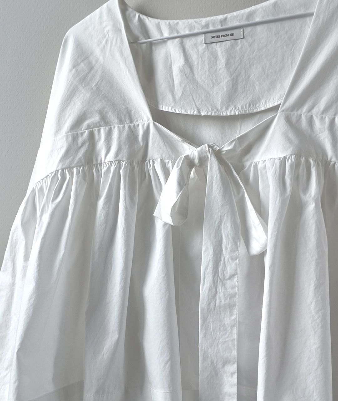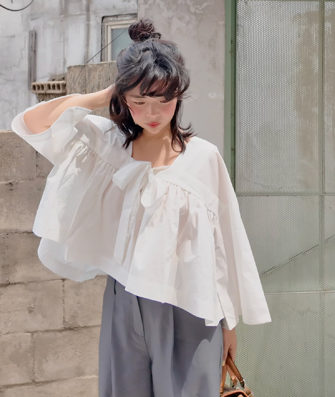 스퀘어 넥과 중앙에 큼지막한 리본 디테일이 여성스러움을 더해주며,