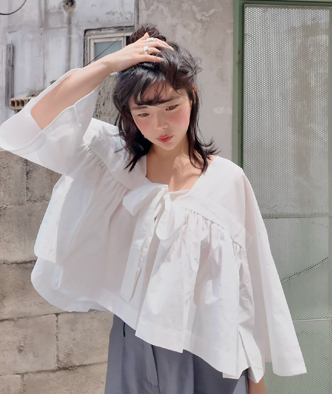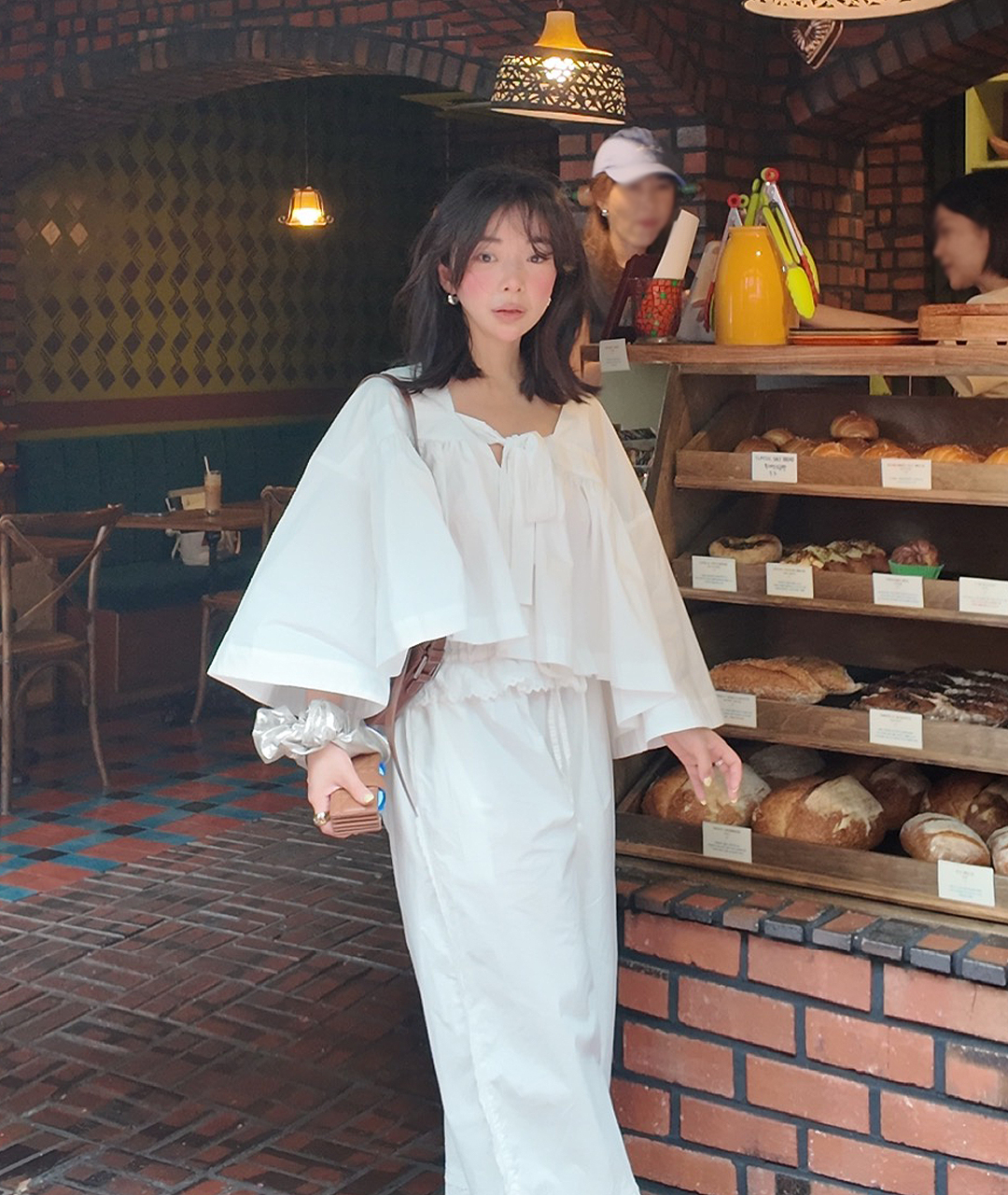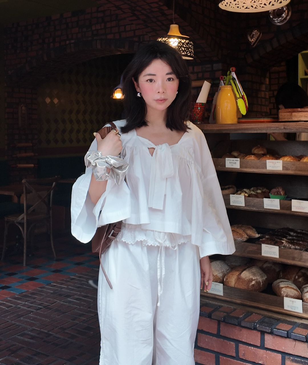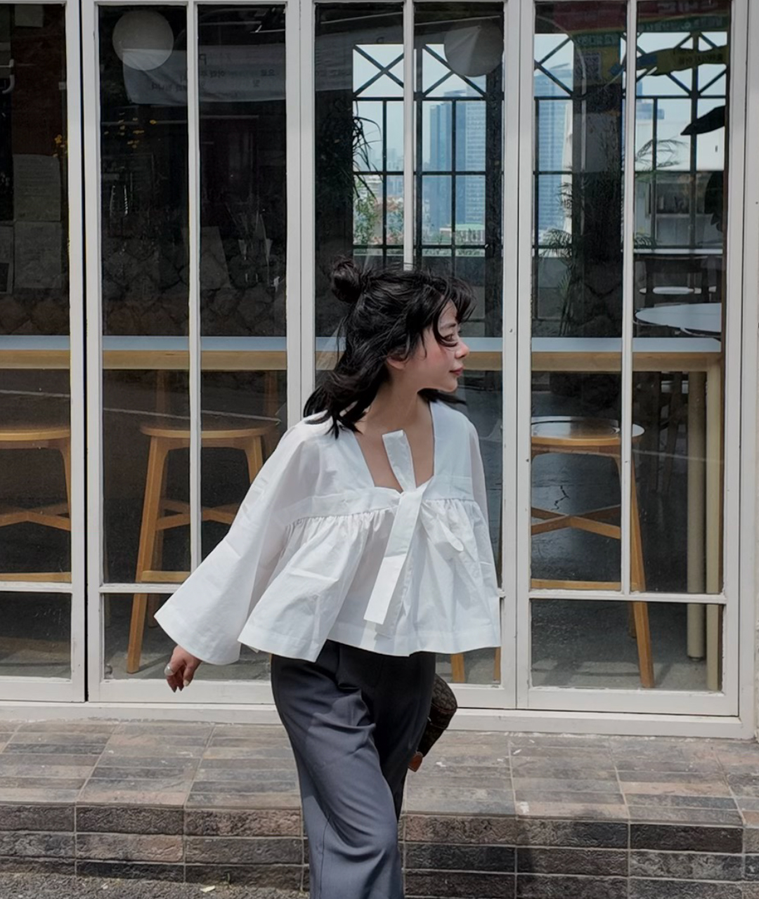 스퀘어 넥과 중앙에 큼지막한 리본 디테일이 여성스러움을 더해주며,