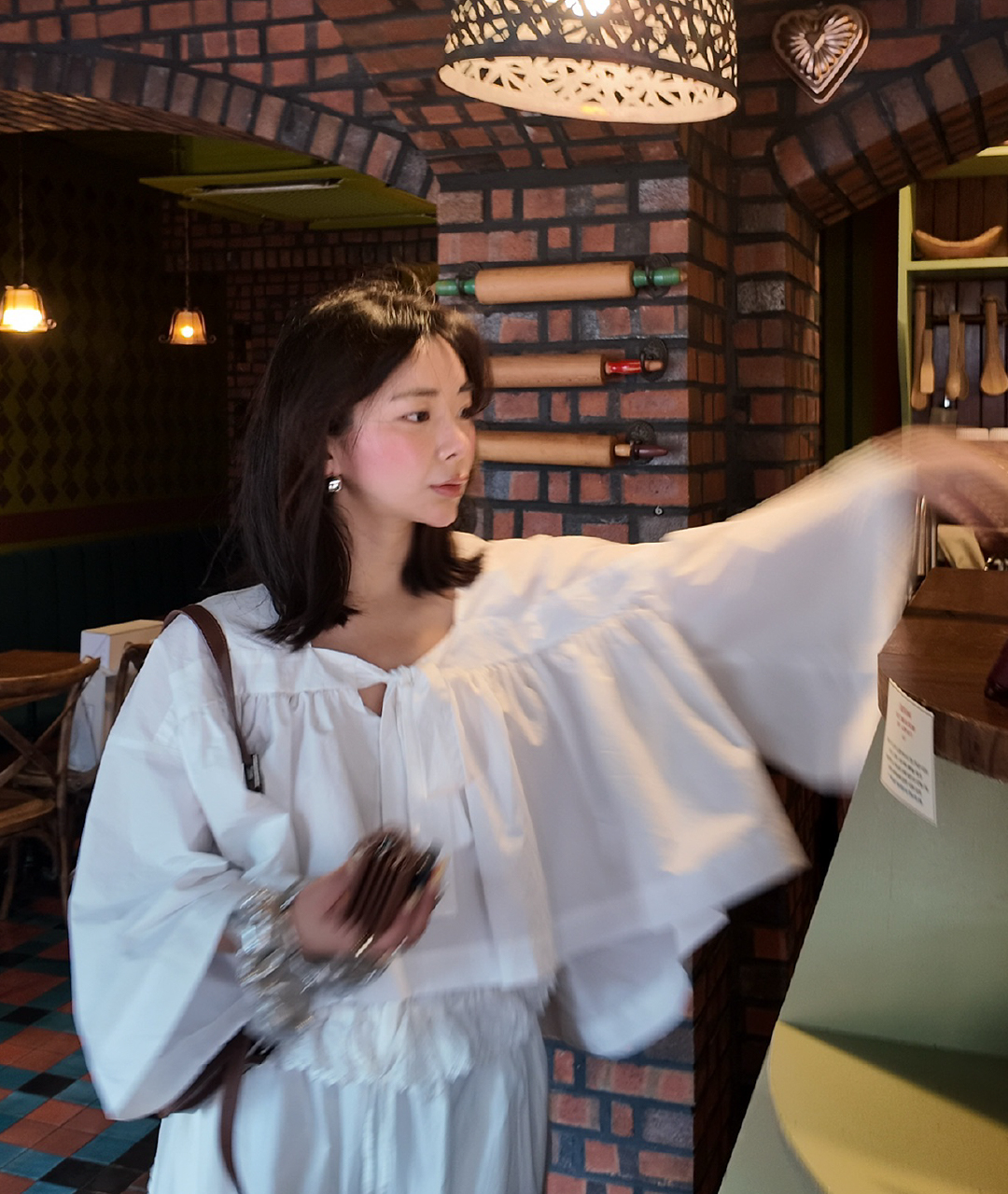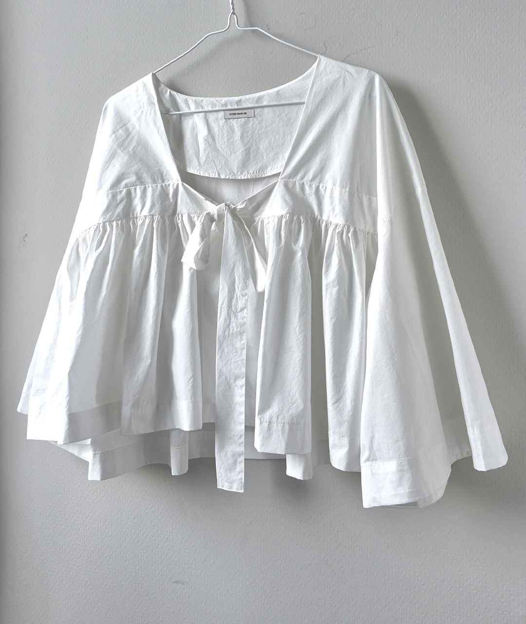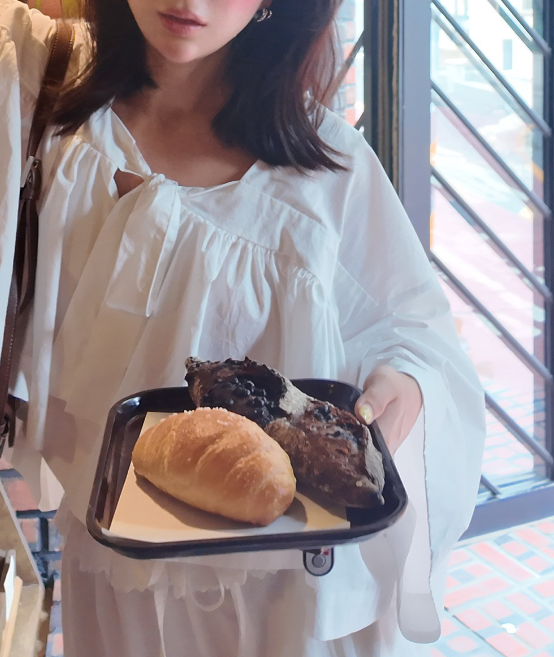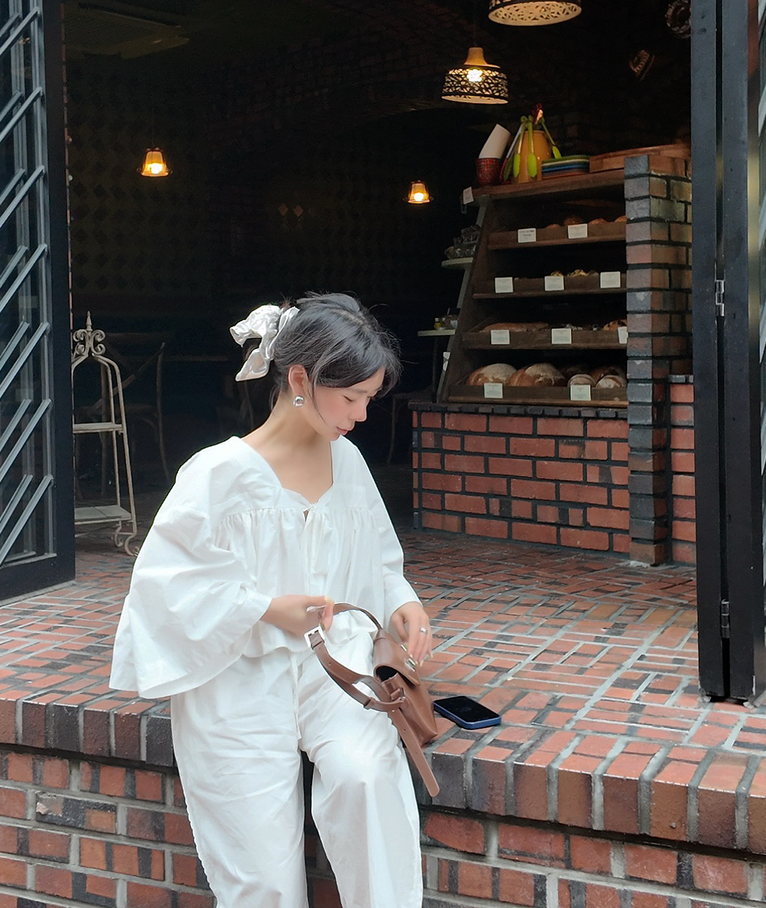 스퀘어 넥과 중앙에 큼지막한 리본 디테일이 여성스러움을 더해주며,