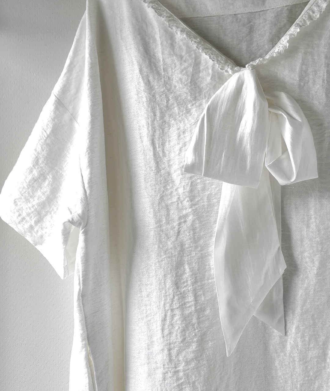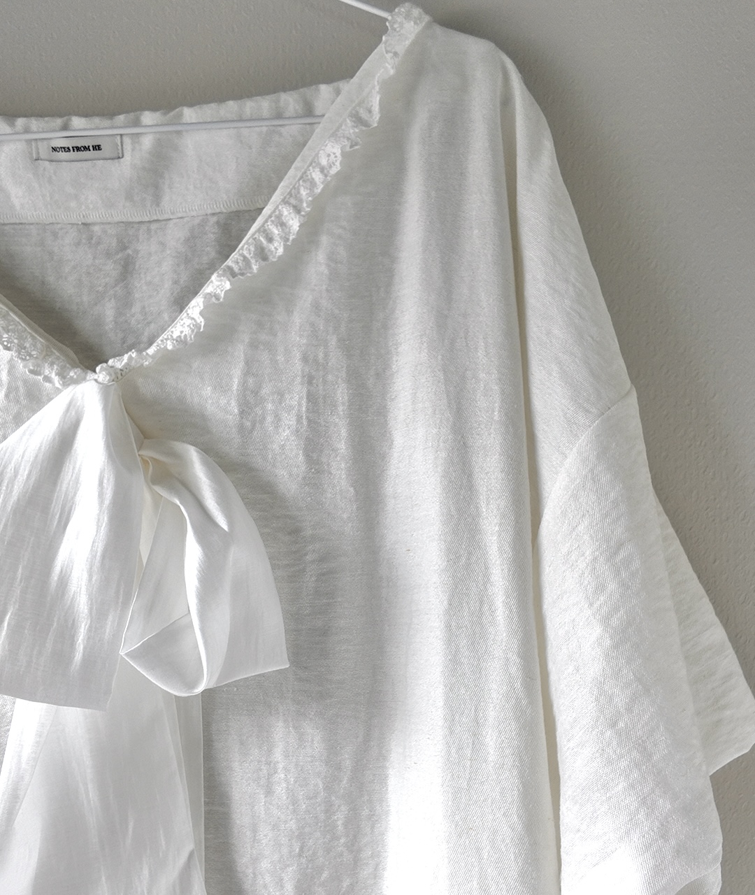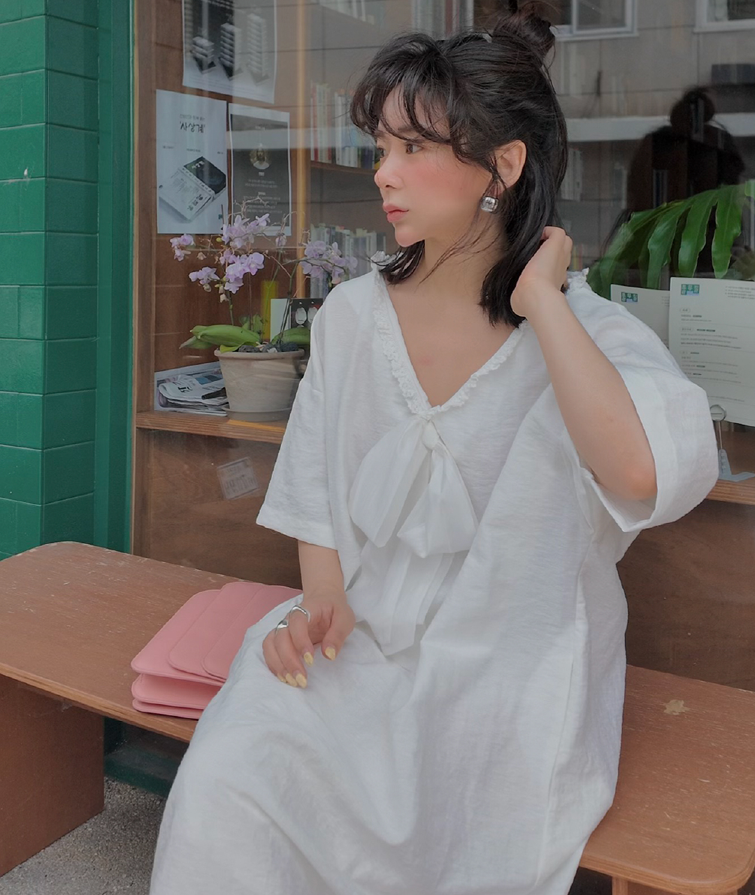 넥라인 중앙에는 길게 묶어 큰 리본으로 연출할 수 있는 러블리한 포인트까지 놓치지 않았습니다.