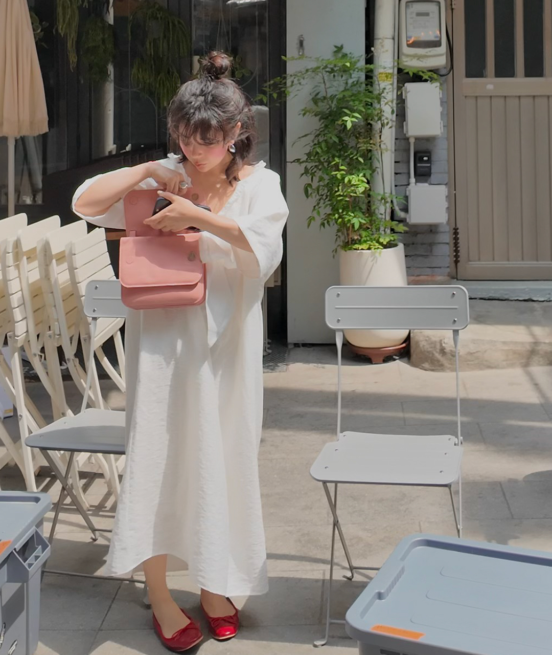 퓨어한 화이트 컬러의 레이온과 린넨 혼용 소재로 제작된 롱 원피스입니다.