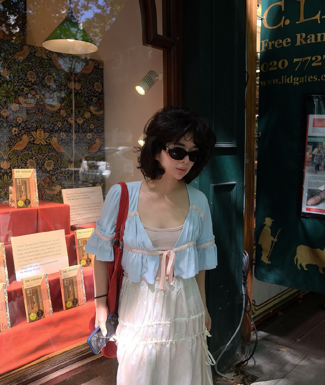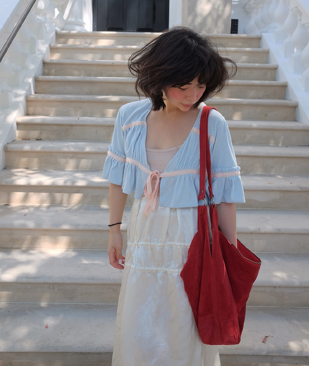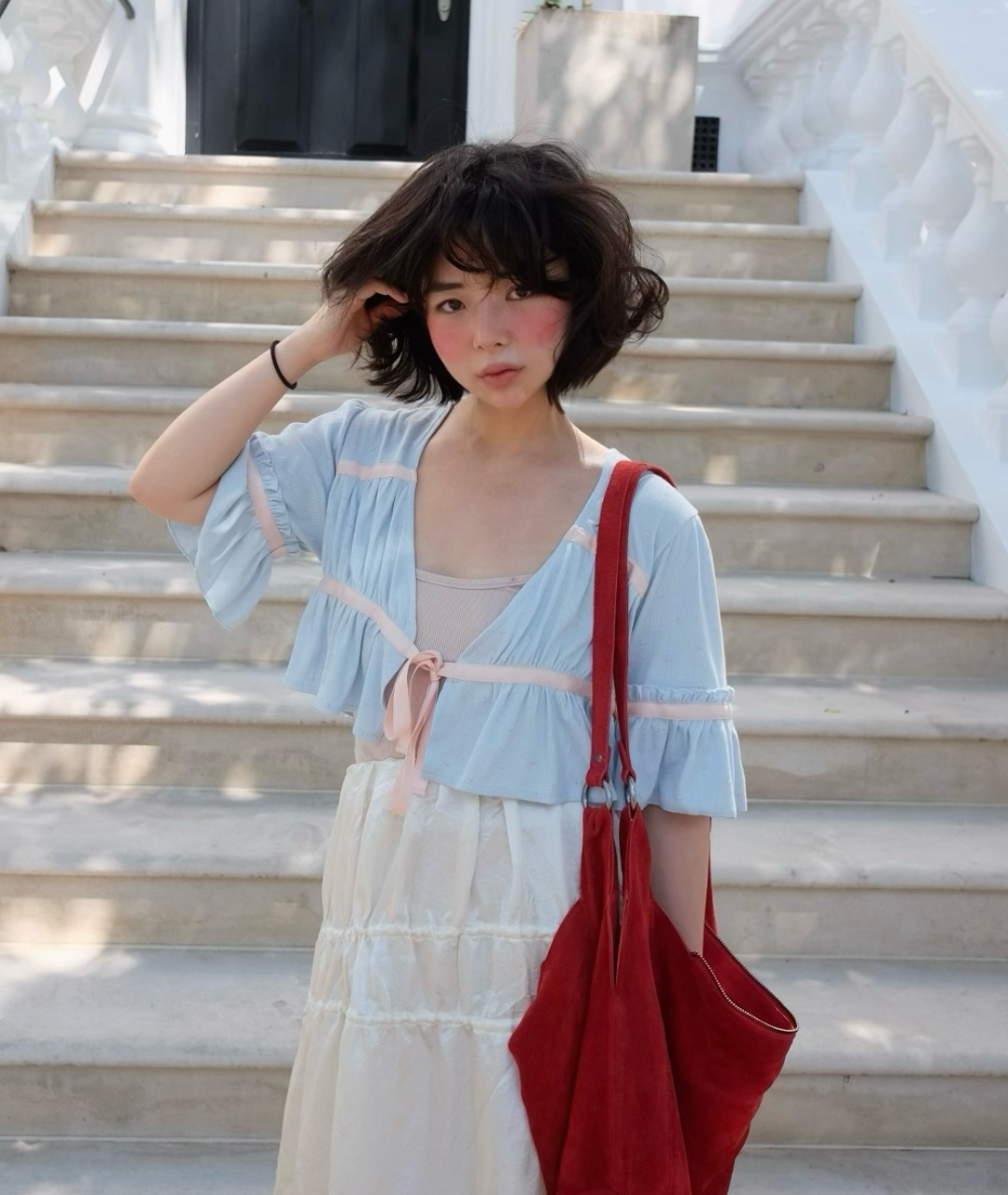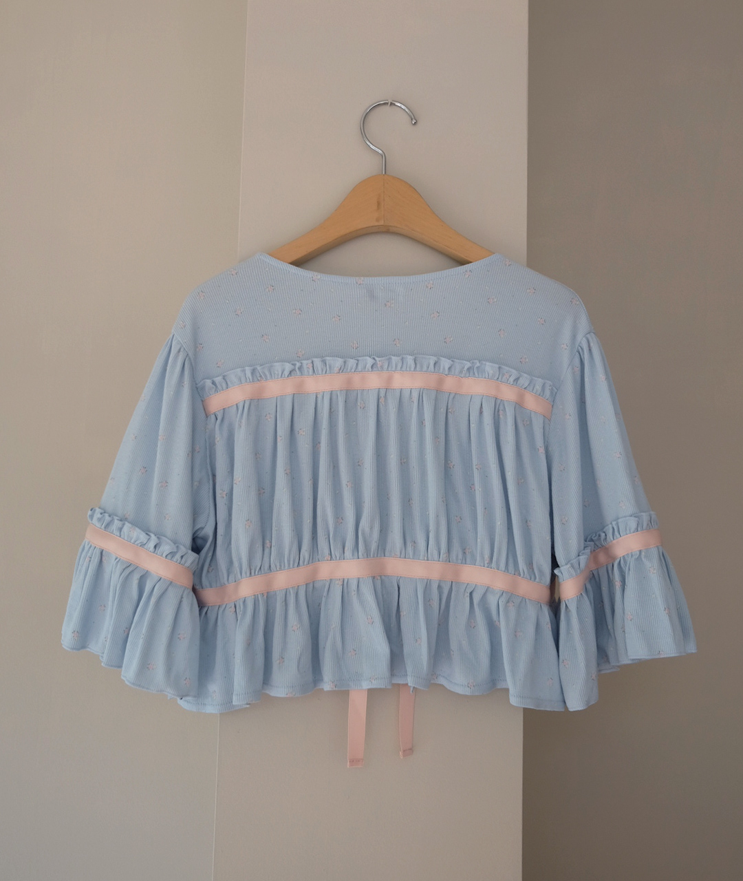 사랑스러운 빈티지 무드가 느껴지는 연파랑 베이스의 샬롯 리본타이 가디건입니다.