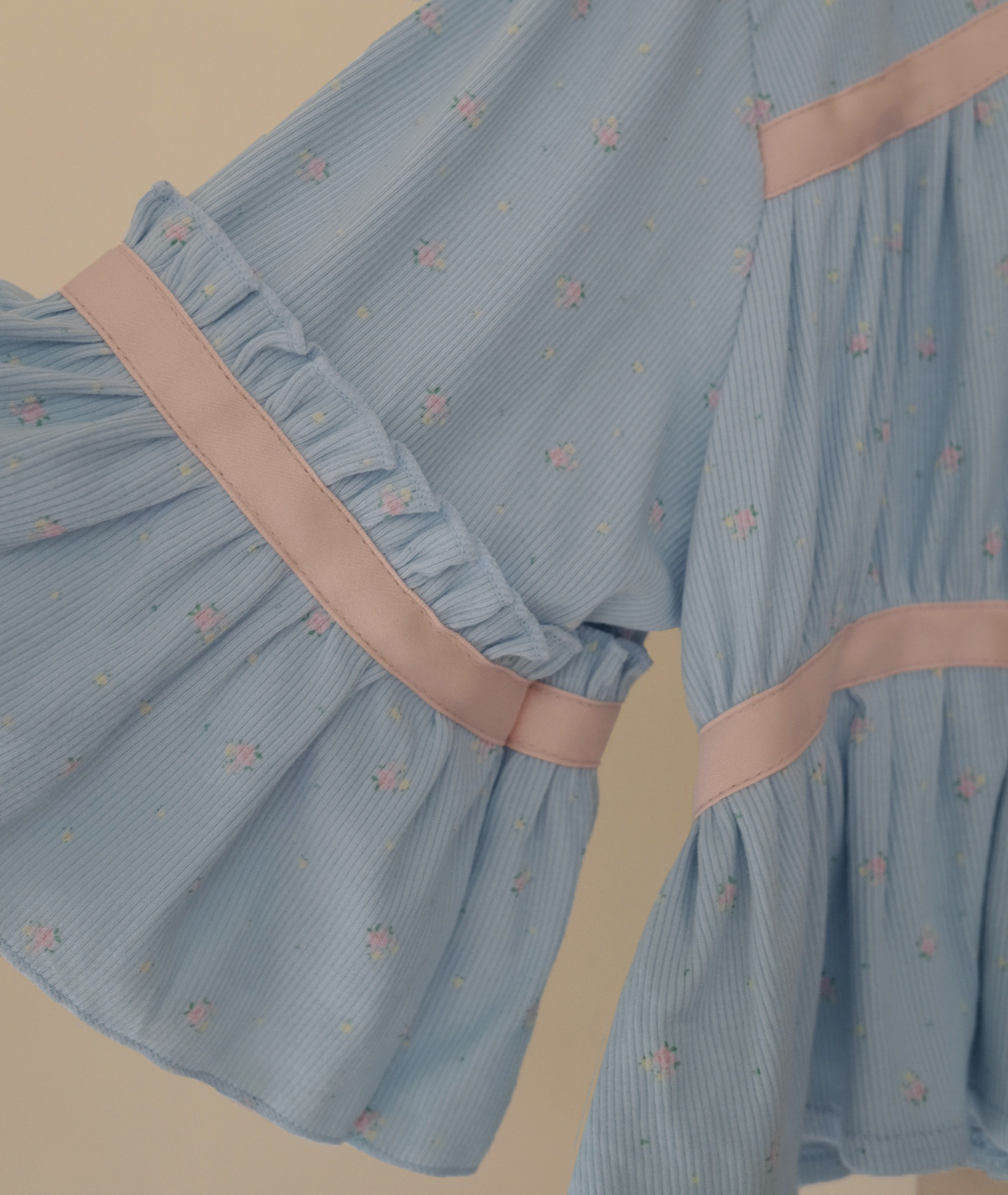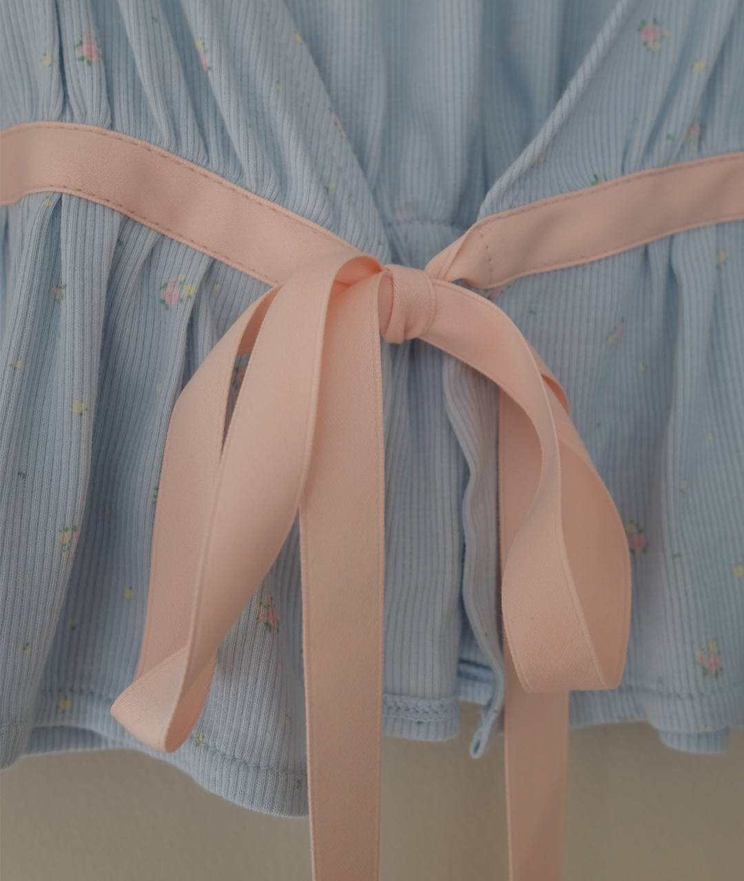 은은한 잔꽃 패턴 위에 분홍빛 공단 리본과 셔링 디테일이 더해져 로맨틱한 분위기를 연출합니다.