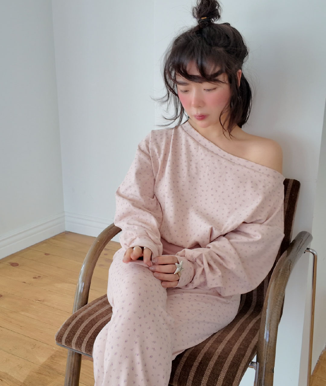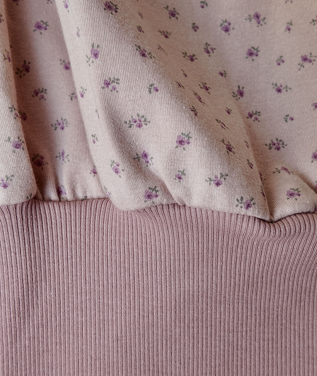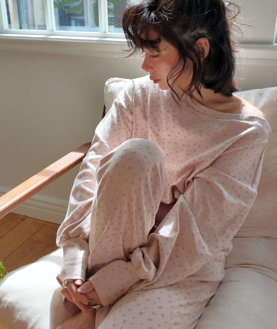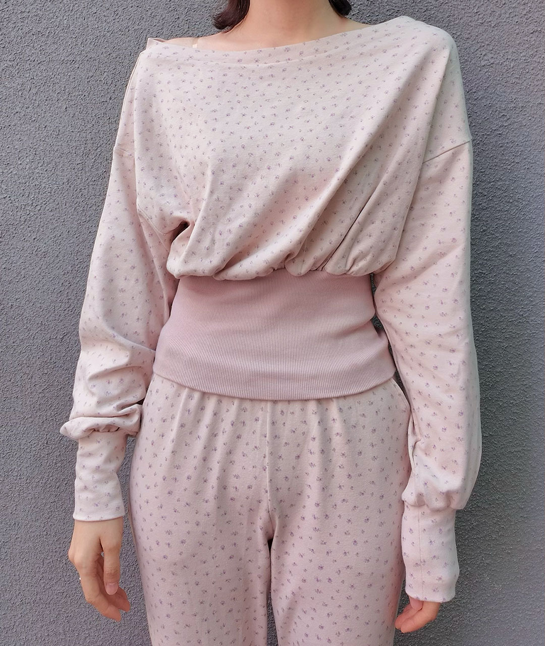 파우더리한 핑크 코튼에 보라색 잔꽃 무늬가 더해진 루즈 핏 긴팔 상의로, 허리 리빙 디테일이 여성스러운 실루엣을 잡아주며
