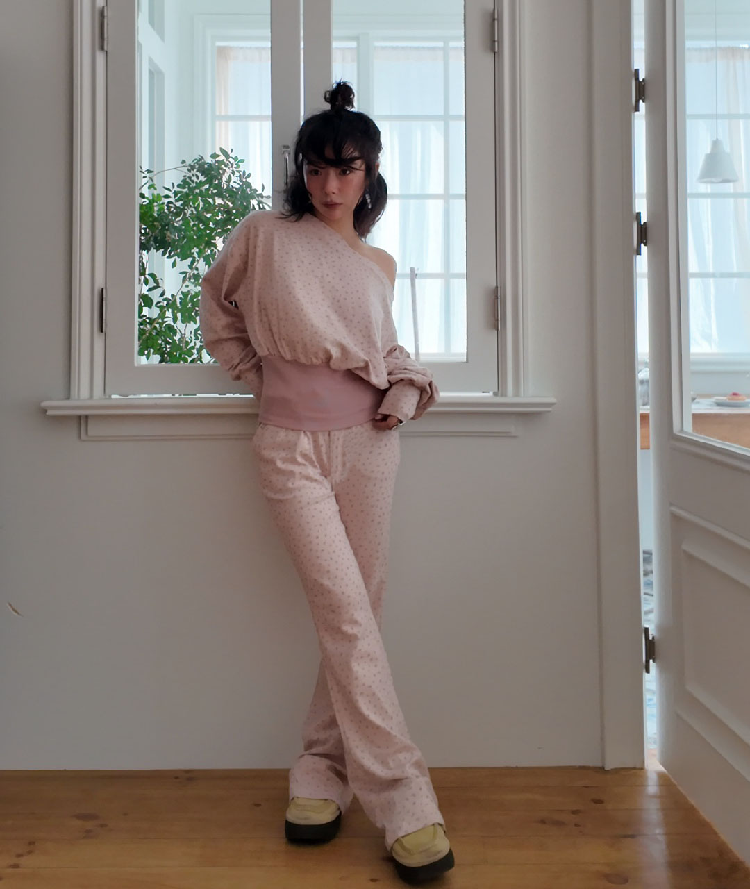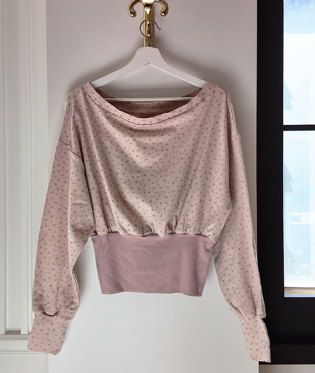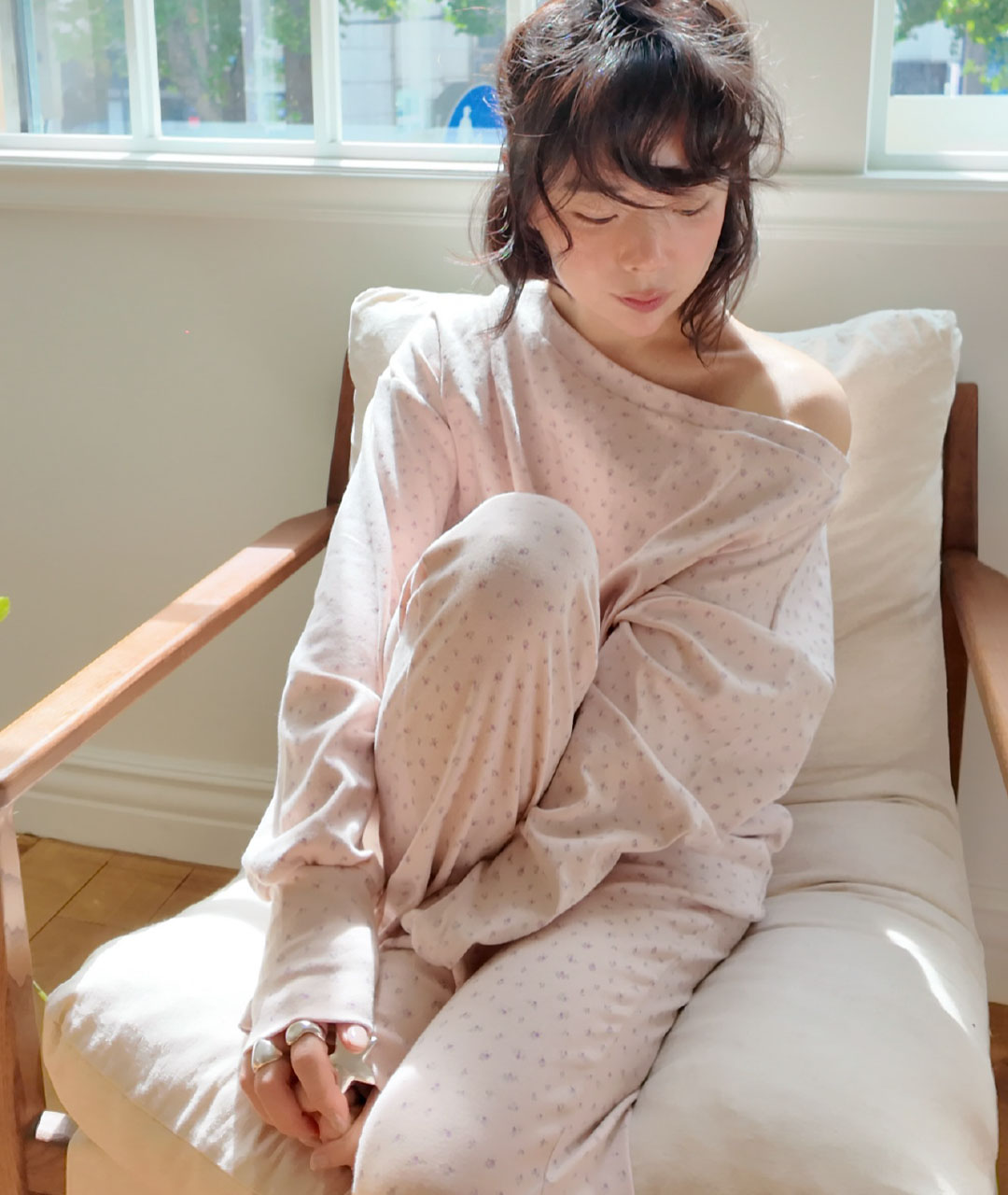 파우더리한 핑크 코튼에 보라색 잔꽃 무늬가 더해진 루즈 핏 긴팔 상의로, 허리 리빙 디테일이 여성스러운 실루엣을 잡아주며