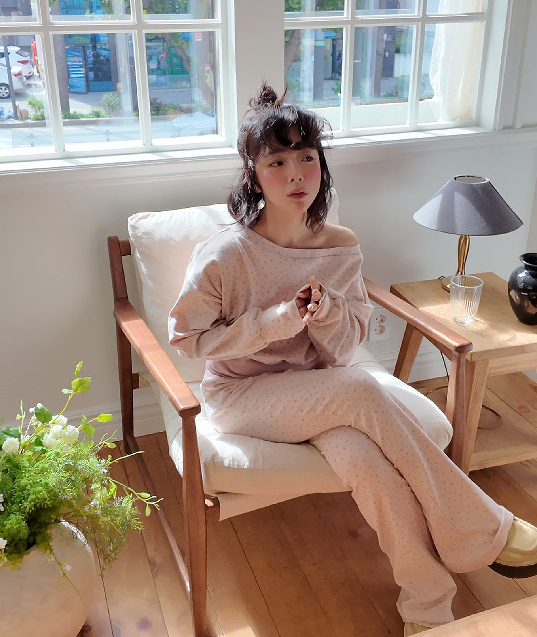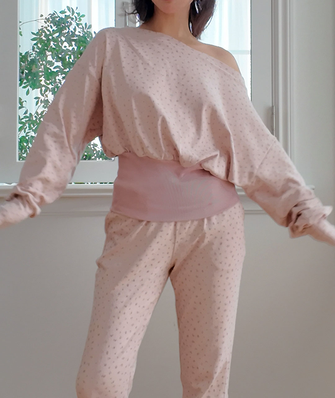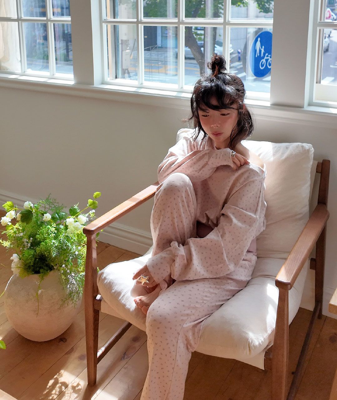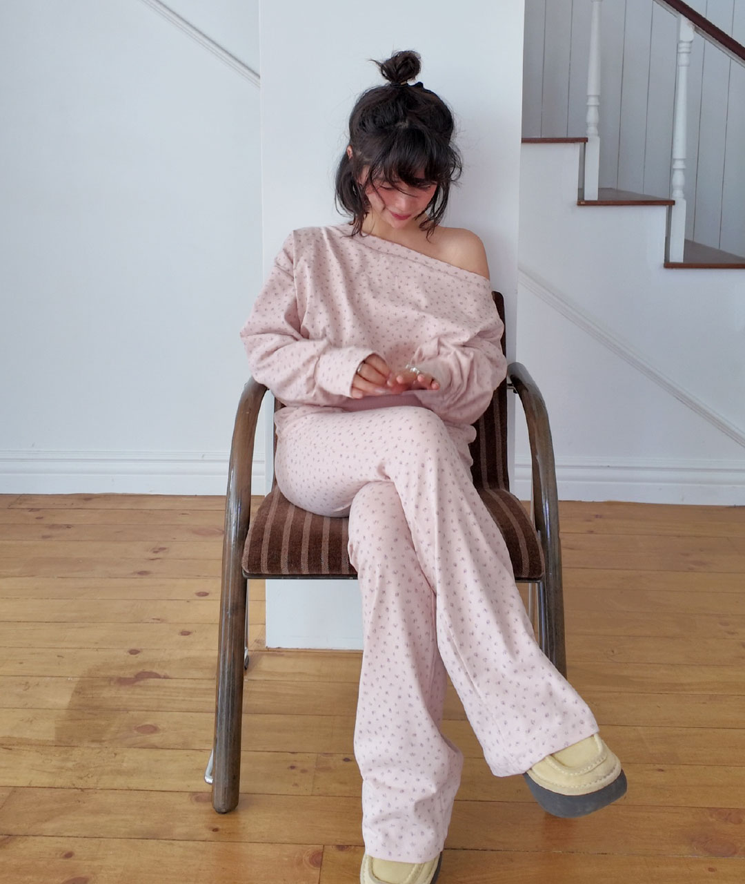 파우더리한 핑크 코튼에 보라색 잔꽃 무늬가 더해진 루즈 핏 긴팔 상의로, 허리 리빙 디테일이 여성스러운 실루엣을 잡아주며