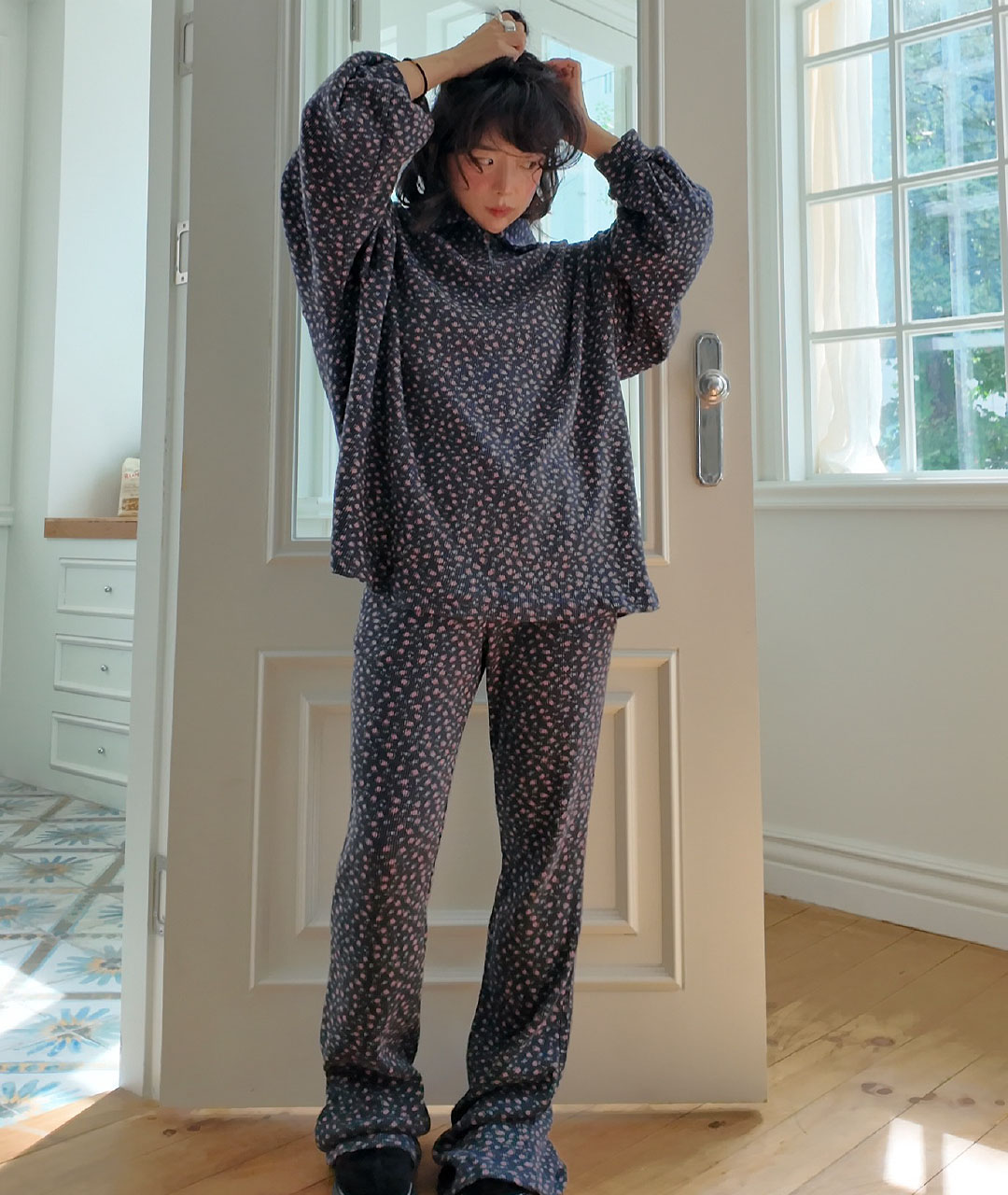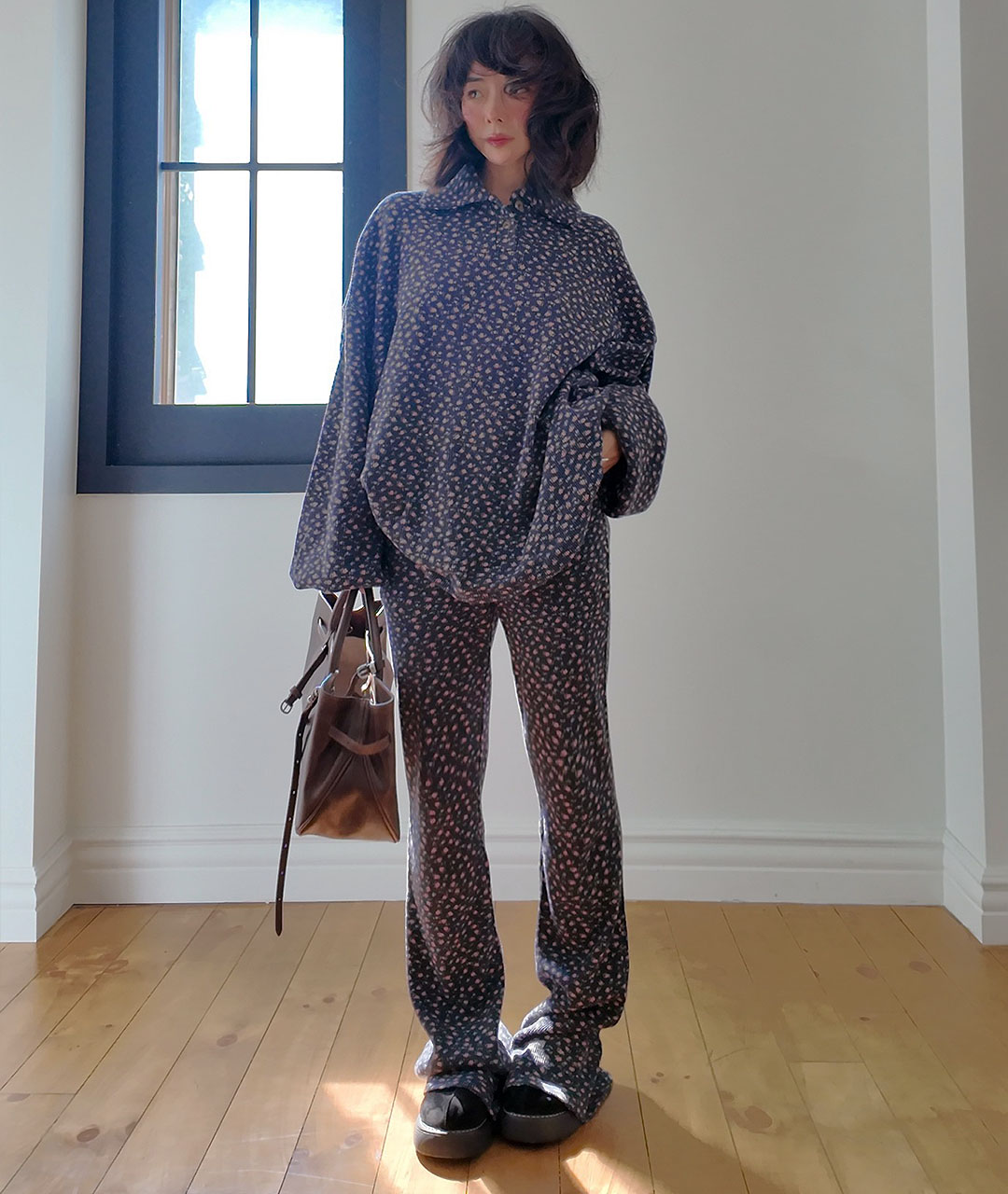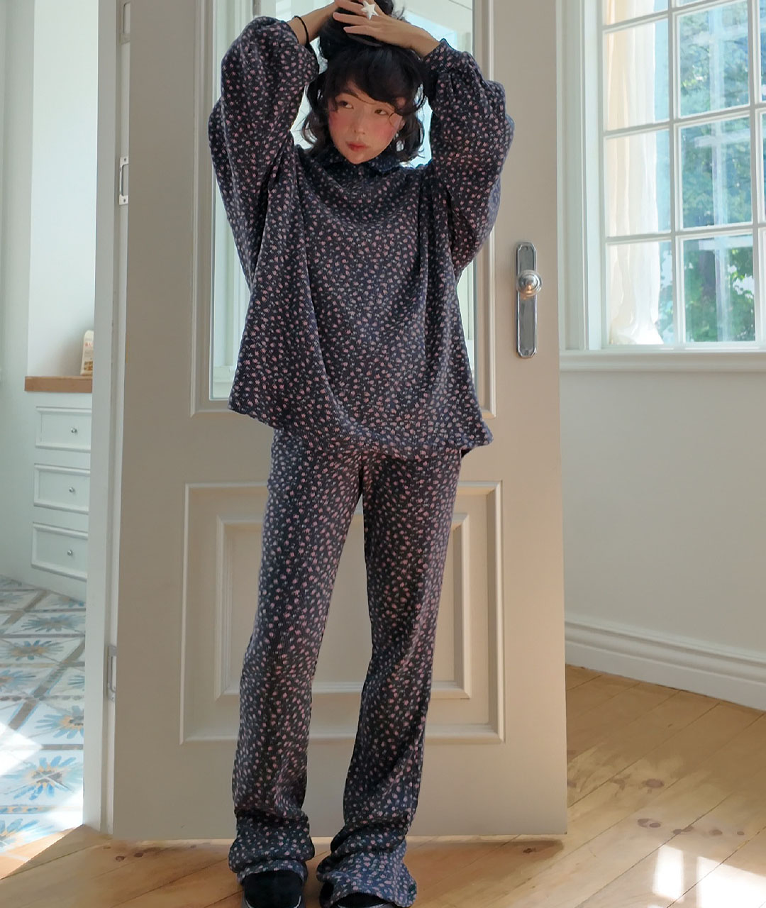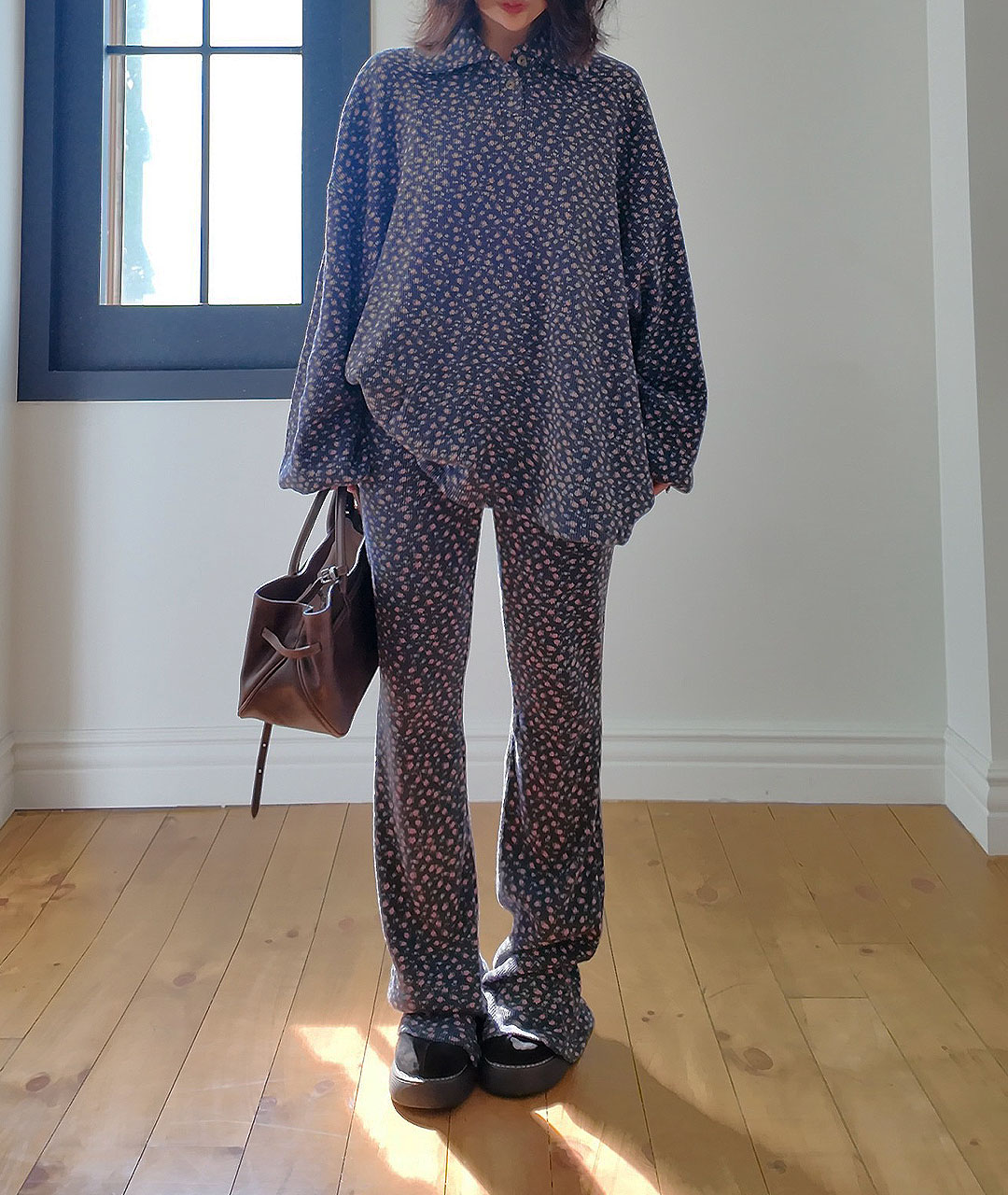 두께감이 더해진 와플 원단으로 제작된 Notes from He 잔꽃 패턴 부츠컷 팬츠입니다.