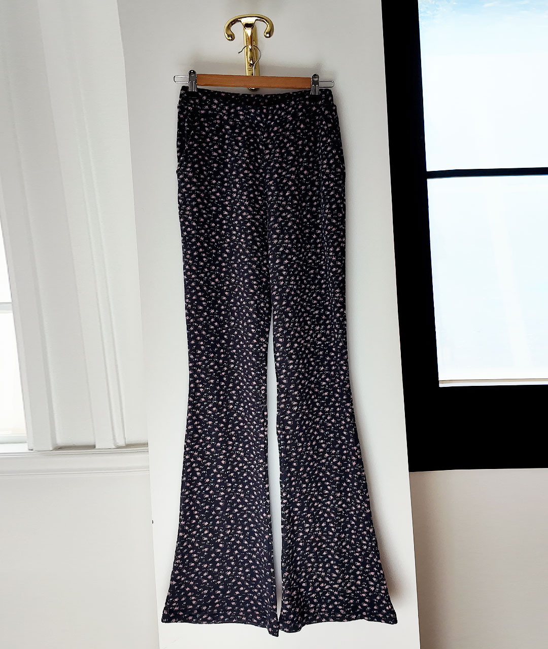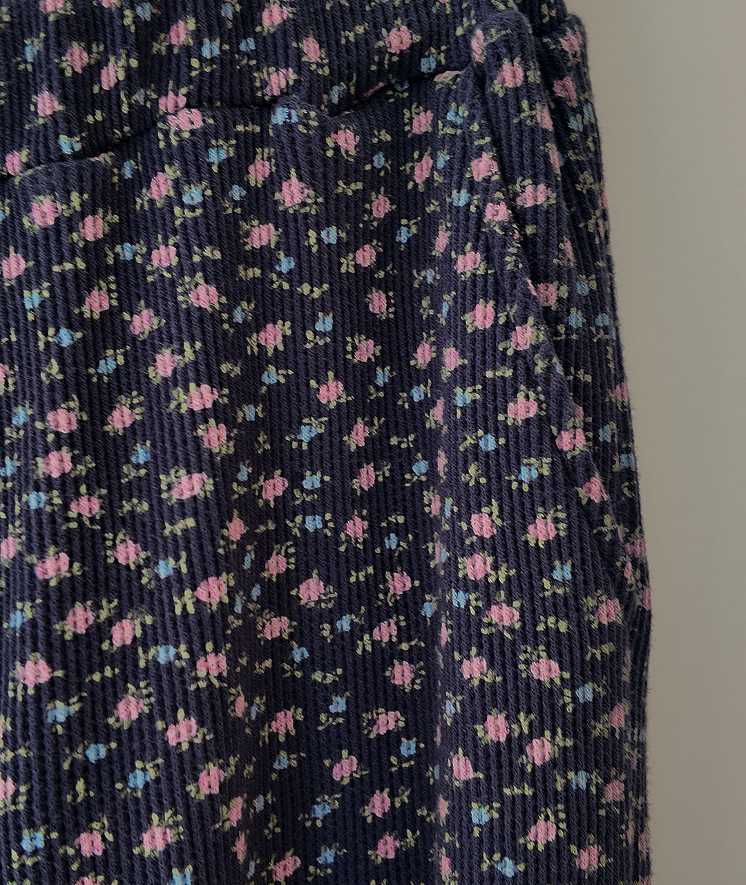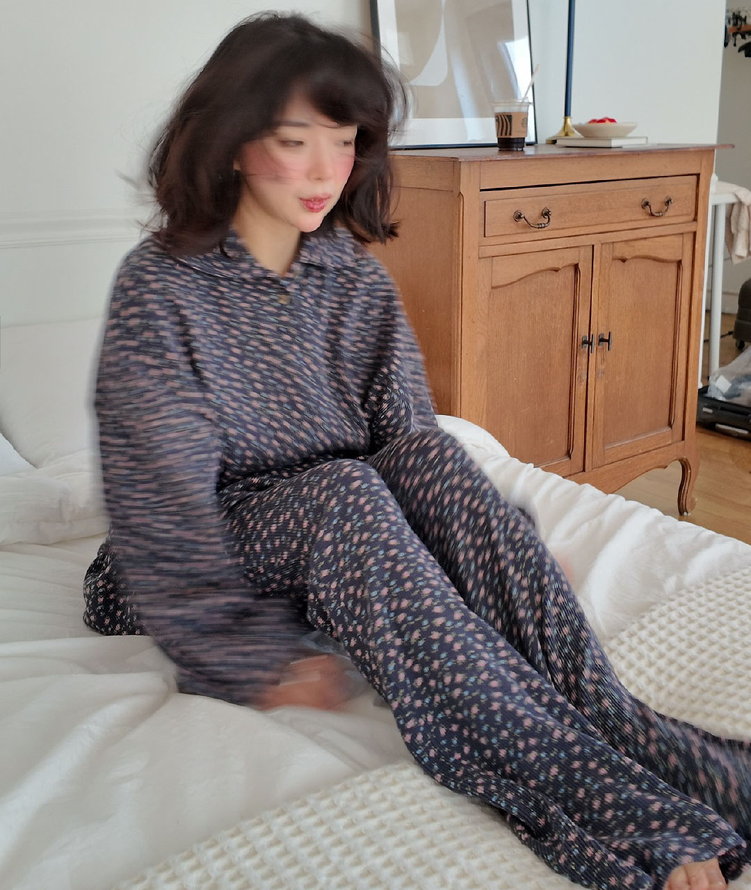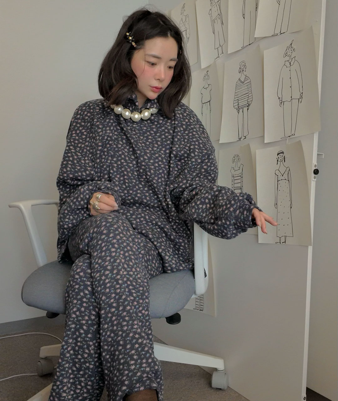 두께감이 더해진 와플 원단으로 제작된 Notes from He 잔꽃 패턴 부츠컷 팬츠입니다.