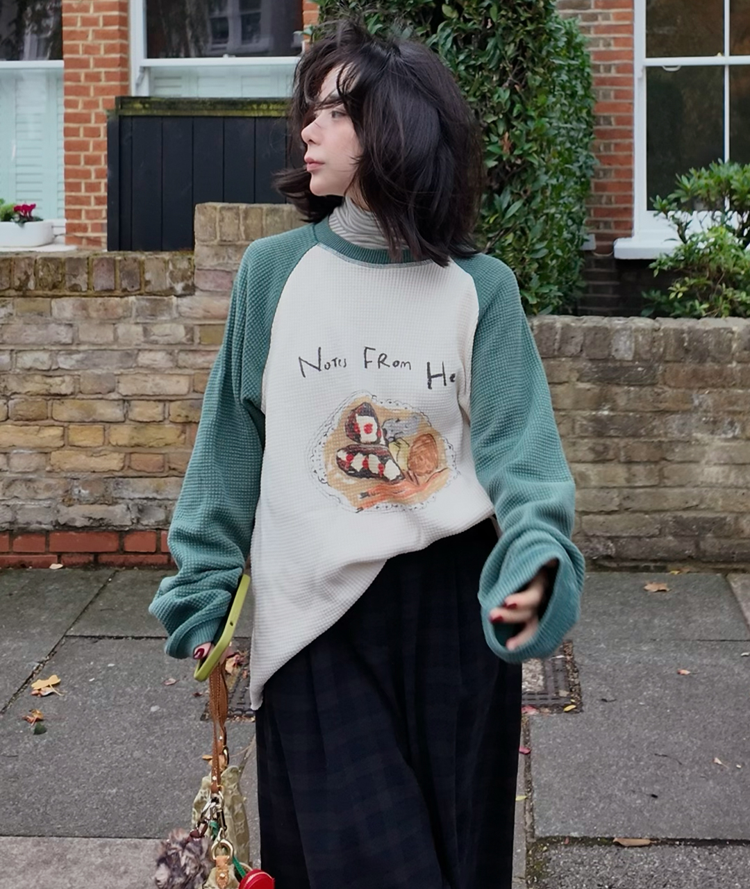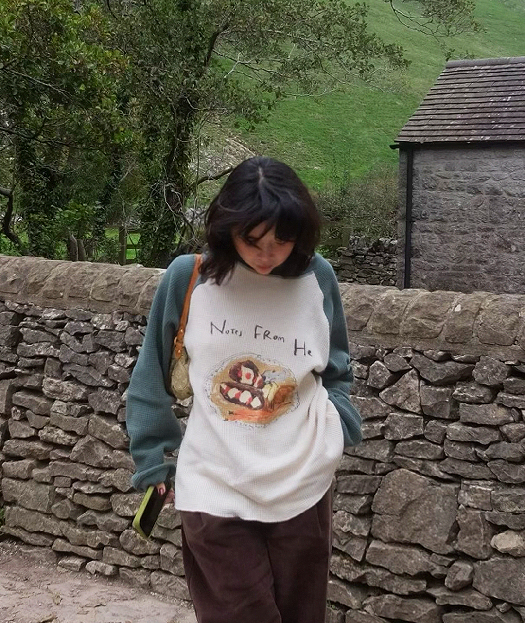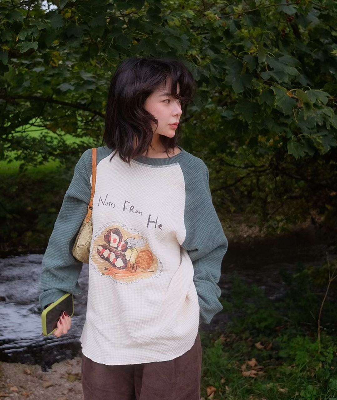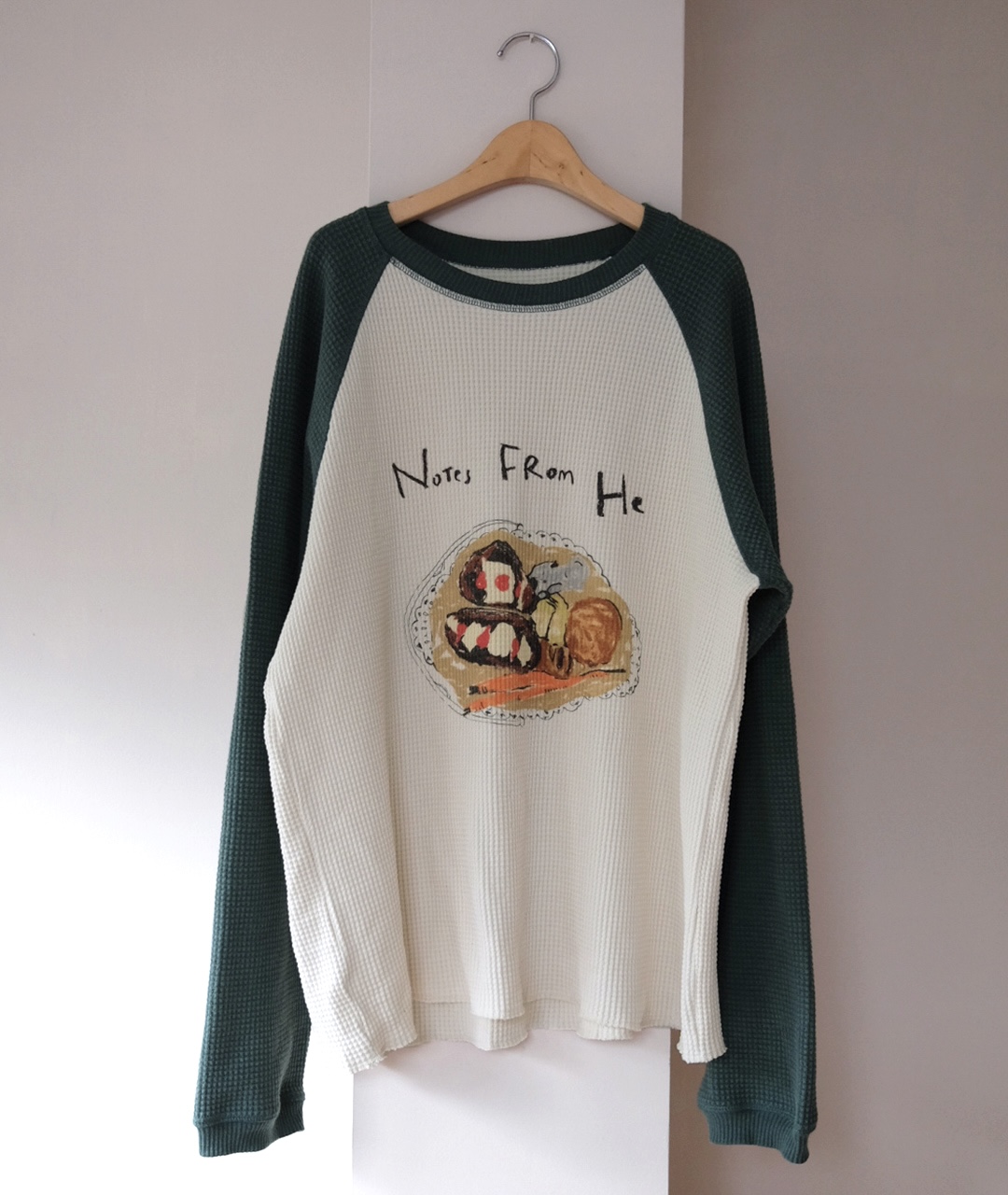 빈티지한 그린 톤의 배색 슬리브와 크림 컬러의 바디, 그리고 감각적인 프린팅이 He 특유의 감성을 담고 있습니다.