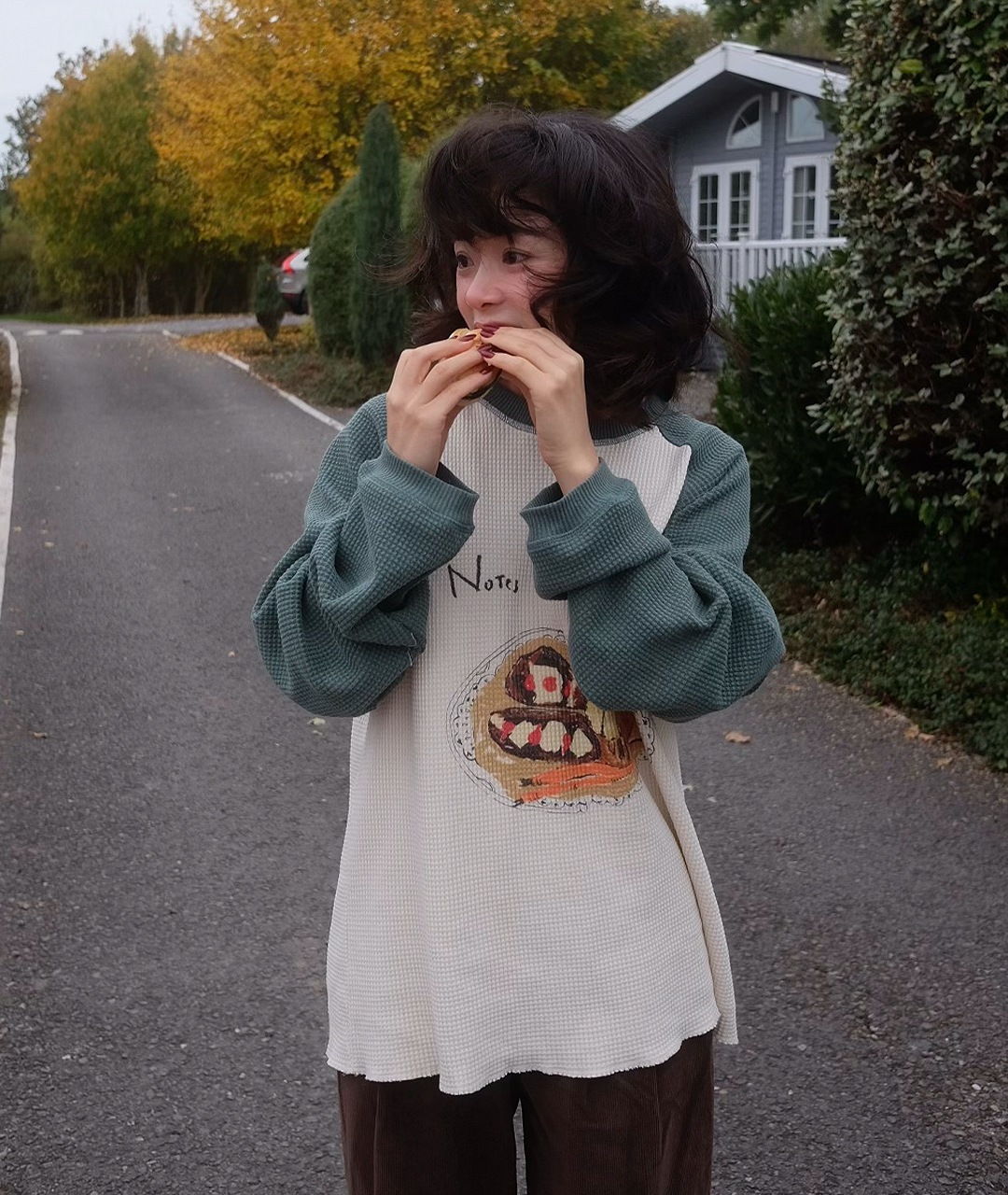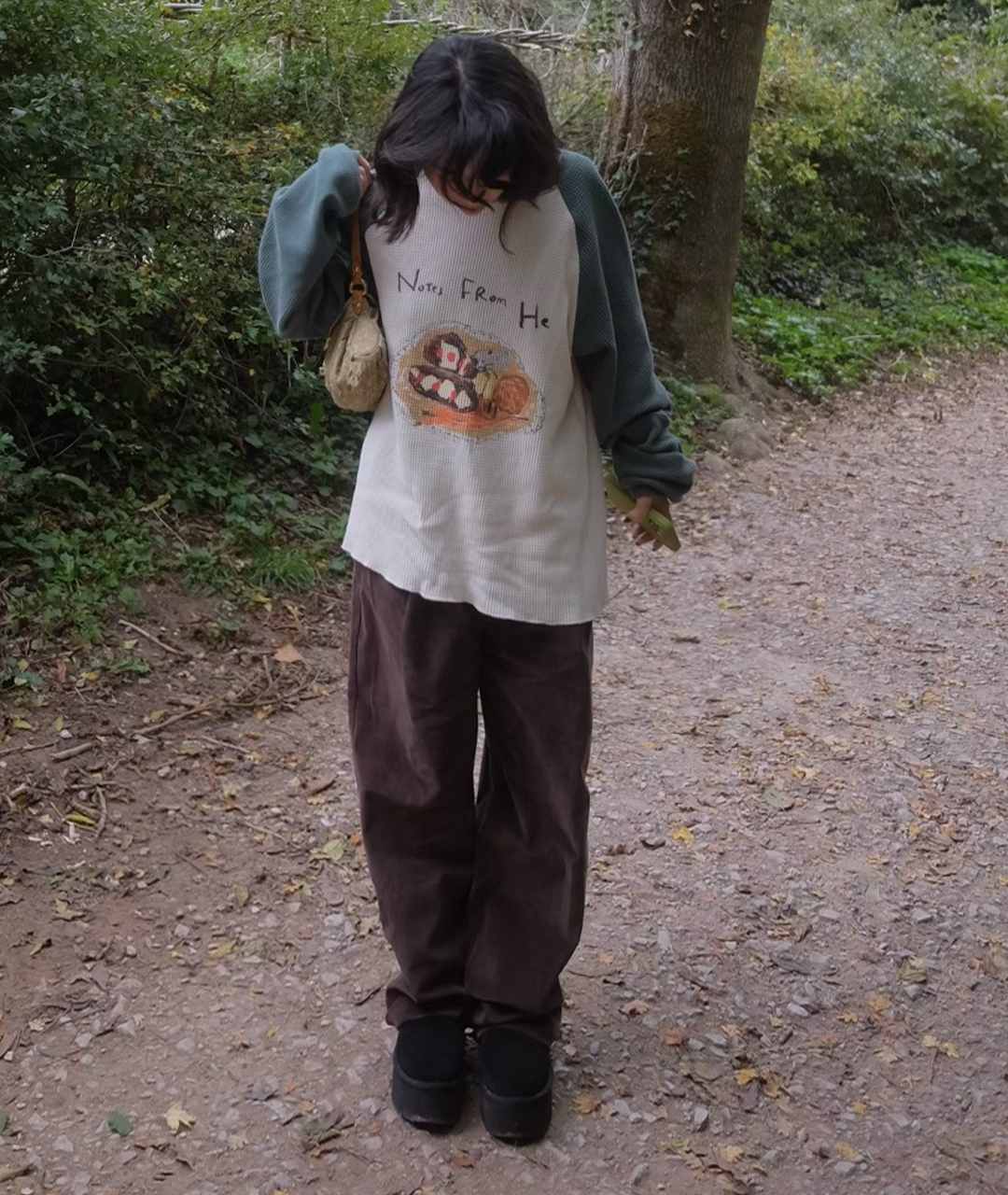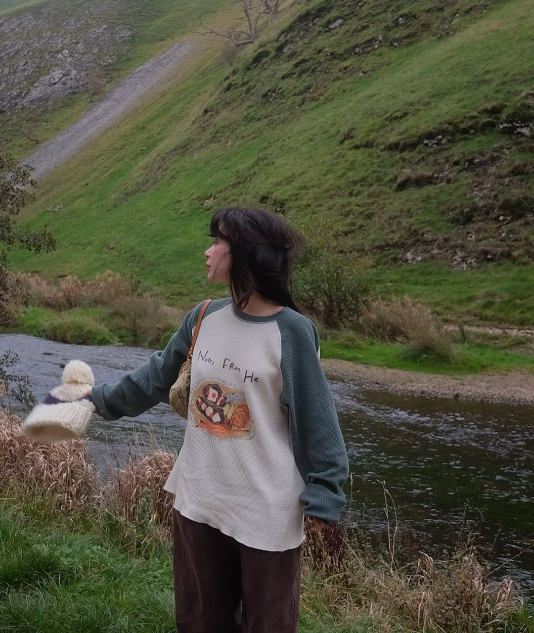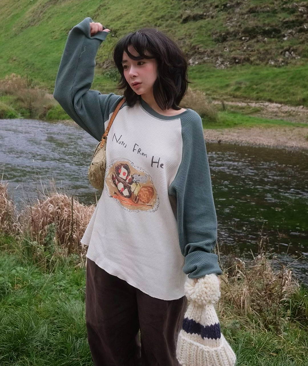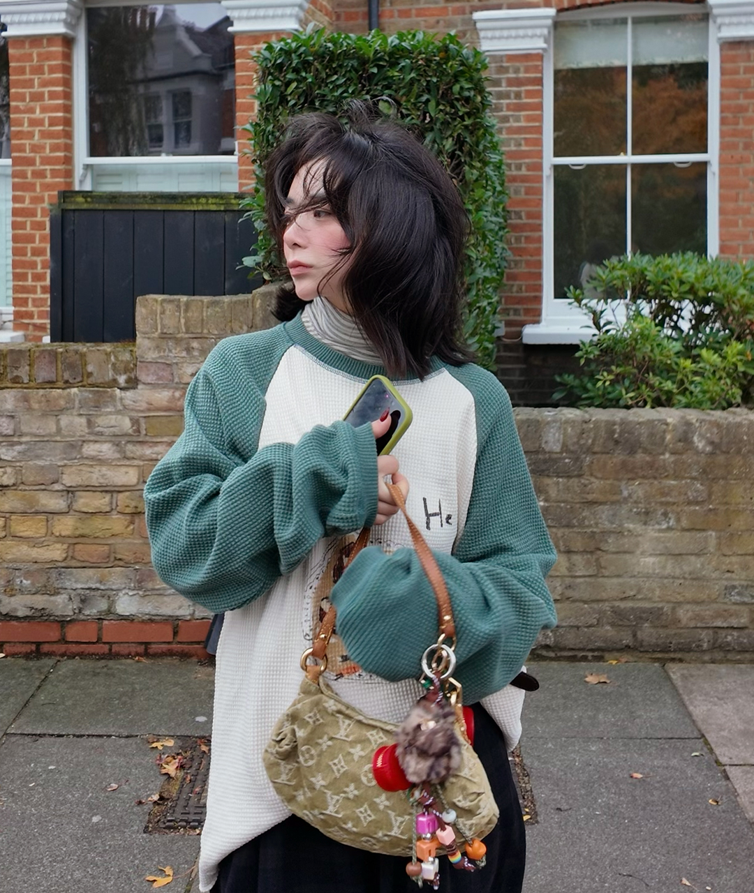 빈티지한 그린 톤의 배색 슬리브와 크림 컬러의 바디, 그리고 감각적인 프린팅이 He 특유의 감성을 담고 있습니다.