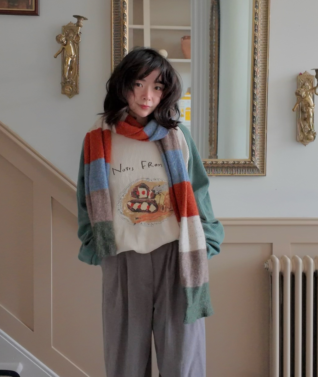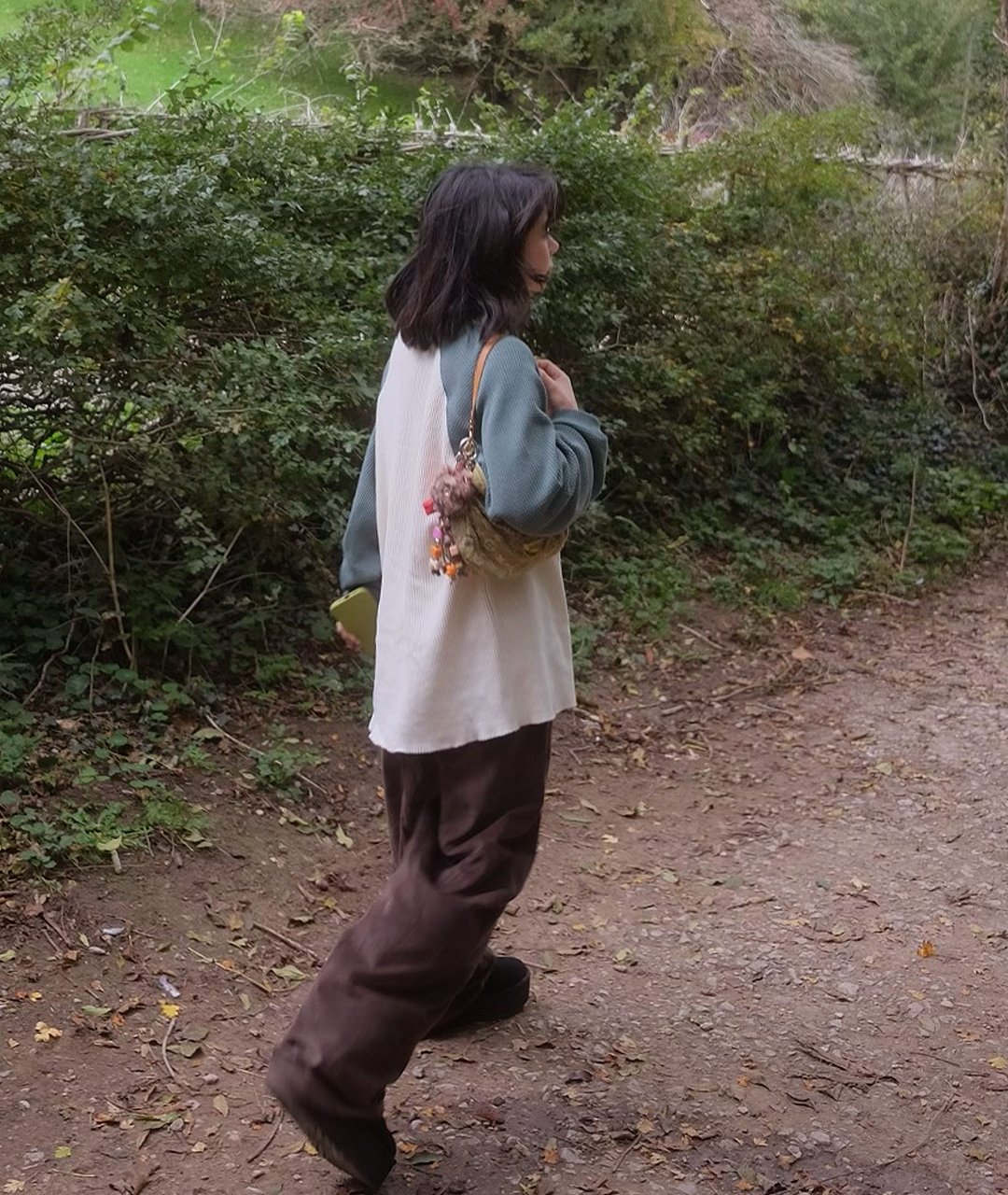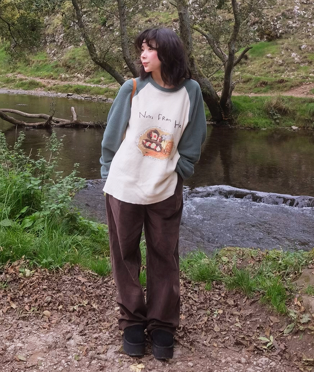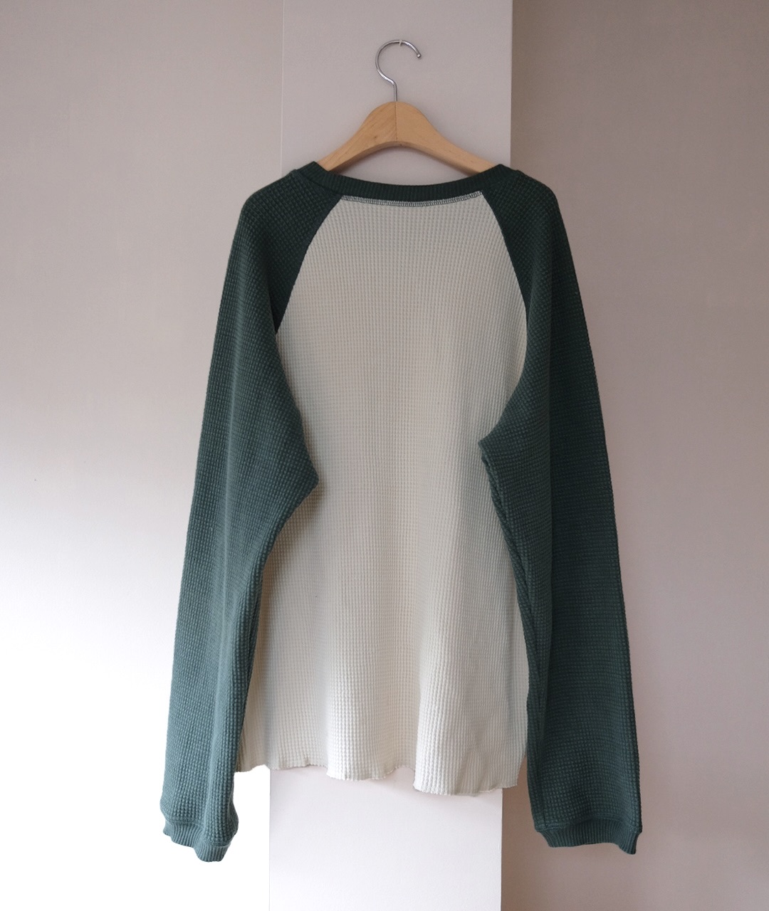 빈티지한 그린 톤의 배색 슬리브와 크림 컬러의 바디, 그리고 감각적인 프린팅이 He 특유의 감성을 담고 있습니다.
