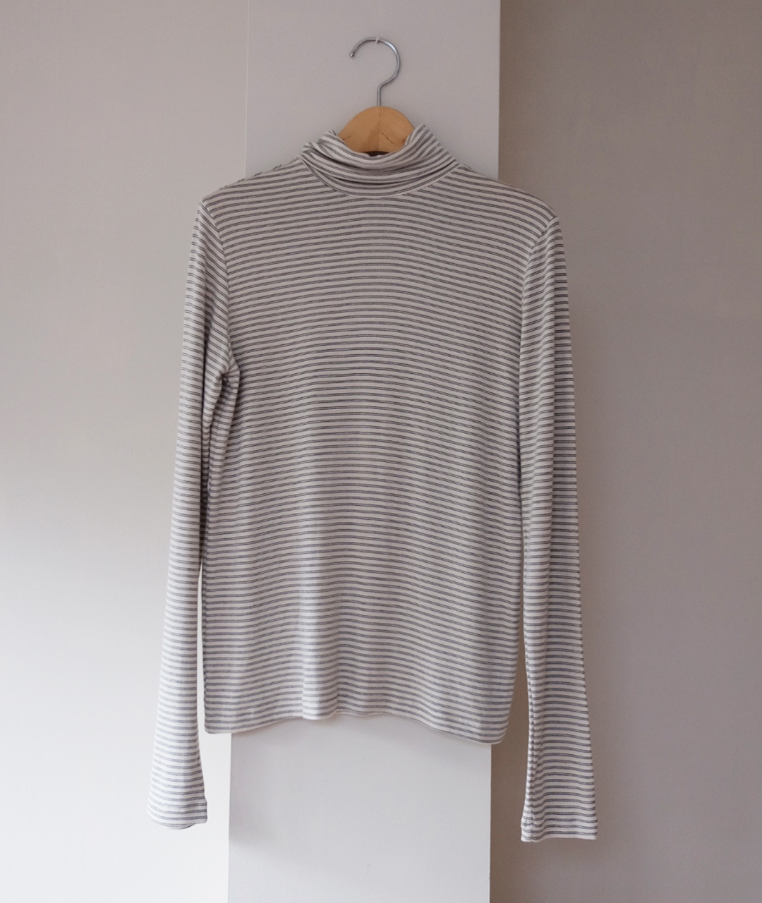 아이보리 바탕에 블랙 스트라이프 패턴이 들어간 기본 핏의 폴라 티셔츠입니다.