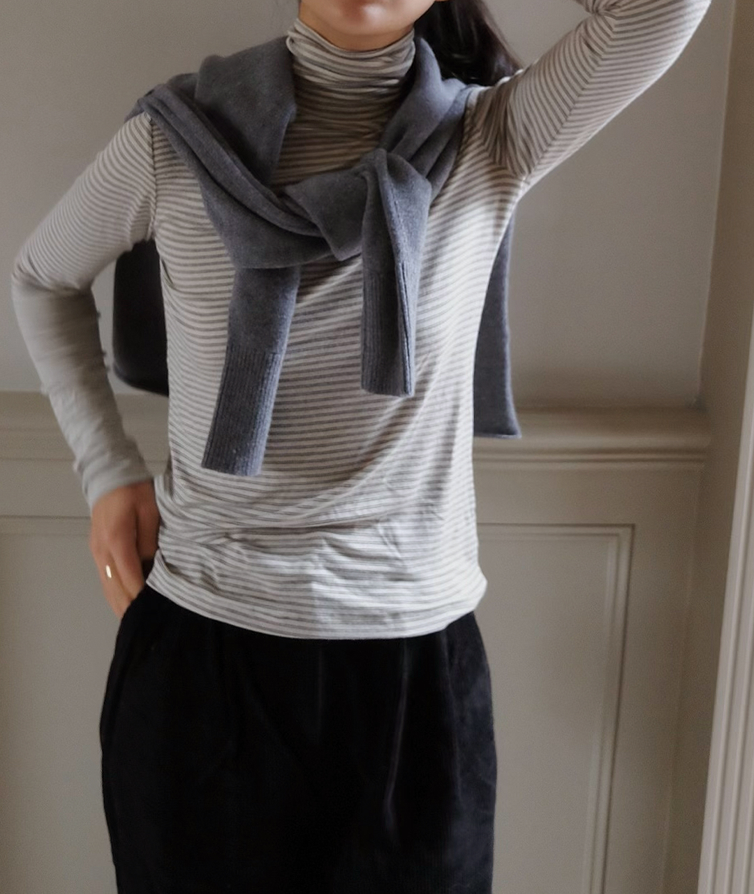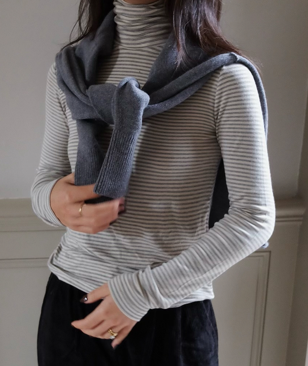 부드럽고 신축성 있는 소재로 겨울철 이너로 착용하기 좋으며, 스트라이프 패턴이 포인트가 되어 아늑한 겨울 코디를 완성해줍니다.