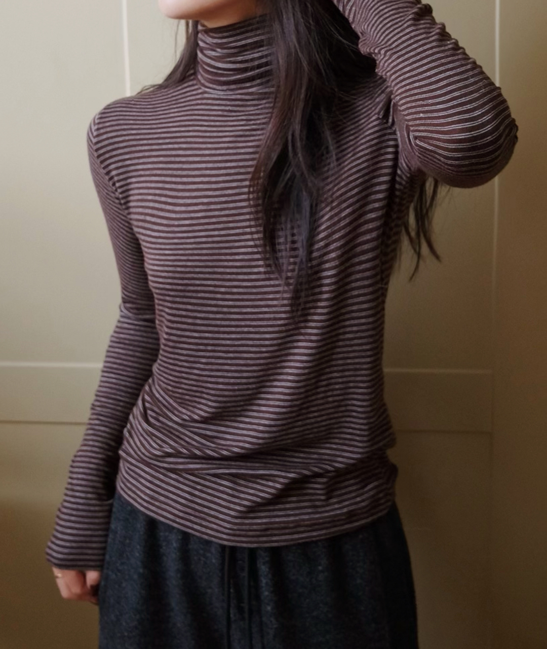 부드럽고 신축성 있는 소재로 겨울철 이너로 착용하기 좋으며, 스트라이프 패턴이 포인트가 되어 아늑한 겨울 코디를 완성해줍니다.